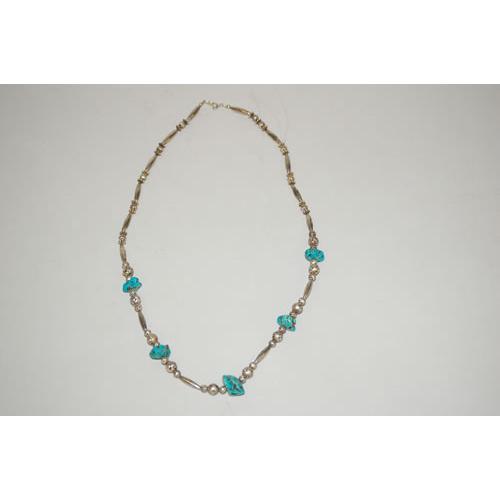 26" STERLING & TURQUOISE NECKLACE W/ 5 TURQUOISE<BR>NUGGETS, ROSE BLOSSOM DESIGN SILVER BEADS & LONG OVAL<BR>BEADS