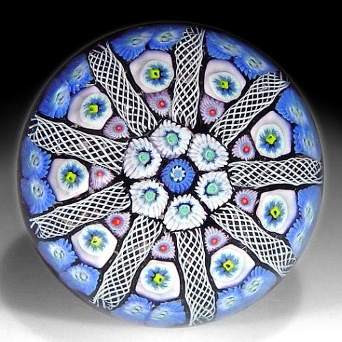 Strathearn cartwheel-design millefiori paperweight, with a central blue and white cane, encircled by a ring of white and blue canes, which are surrounded by radiating white latticinio rods, alternating with wedge-shaped panels of canes, on black ground. Diameter 2 1/2". NO RESERVE