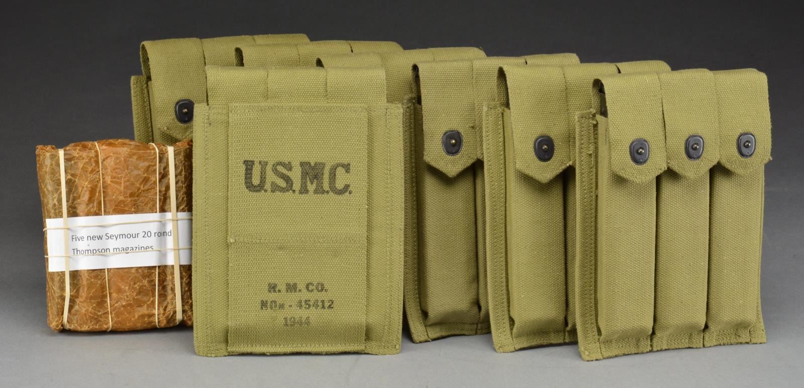 7 Green canvas pouches, each holding 3-30 rd. Thompson mags., Seymour mfg. Pouches are marked “U.S.M.C. / R. M. CO. / NOm – 45412 / 1944”. Mags. & pouches appear to be unissued though some mags. illustrate light use. Also included is 5 Seymour 20 rd. Thompson mags. which appear unissued in oil wrap. (02-14058/JZ). $900-1,400.