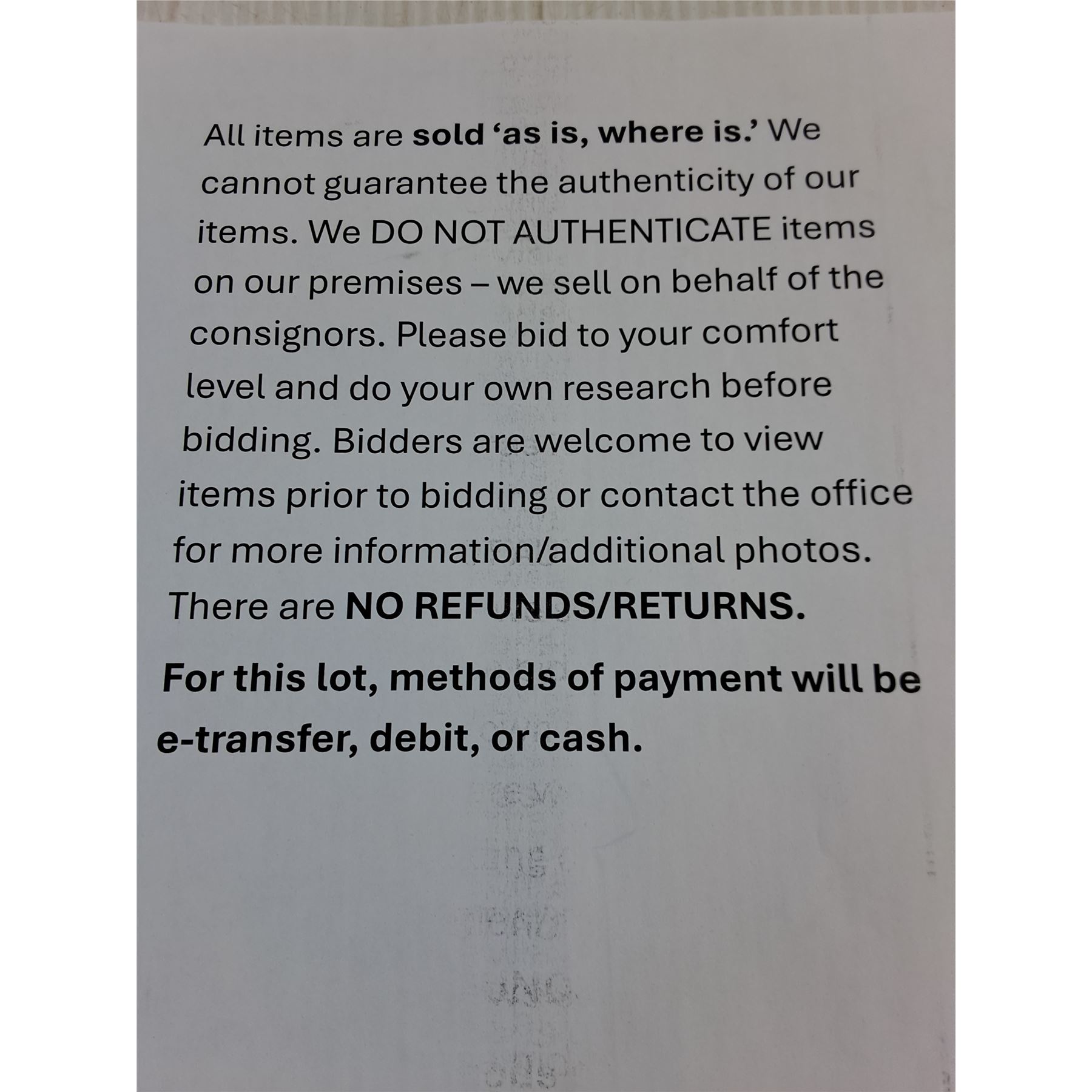 A online bidding premium may be applied to each lot purchased on the Internet. Federal GST and corresponding Provincial Sales Tax will apply to all purchases where applicable.