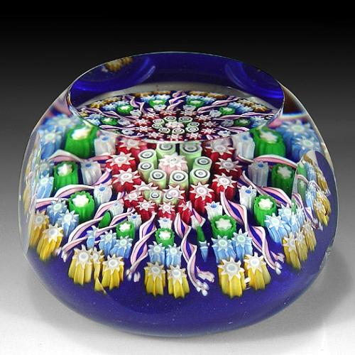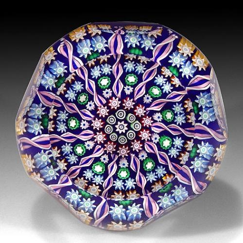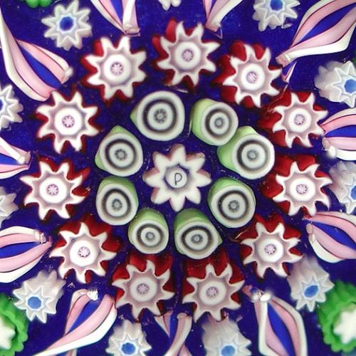 Perthshire Paperweights faceted patterned millefiori paperweight, with a central "P" signature cane, encircled by two rings of millefiori, and radiating twists, alternating with panels of canes, on cobalt blue ground. Five and one facets. Diameter 2 3/8". NO RESERVE