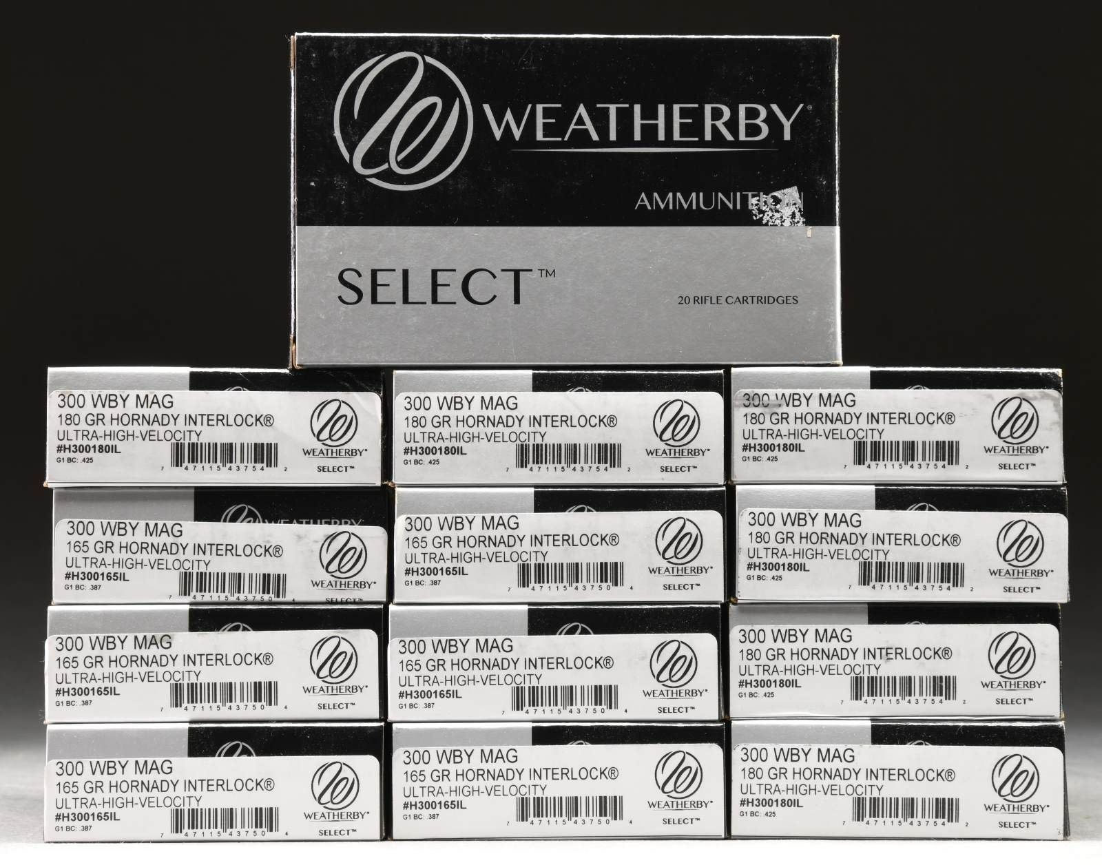 140 RDS. (7 BOXES) 180 gr. Hornady Interlock. 120 RDS. (6 BOXES) 165 gr. Hornady Interlock. CONDITION: boxes very good to near excellent; ammo appears serviceable. PROVENANCE: The Collection of Gun Sport Ltd owned by Jon R. Thomas. (02-20335/MD). $450-850.