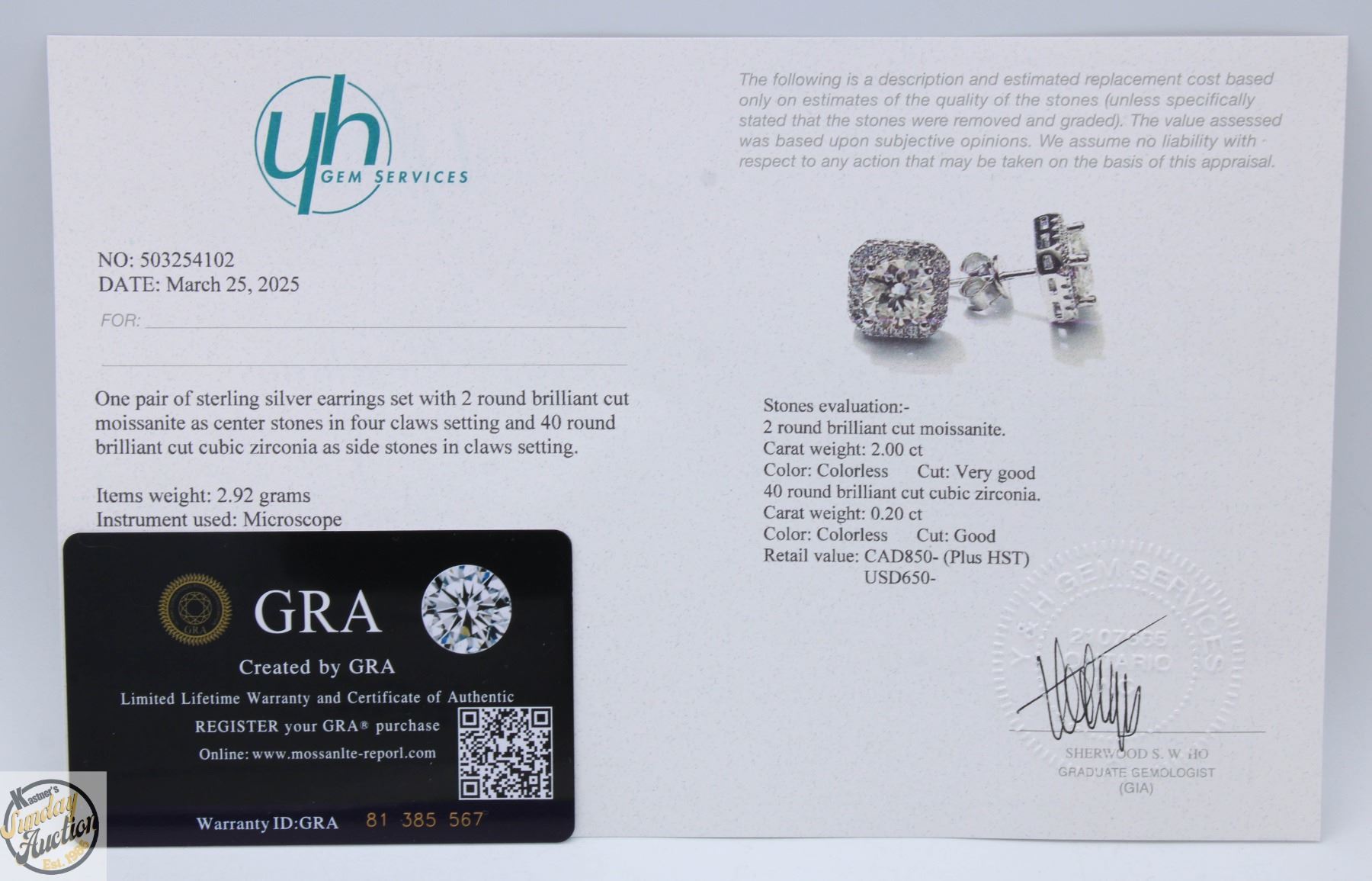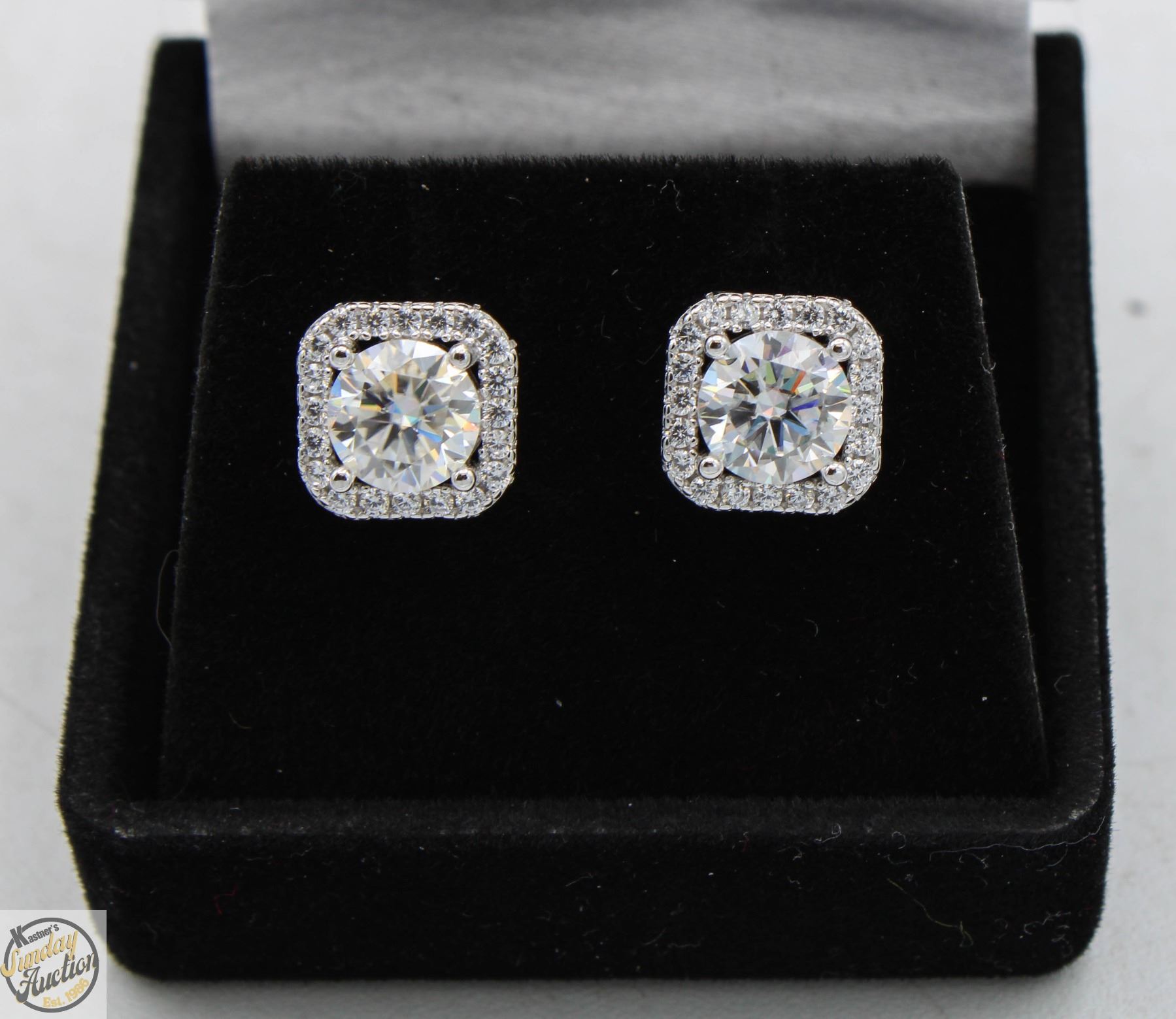 CUT MOISSANITE STONES VVS D COLOR WITH 40 ROUND BRILLIANT CUT CUBIC ZIRCONIA SET IN SQUARE HALOS SET IN 925 SILVER EARRINGS RETAIL VALUE $850.00 **ALL ITEMS MUST BE REMOVED BY 5PM SATURDAY, MAY 24TH 2025. ALL REMAINING ITEMS WILL BE SUBJECT TO A $6.00 PER DAY STORAGE CHARGE. ANY ITEMS REMAINING AFTER MONDAY, JUNE 9TH 2025 WILL BE CONSIDERED FORFEITED. NO REFUNDS WILL BE ISSUED FOR FORFEITED ITEMS. TO SCHEDULE A PICK UP APPOINTMENT CLICK HERE