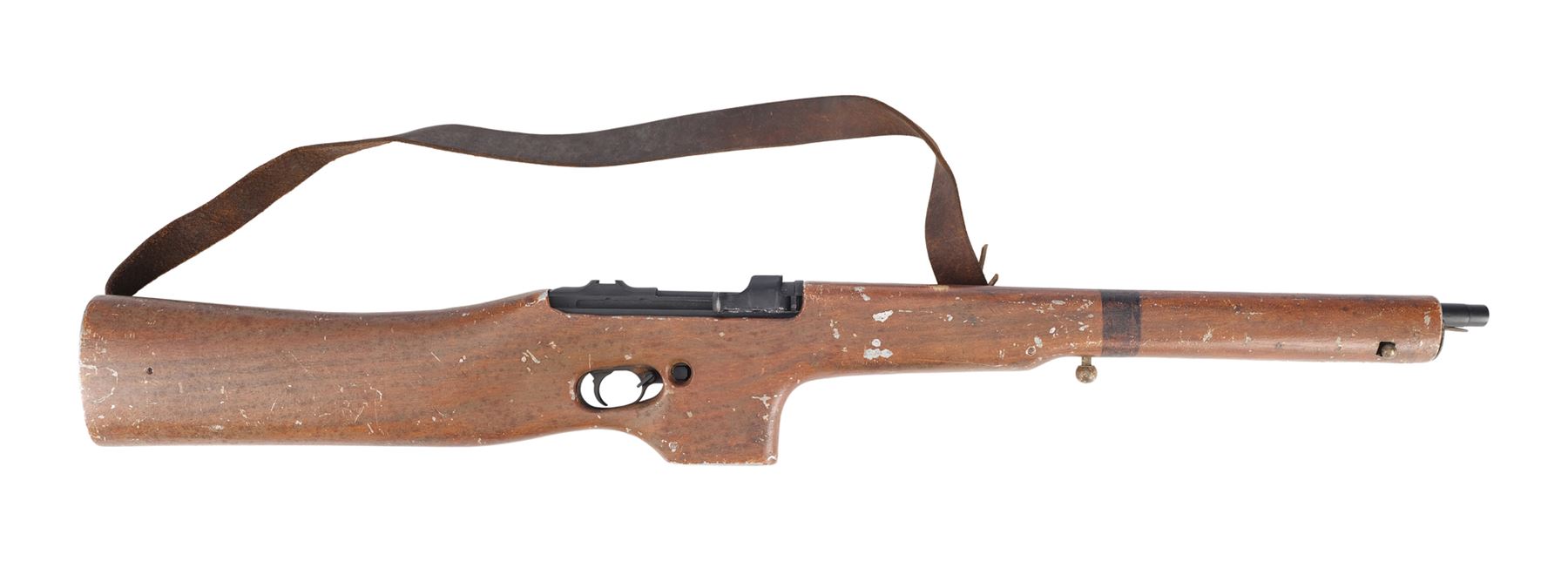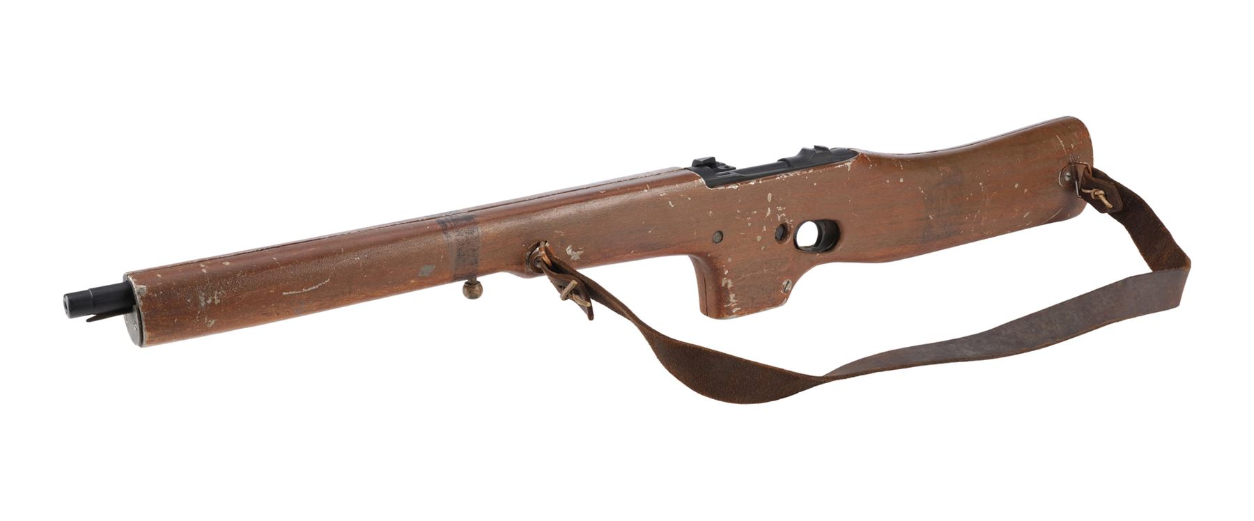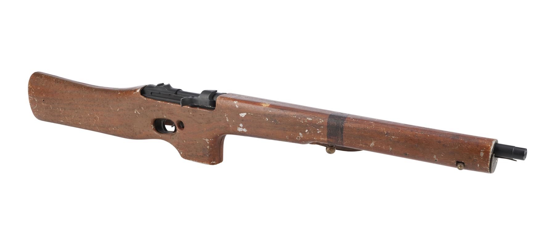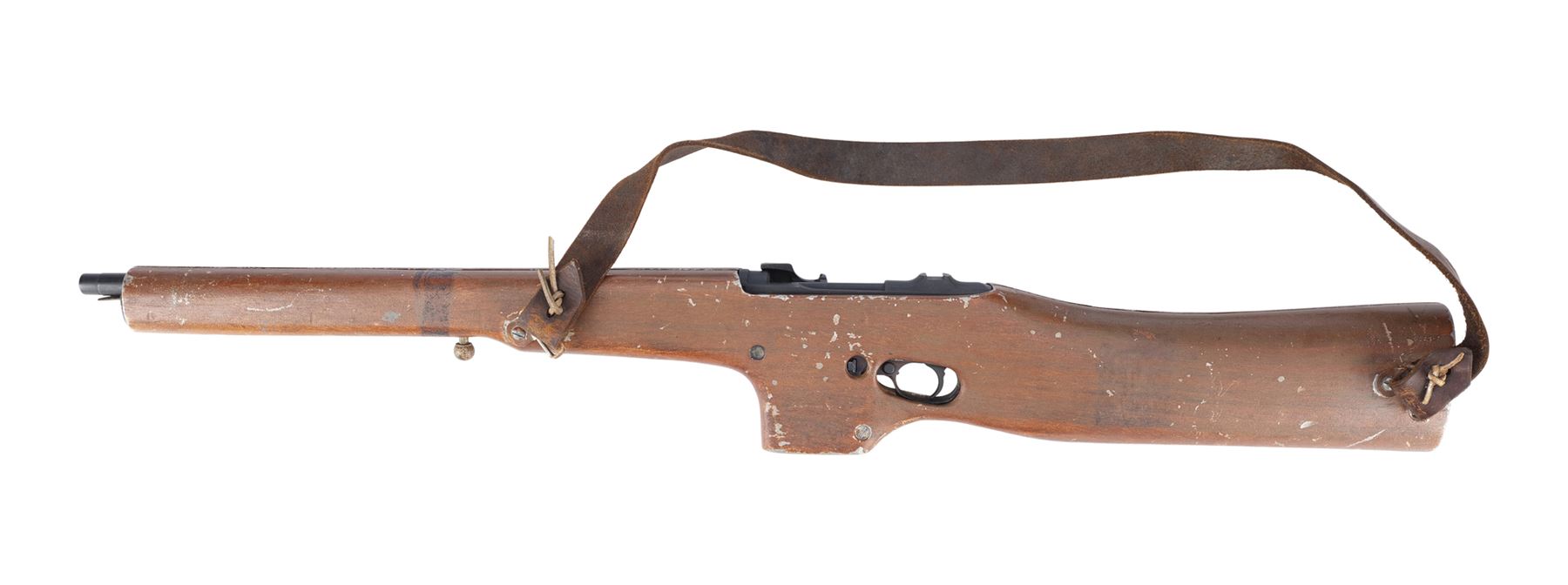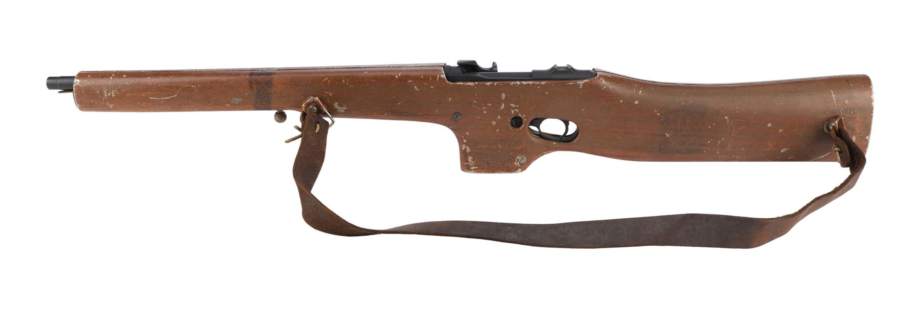 Based on World War II-era M1 carbines, this rifle consists of a two-piece metal shell painted brown to appear wooden around real firearm mechanisms that have had a barrel detail welded onto the base gun and deactivated; a loose slide, trigger, and an ejectable magazine, all painted black; and a brown leather strap with metal buckles. This weapon also features a retractable metal bayonet with the slide located beneath the barrel. The shell and strap are intentionally distressed by production to appear battle-used with scratches and grime applied throughout. The paint exhibits flaking, exposing metal components, and the bolts securing the shell's pieces were cut after production. Dimensions: 34" x 5" x 2" (86.5 cm x 12.75 cm x 5 cm)