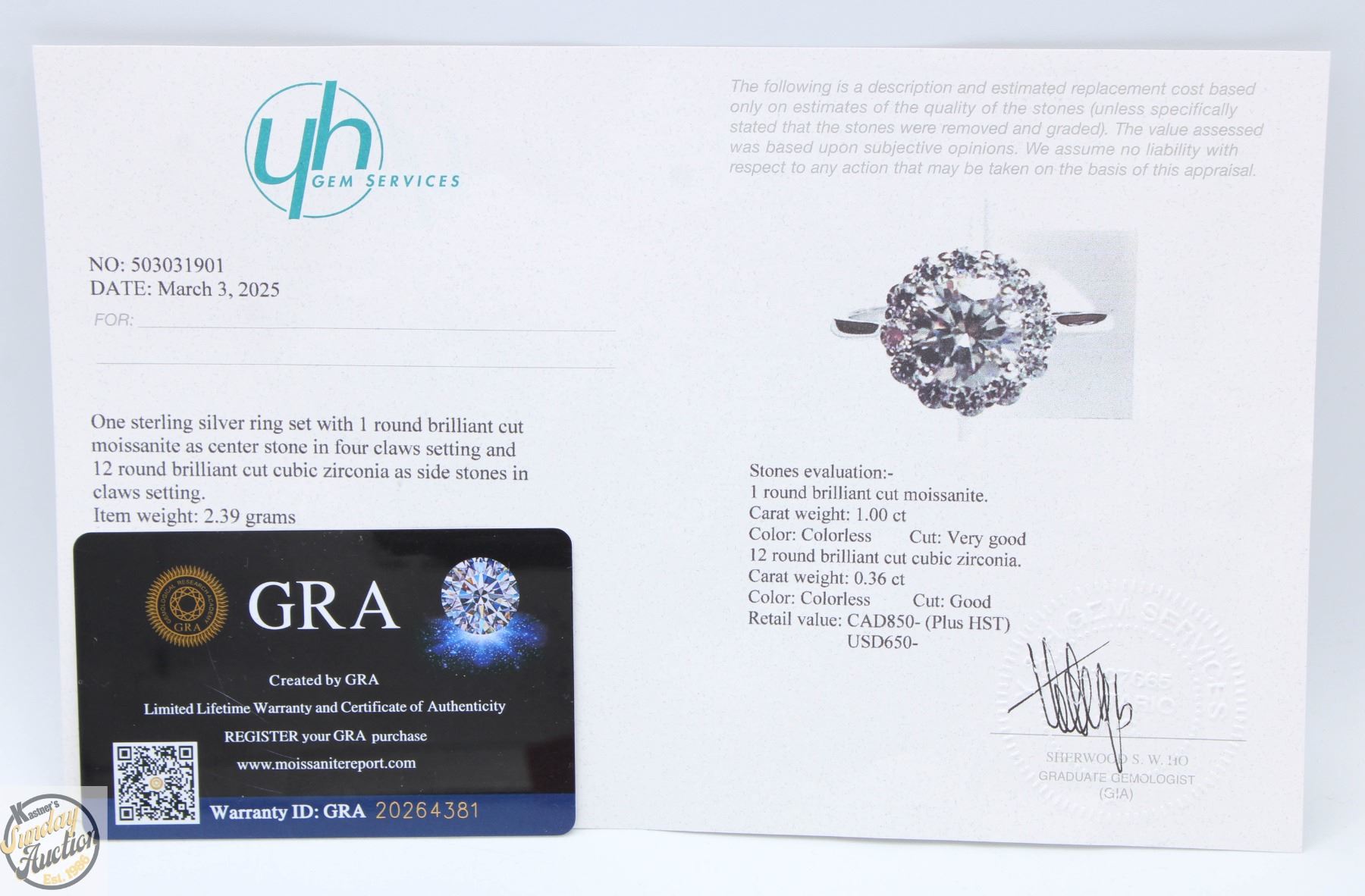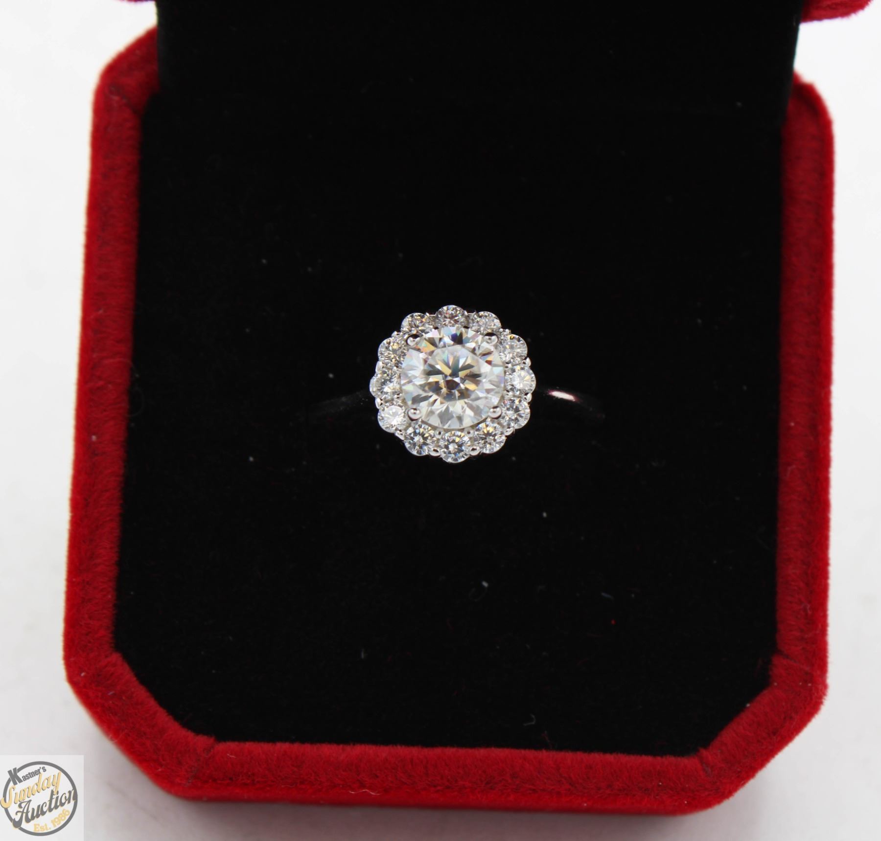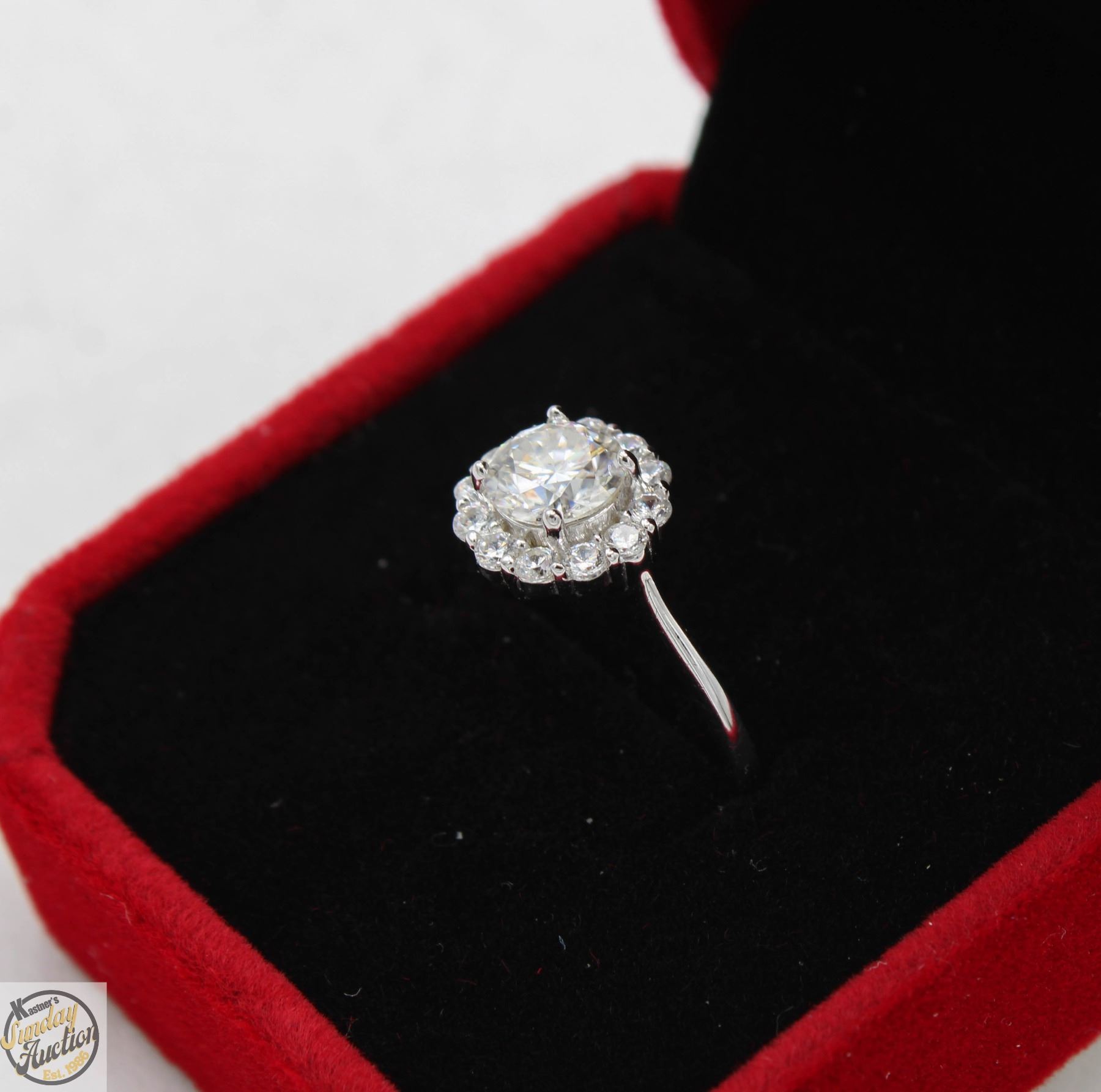 MOISSANITE STONE VVS D COLOR WITH 12 ROUND BRILLIANT CUT CUBIC ZIRCONIA SET IN ROUND HALO SET IN 925 SILVER RING SIZE ADJUSTABLE RETAIL VALUE $850.00 **ALL ITEMS MUST BE REMOVED BY 5PM SATURDAY, MAY 31ST 2025. ALL REMAINING ITEMS WILL BE SUBJECT TO A $6.00 PER DAY STORAGE CHARGE. ANY ITEMS REMAINING AFTER MONDAY, JUNE 16TH 2025 WILL BE CONSIDERED FORFEITED. NO REFUNDS WILL BE ISSUED FOR FORFEITED ITEMS. TO SCHEDULE A PICK UP APPOINTMENT CLICK HERE
