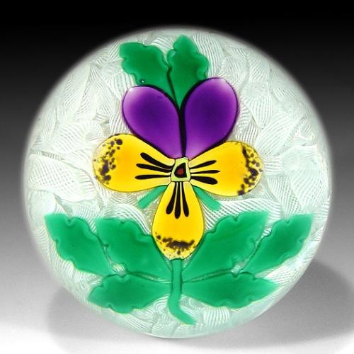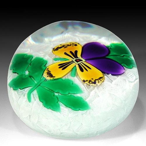 Perthshire Paperweights 2000 pansy paperweight, with a large purple and yellow pansy, green leaves, and stem, resting on white upset muslin. Signature/date cane. Limited edition of 200. Diameter 2 7/8". NO RESERVE