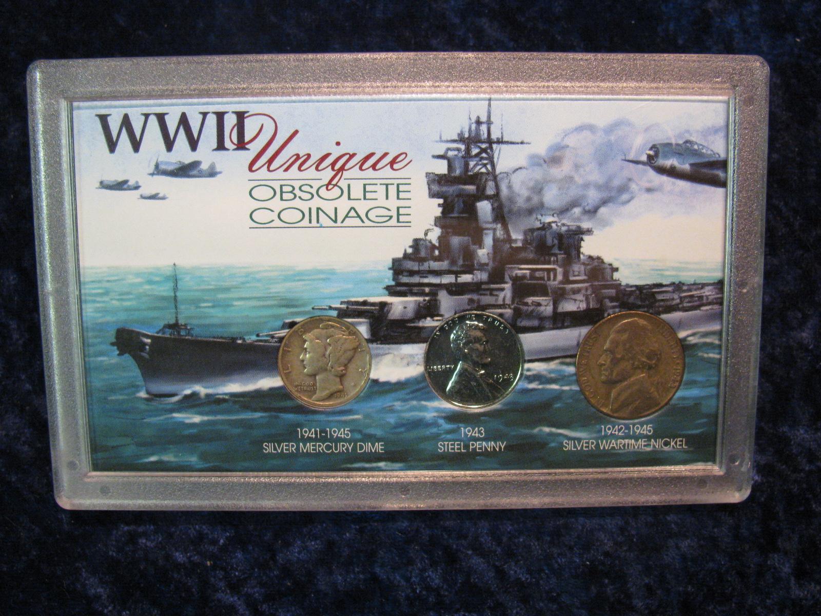 262. WW II Unique Obsolete Coinage Three Piece Set in holder. Includes a Silver Mercury Dime, Steel 1943 Cent, & a Silver War Nickel.