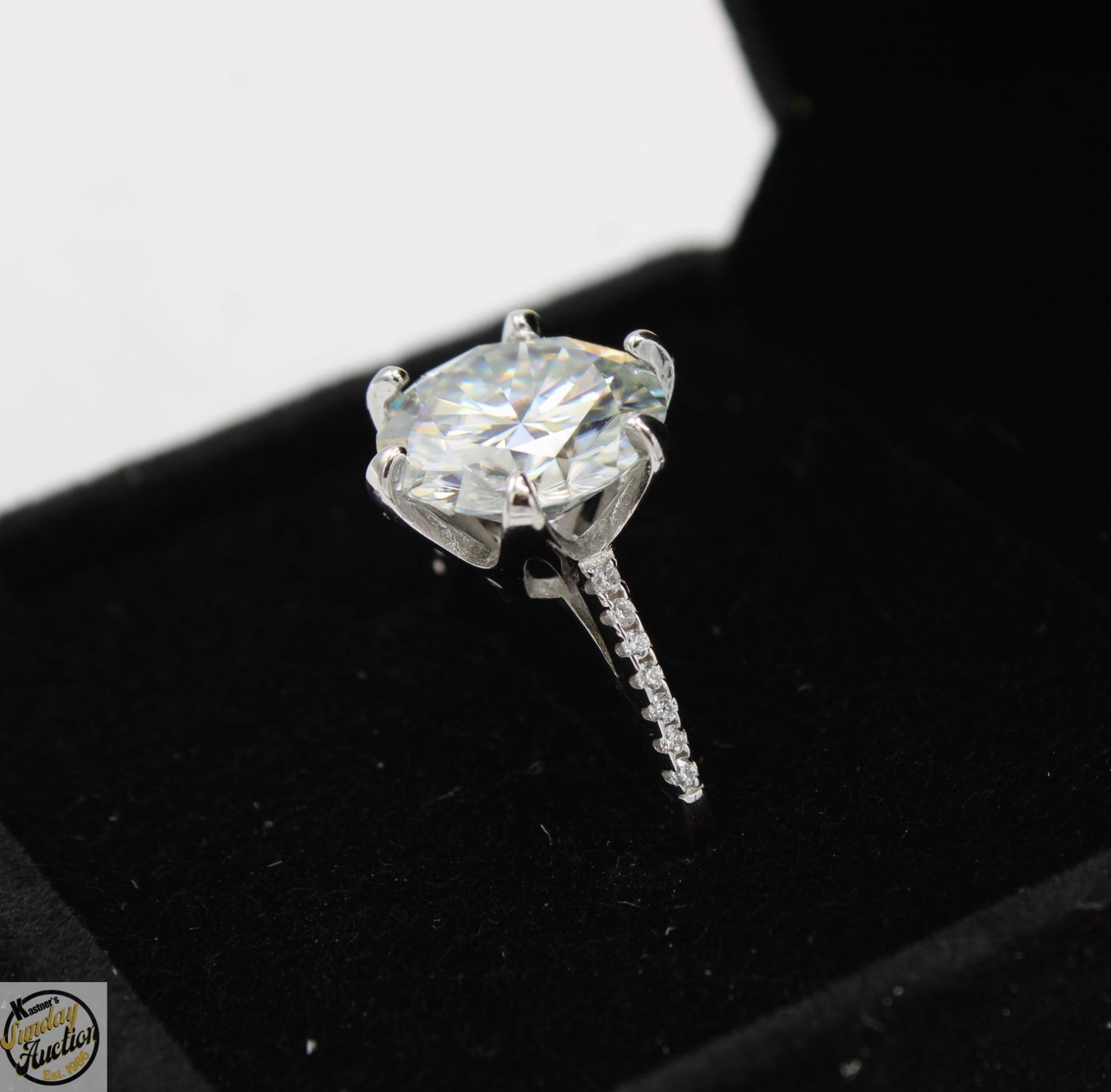MOISSANITE STONE VVS D COLOR SET IN CENTER WITH 14 ROUND BRILLIANT CUT CUBIC ZIRCONIA AND SET IN 925 SILVER RING SIZE 6 RETAIL VALUE $1,450.00 **ALL ITEMS MUST BE REMOVED BY 5PM SATURDAY, MAY 31ST 2025. ALL REMAINING ITEMS WILL BE SUBJECT TO A $6.00 PER DAY STORAGE CHARGE. ANY ITEMS REMAINING AFTER MONDAY, JUNE 16TH 2025 WILL BE CONSIDERED FORFEITED. NO REFUNDS WILL BE ISSUED FOR FORFEITED ITEMS. TO SCHEDULE A PICK UP APPOINTMENT CLICK HERE