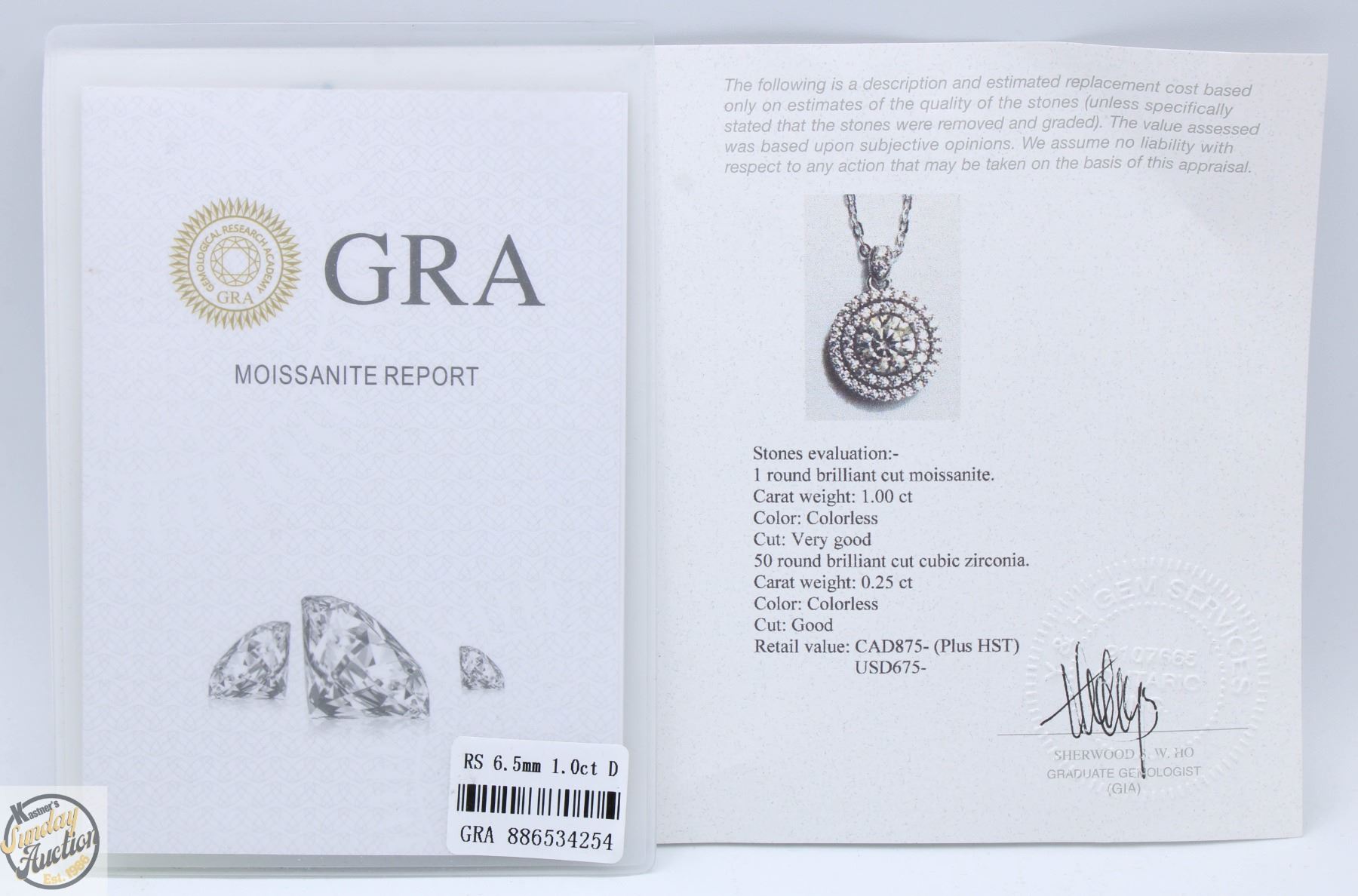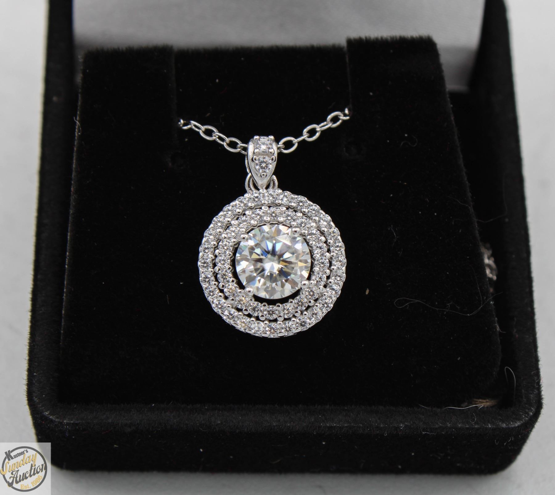 MOISSANITE STONE VVS D COLOR WITH 50 ROUND BRILLIANT CUT CUBIC ZIRCONIA SET DUAL HALOS AROUND CENTER WITH SOME IN BALE SET IN 925 SILVER PENDANT RETAIL VALUE $875.00 **ALL ITEMS MUST BE REMOVED BY 5PM SATURDAY, MAY 31ST 2025. ALL REMAINING ITEMS WILL BE SUBJECT TO A $6.00 PER DAY STORAGE CHARGE. ANY ITEMS REMAINING AFTER MONDAY, JUNE 16TH 2025 WILL BE CONSIDERED FORFEITED. NO REFUNDS WILL BE ISSUED FOR FORFEITED ITEMS. TO SCHEDULE A PICK UP APPOINTMENT CLICK HERE