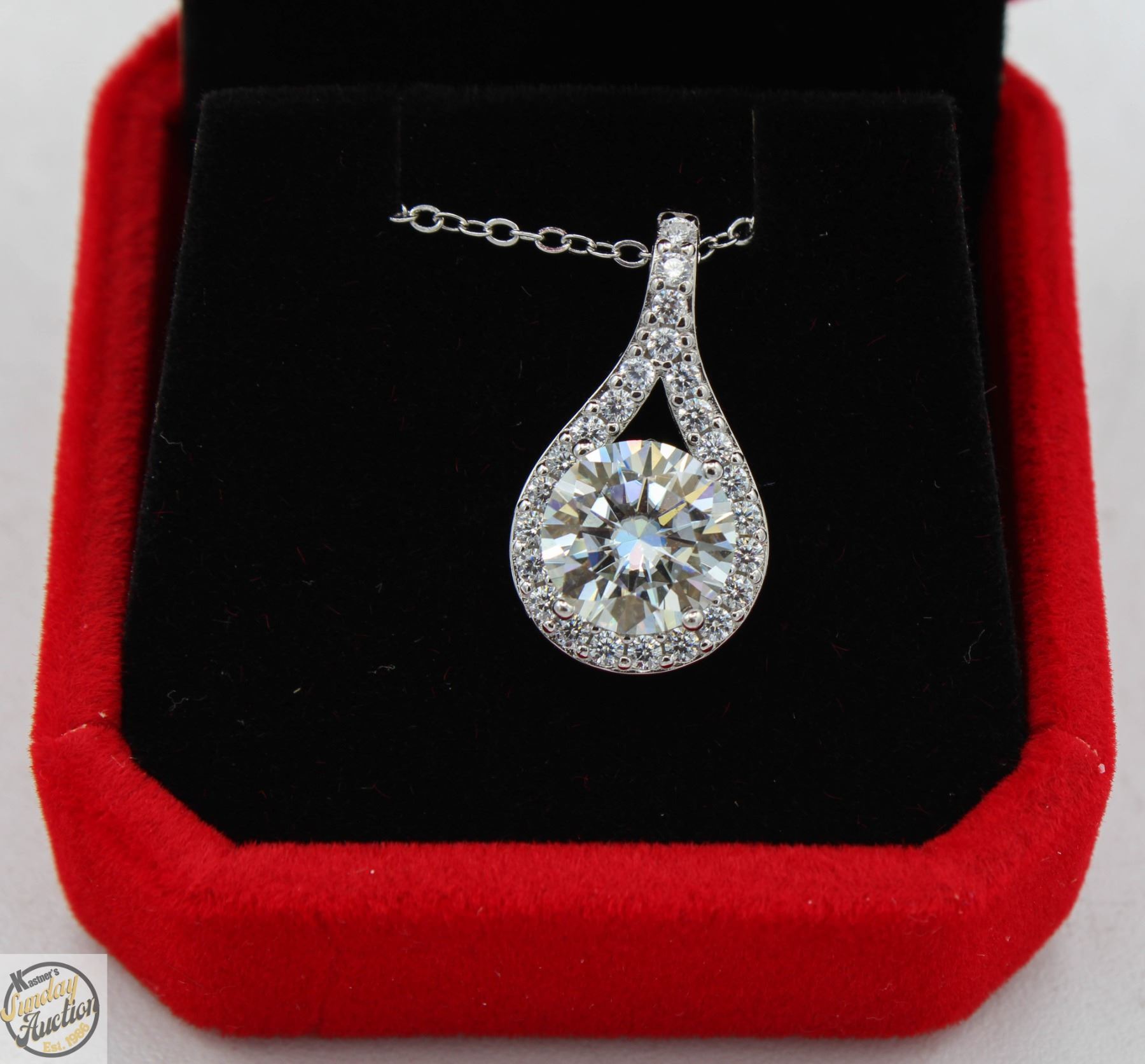 MOISSANITE STONE VVS D COLOR WITH 24 ROUND BRILLIANT CUT CUBIC ZIRCONIA SET IN TEAR DROP HALO SET IN 925 SILVER PENDANT RETAIL VALUE $1,375.00 **ALL ITEMS MUST BE REMOVED BY 5PM SATURDAY, MAY 31ST 2025. ALL REMAINING ITEMS WILL BE SUBJECT TO A $6.00 PER DAY STORAGE CHARGE. ANY ITEMS REMAINING AFTER MONDAY, JUNE 16TH 2025 WILL BE CONSIDERED FORFEITED. NO REFUNDS WILL BE ISSUED FOR FORFEITED ITEMS. TO SCHEDULE A PICK UP APPOINTMENT CLICK HERE