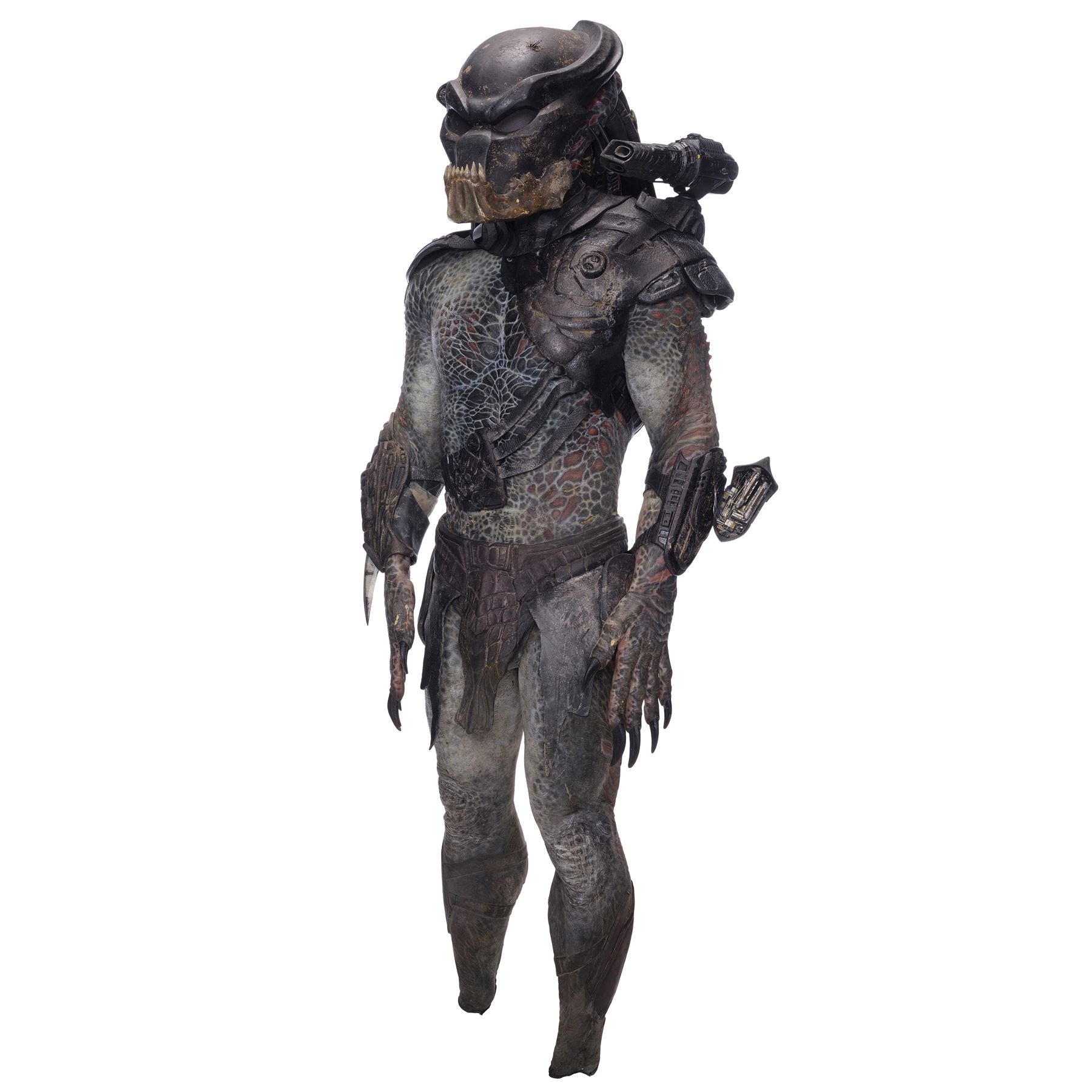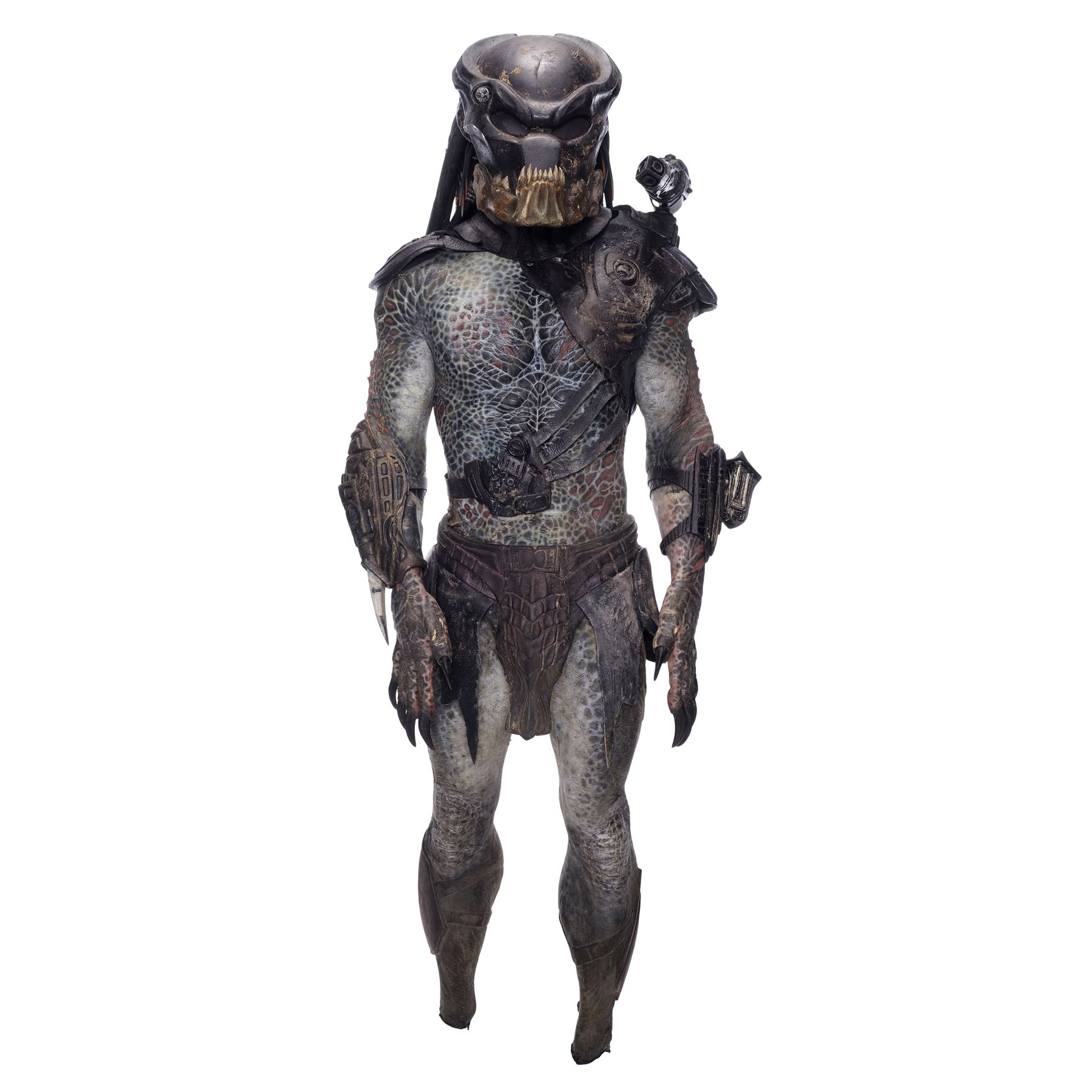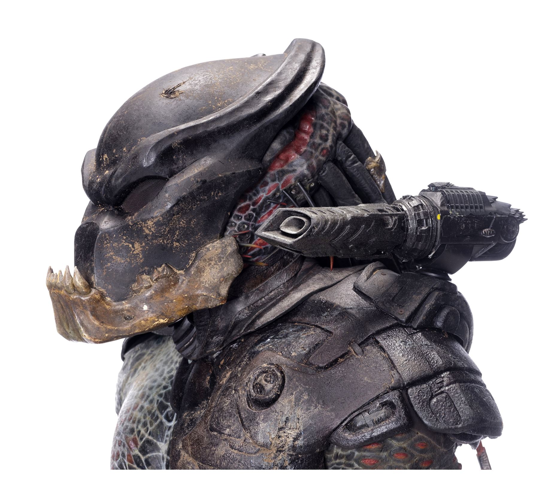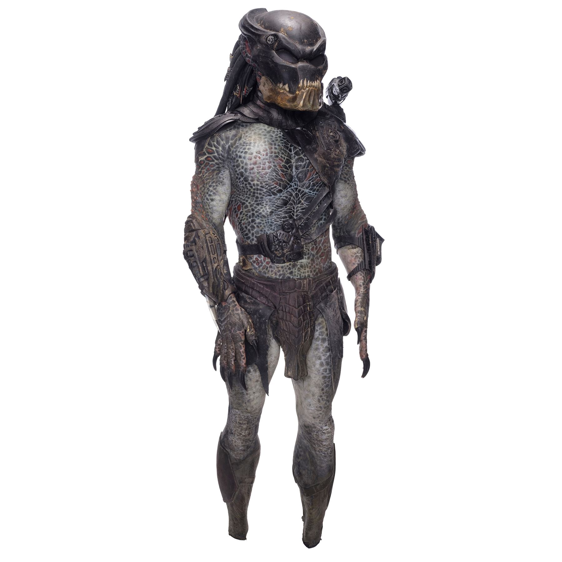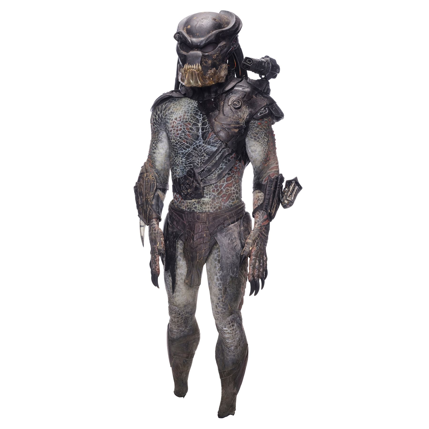 This costume consists of a foam latex bodysuit painted in a speckled pattern of black, red, white, and yellow; matching hands tipped with resin claws; a foam-latex headdress featuring an array of foam locs; and a helmet constructed from hard rubber, with an internal fiberglass layer, internal padding, clear lenses, and decorations resembling metal and bone secured via fastening strips to the scalp. Also decorating the suit are hard rubber chest, thigh, and shoulder armor secured with leather straps and several leather cloths; left and right bracers, the right featuring a resin blade and the left featuring an electronic communications unit; a neoprene and rubber collar; a slip-latex loincloth hiding a zipper; and a primarily-resin electronic plasmacaster, the creature's signature weapon. This costume was modified on the right pectoral and knee to cover the green-blooded wounds inflicted during the film's final battle. This lot exhibits cracking and peeling material throughout.