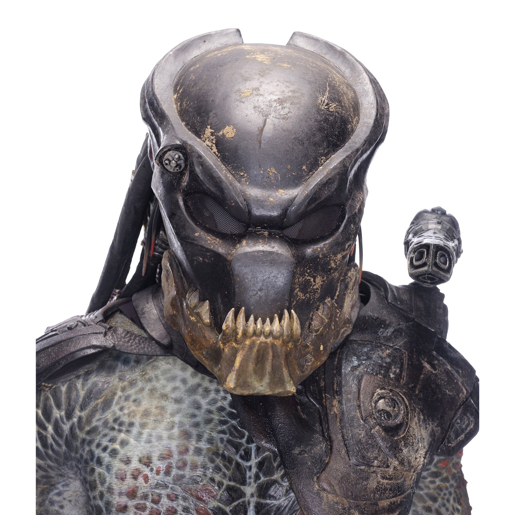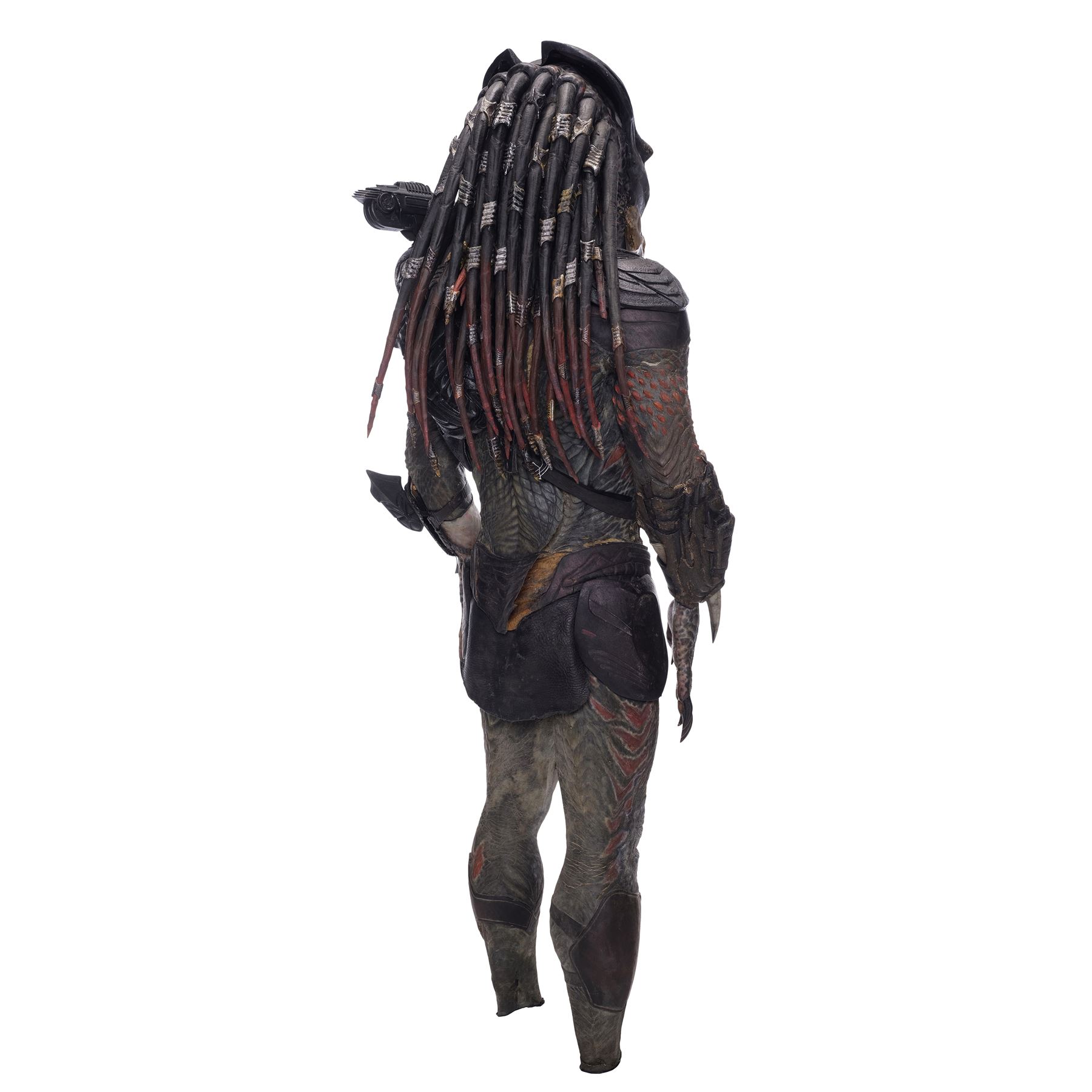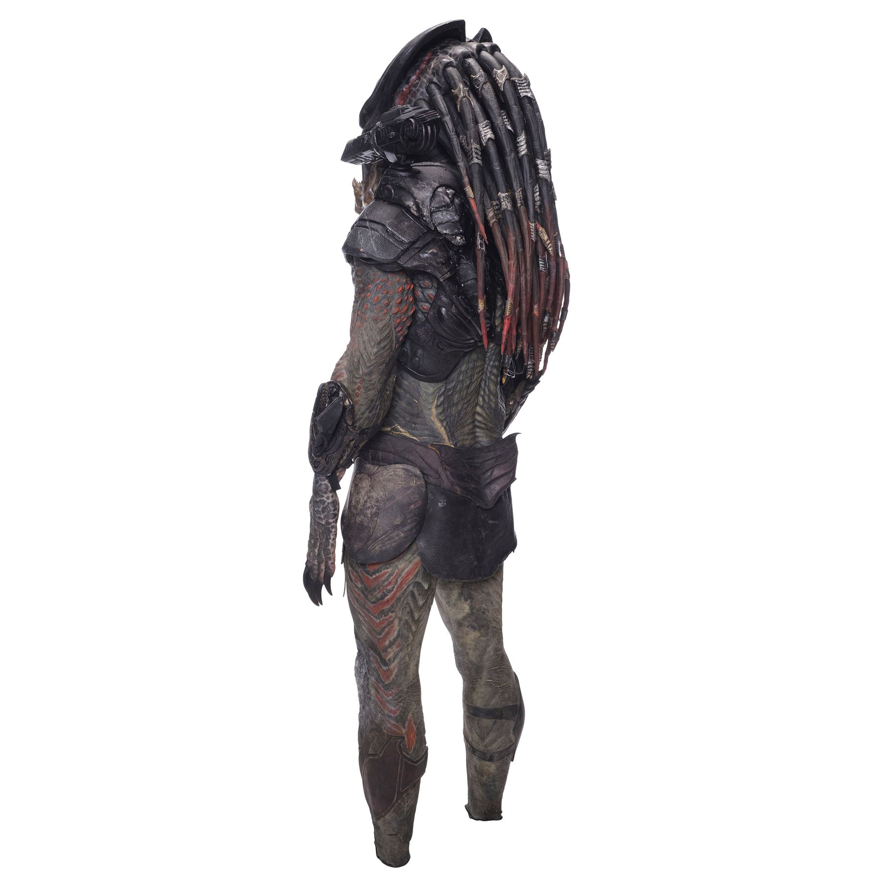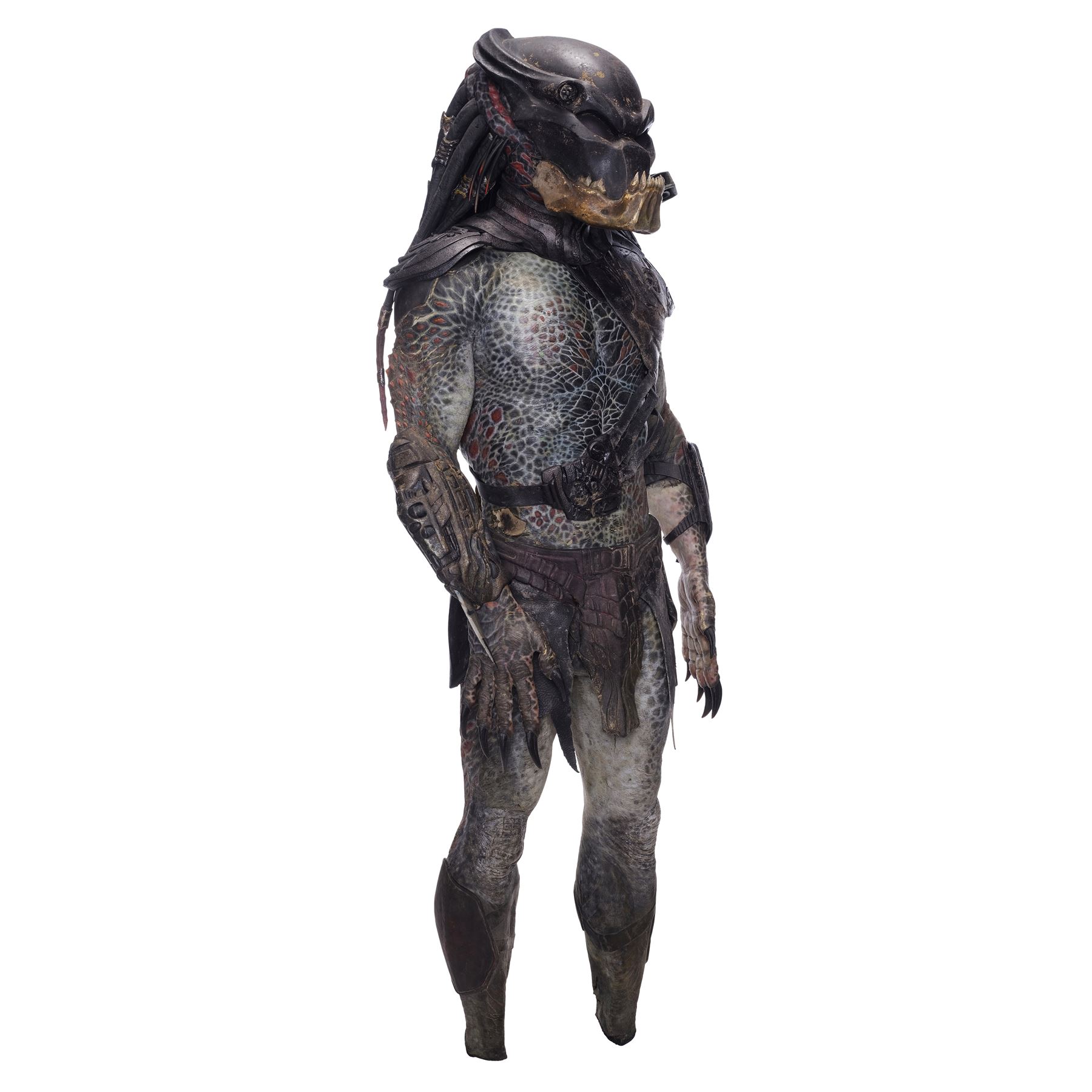 This costume consists of a foam latex bodysuit painted in a speckled pattern of black, red, white, and yellow; matching hands tipped with resin claws; a foam-latex headdress featuring an array of foam locs; and a helmet constructed from hard rubber, with an internal fiberglass layer, internal padding, clear lenses, and decorations resembling metal and bone secured via fastening strips to the scalp. Also decorating the suit are hard rubber chest, thigh, and shoulder armor secured with leather straps and several leather cloths; left and right bracers, the right featuring a resin blade and the left featuring an electronic communications unit; a neoprene and rubber collar; a slip-latex loincloth hiding a zipper; and a primarily-resin electronic plasmacaster, the creature's signature weapon. This costume was modified on the right pectoral and knee to cover the green-blooded wounds inflicted during the film's final battle. This lot exhibits cracking and peeling material throughout.