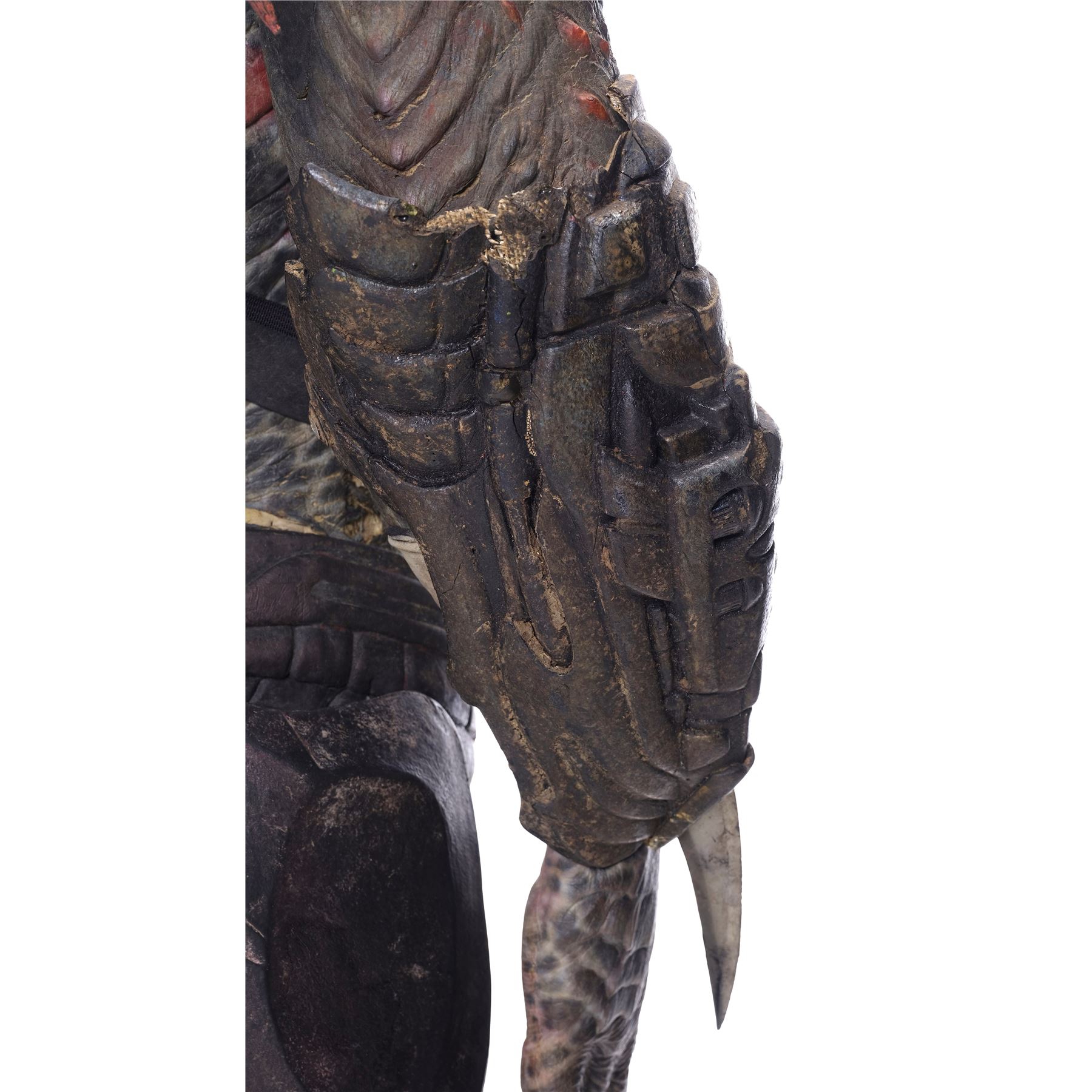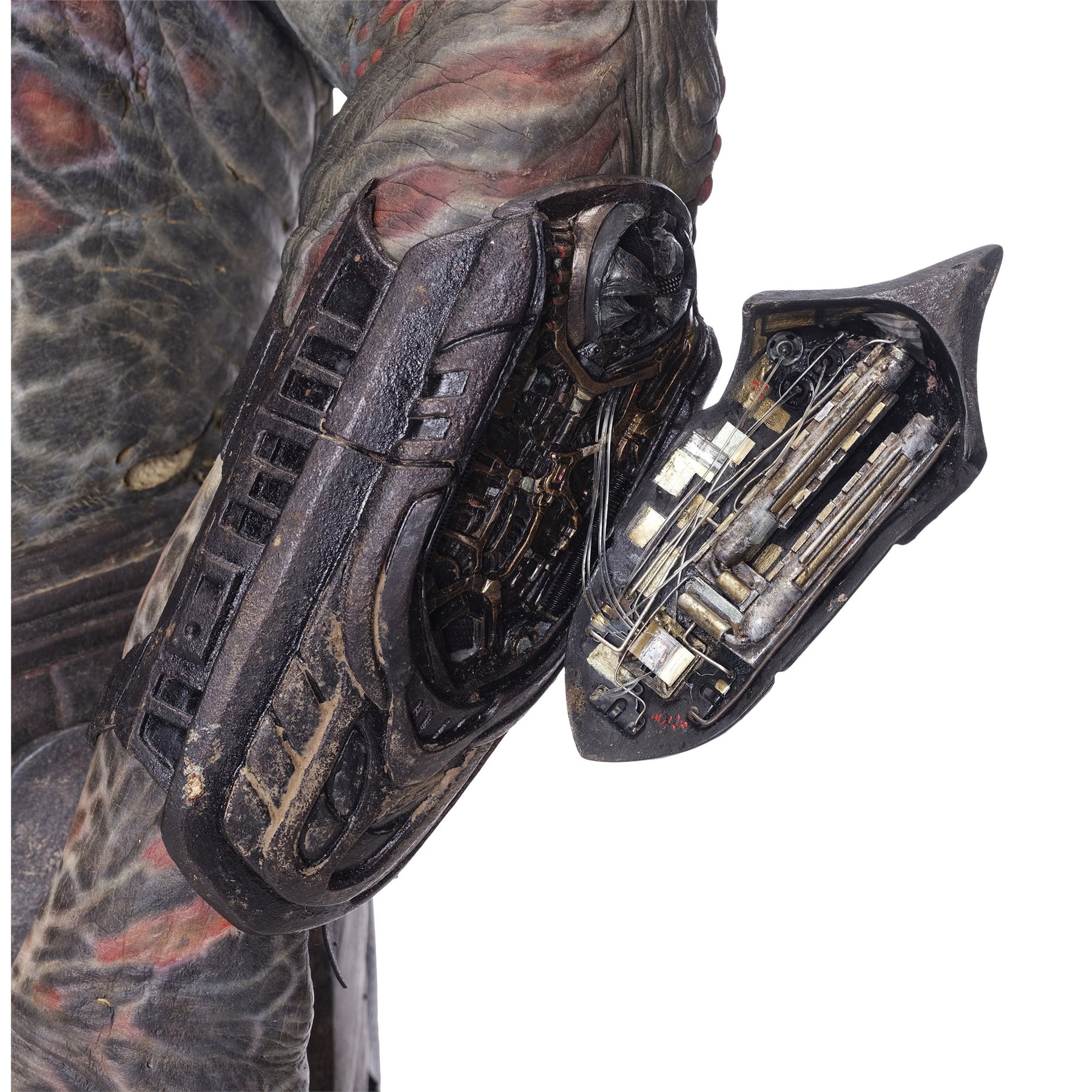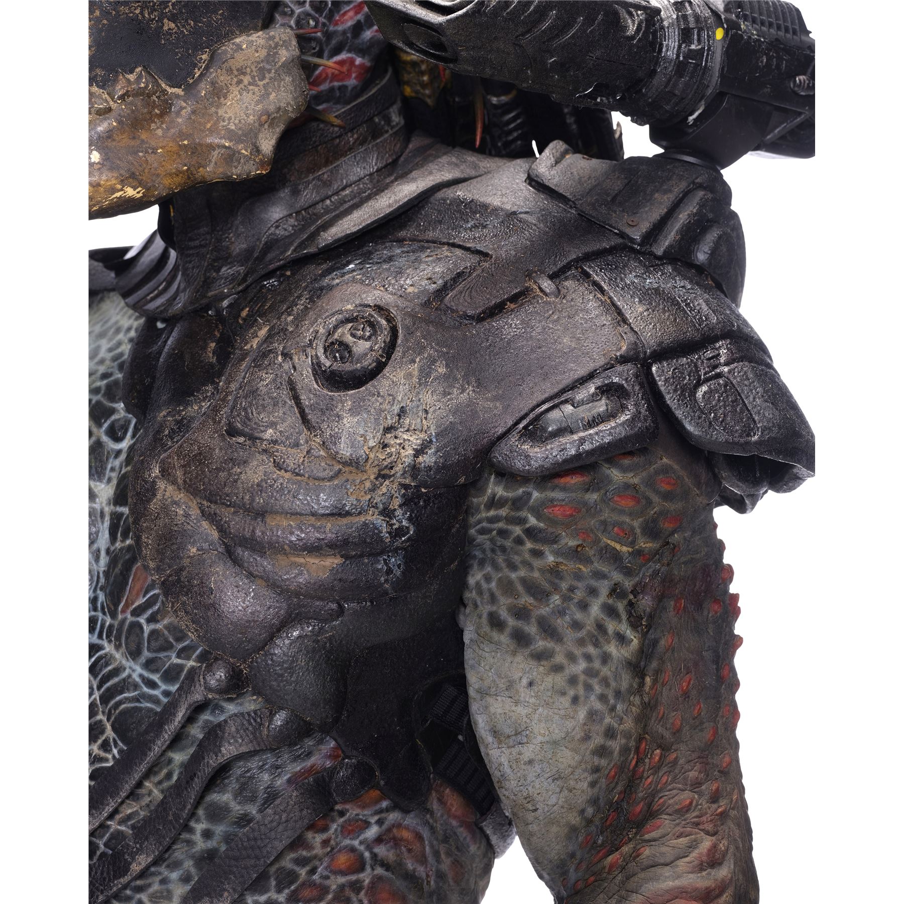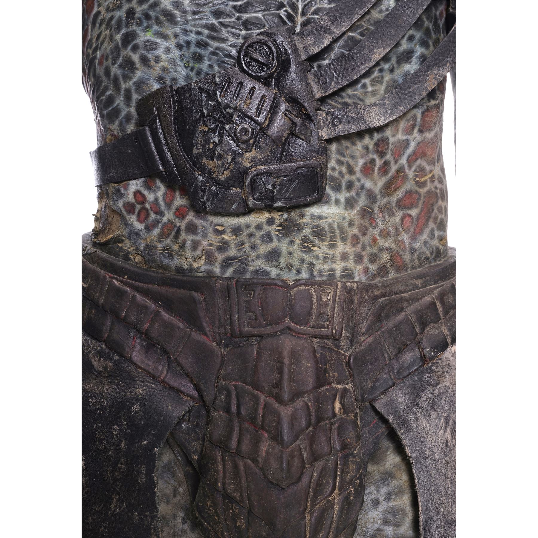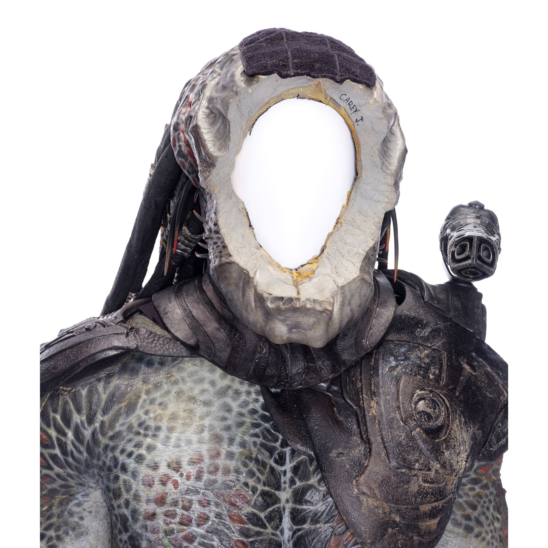 This costume consists of a foam latex bodysuit painted in a speckled pattern of black, red, white, and yellow; matching hands tipped with resin claws; a foam-latex headdress featuring an array of foam locs; and a helmet constructed from hard rubber, with an internal fiberglass layer, internal padding, clear lenses, and decorations resembling metal and bone secured via fastening strips to the scalp. Also decorating the suit are hard rubber chest, thigh, and shoulder armor secured with leather straps and several leather cloths; left and right bracers, the right featuring a resin blade and the left featuring an electronic communications unit; a neoprene and rubber collar; a slip-latex loincloth hiding a zipper; and a primarily-resin electronic plasmacaster, the creature's signature weapon. This costume was modified on the right pectoral and knee to cover the green-blooded wounds inflicted during the film's final battle. This lot exhibits cracking and peeling material throughout.