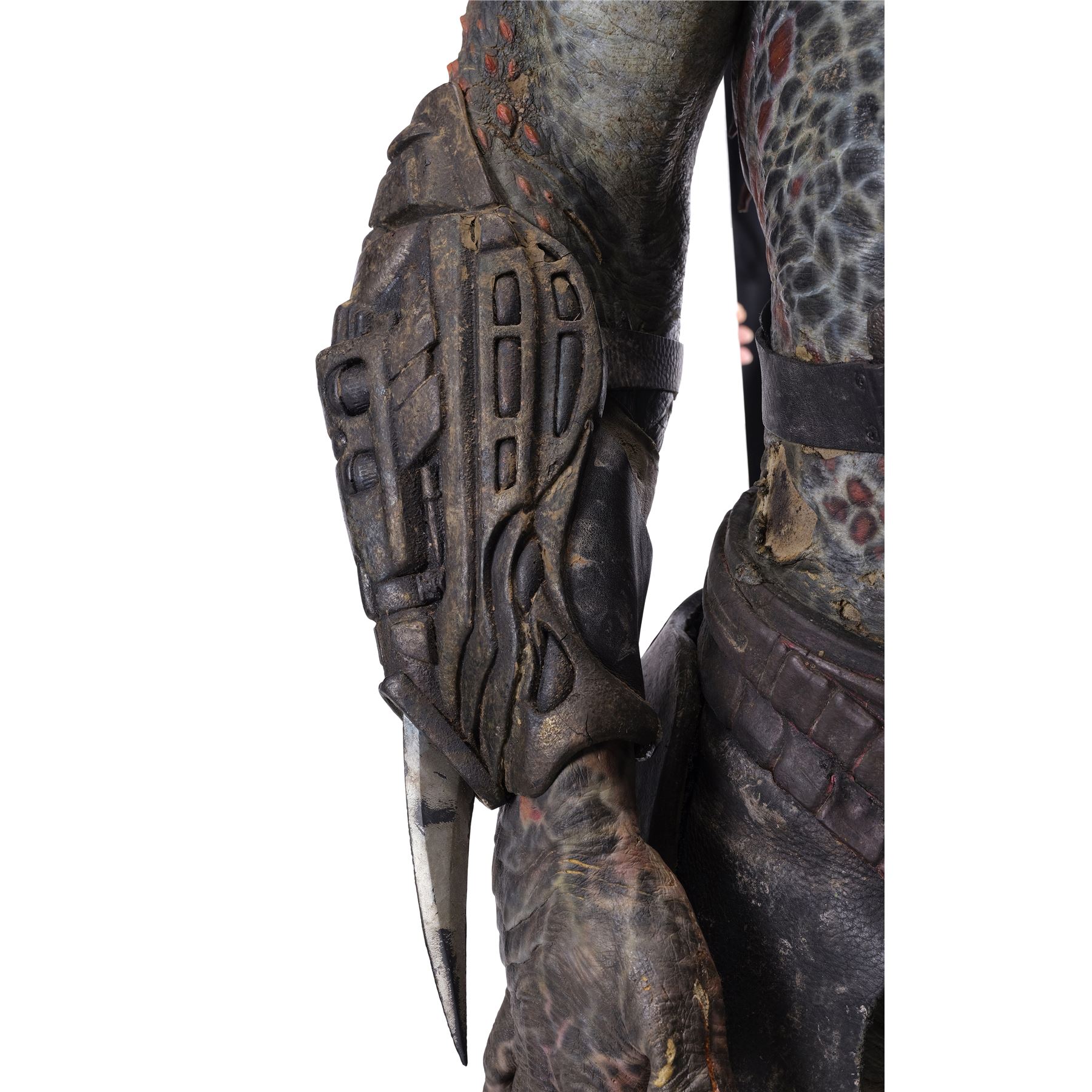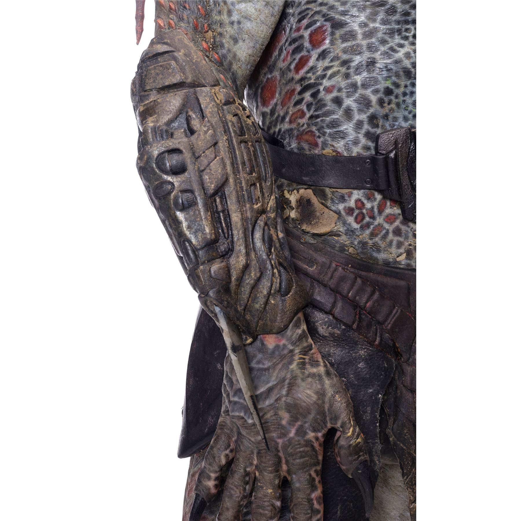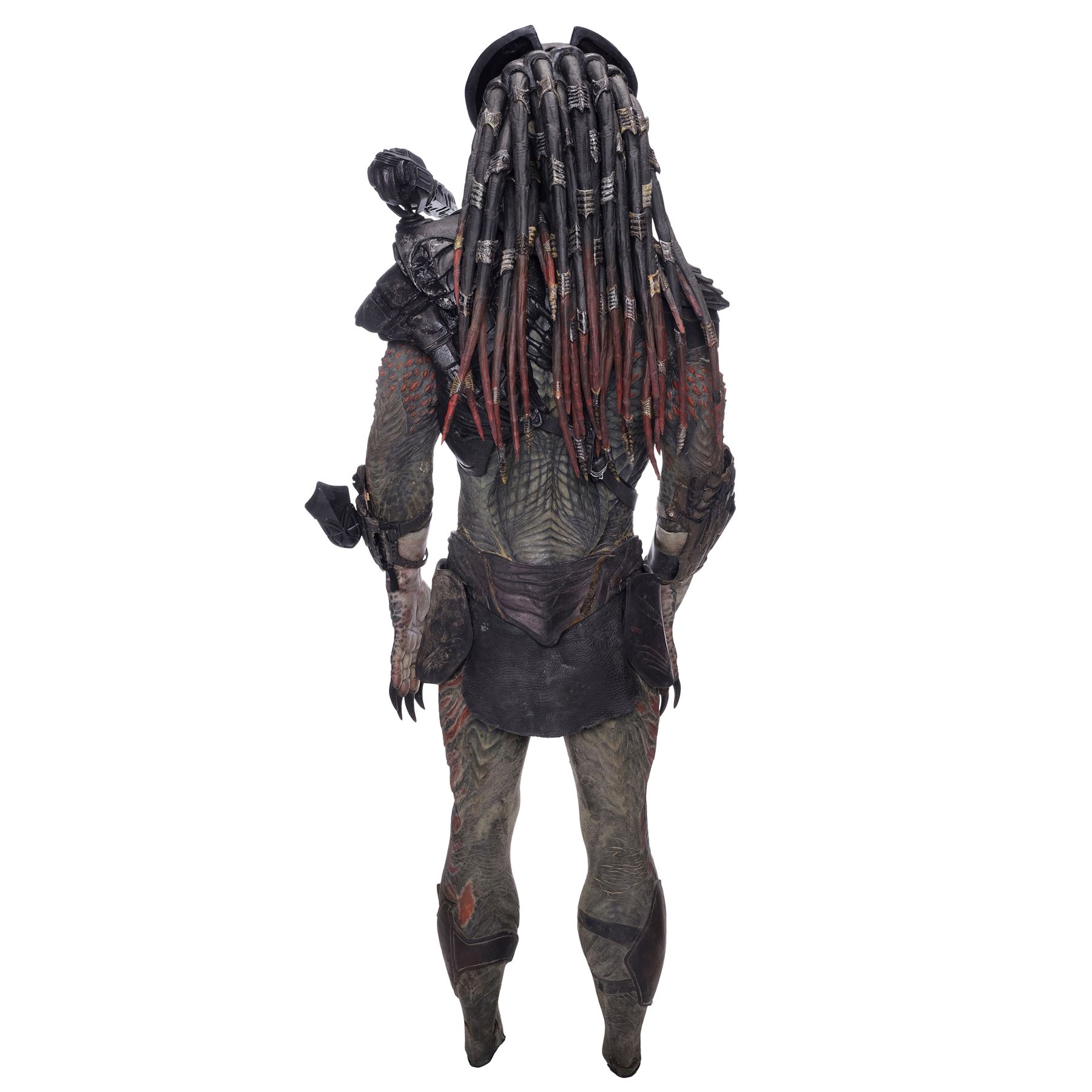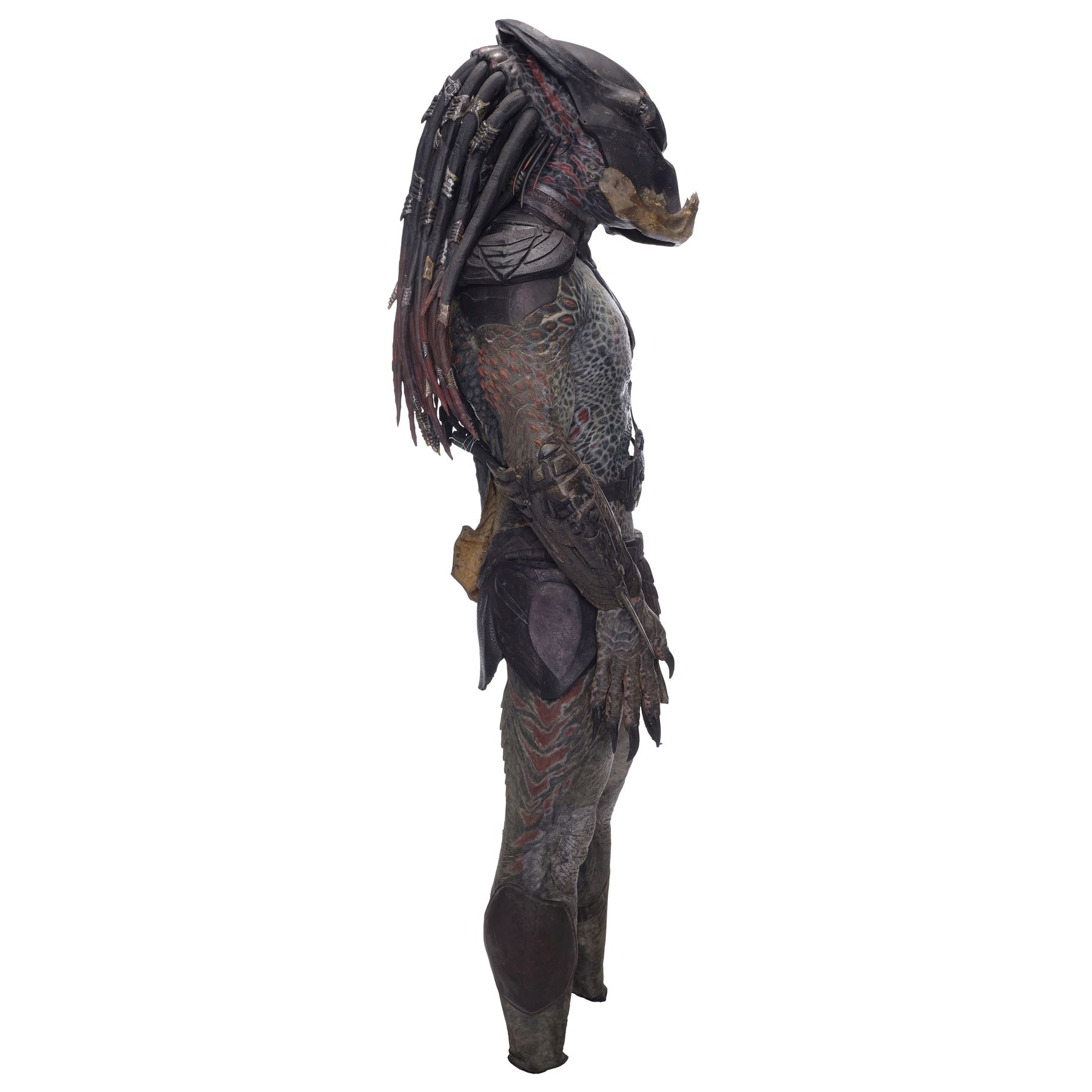 This costume consists of a foam latex bodysuit painted in a speckled pattern of black, red, white, and yellow; matching hands tipped with resin claws; a foam-latex headdress featuring an array of foam locs; and a helmet constructed from hard rubber, with an internal fiberglass layer, internal padding, clear lenses, and decorations resembling metal and bone secured via fastening strips to the scalp. Also decorating the suit are hard rubber chest, thigh, and shoulder armor secured with leather straps and several leather cloths; left and right bracers, the right featuring a resin blade and the left featuring an electronic communications unit; a neoprene and rubber collar; a slip-latex loincloth hiding a zipper; and a primarily-resin electronic plasmacaster, the creature's signature weapon. This costume was modified on the right pectoral and knee to cover the green-blooded wounds inflicted during the film's final battle. This lot exhibits cracking and peeling material throughout.