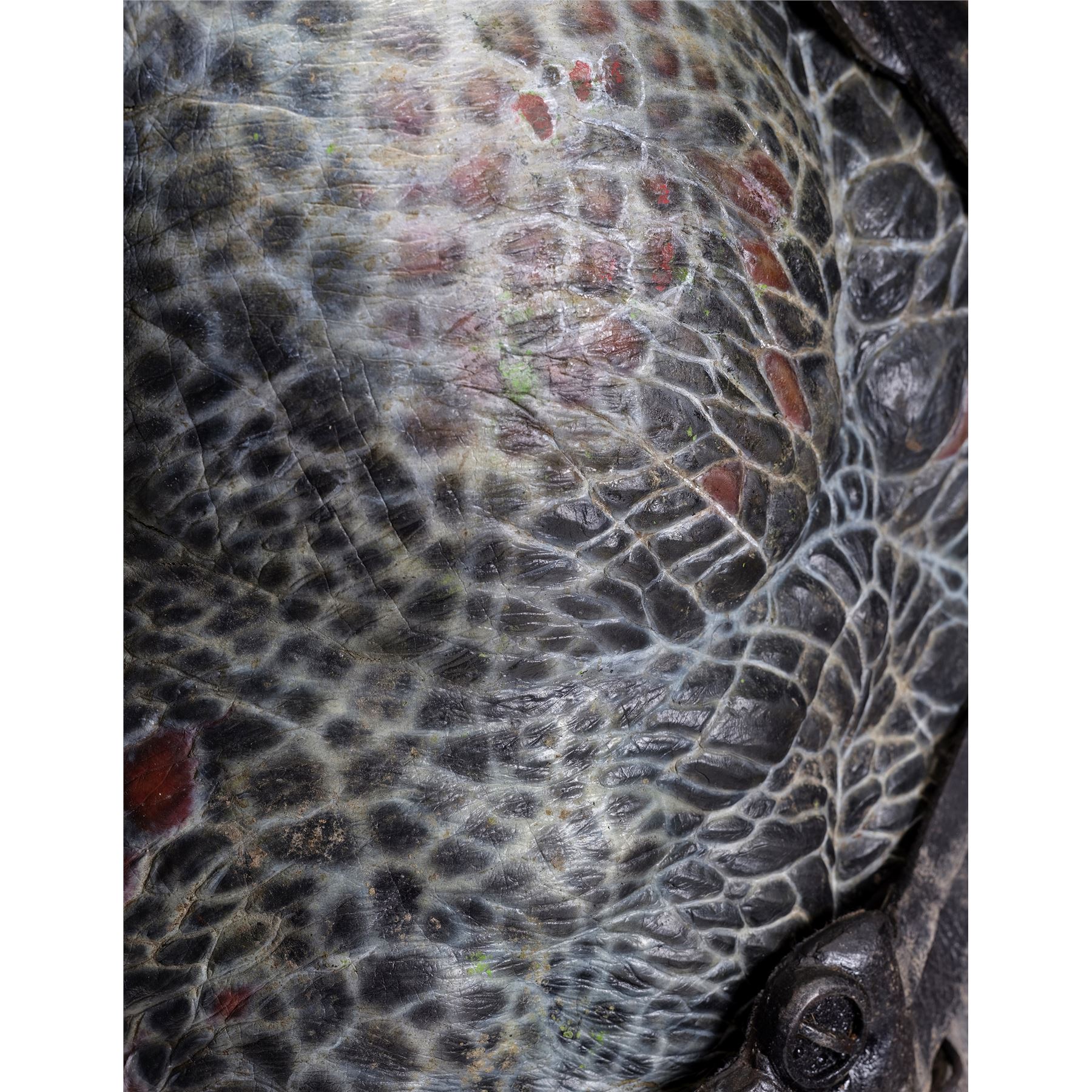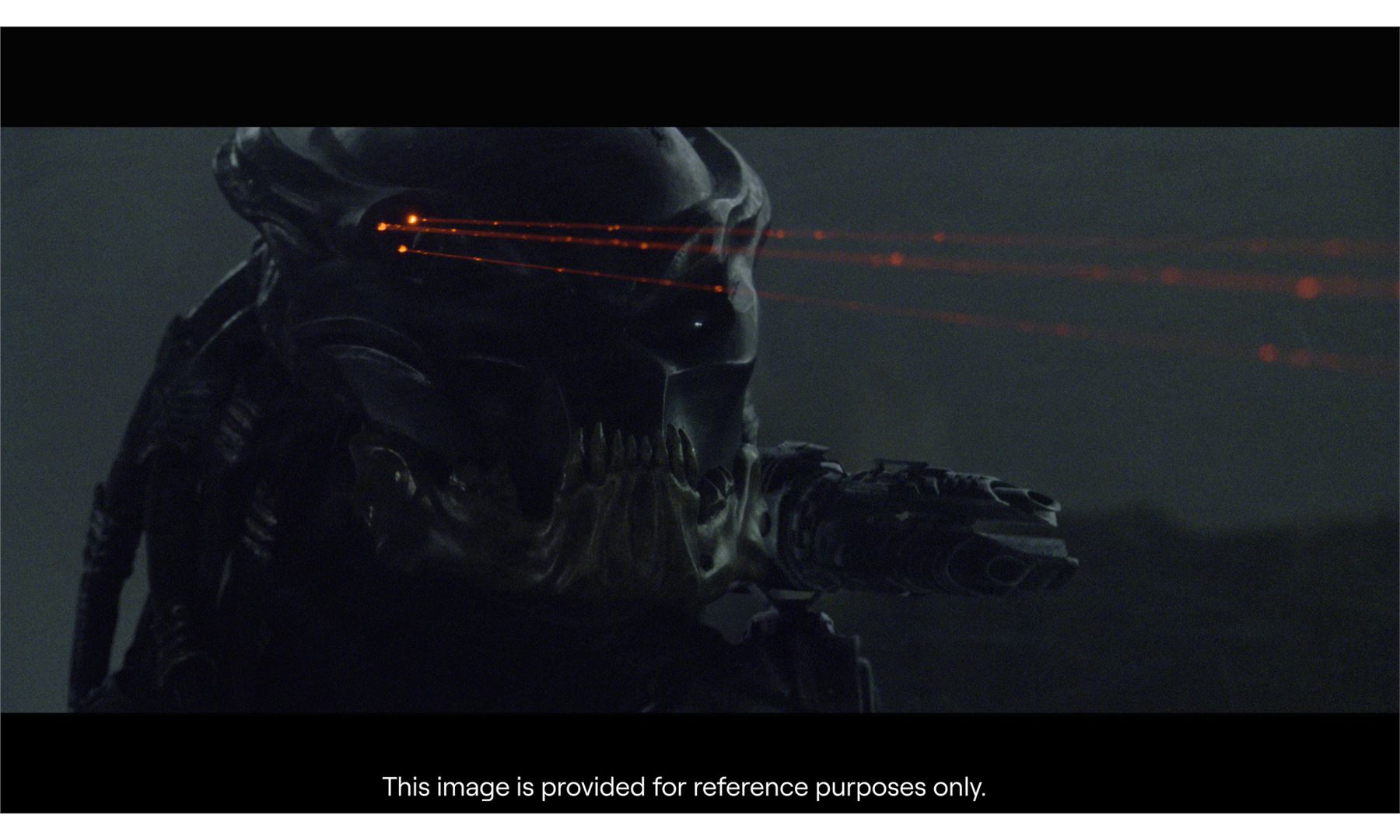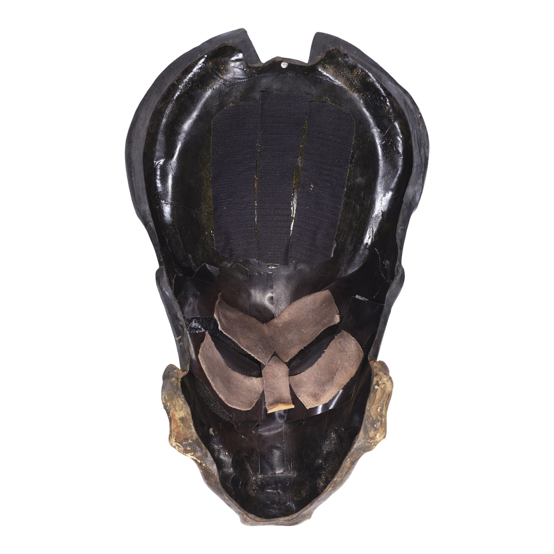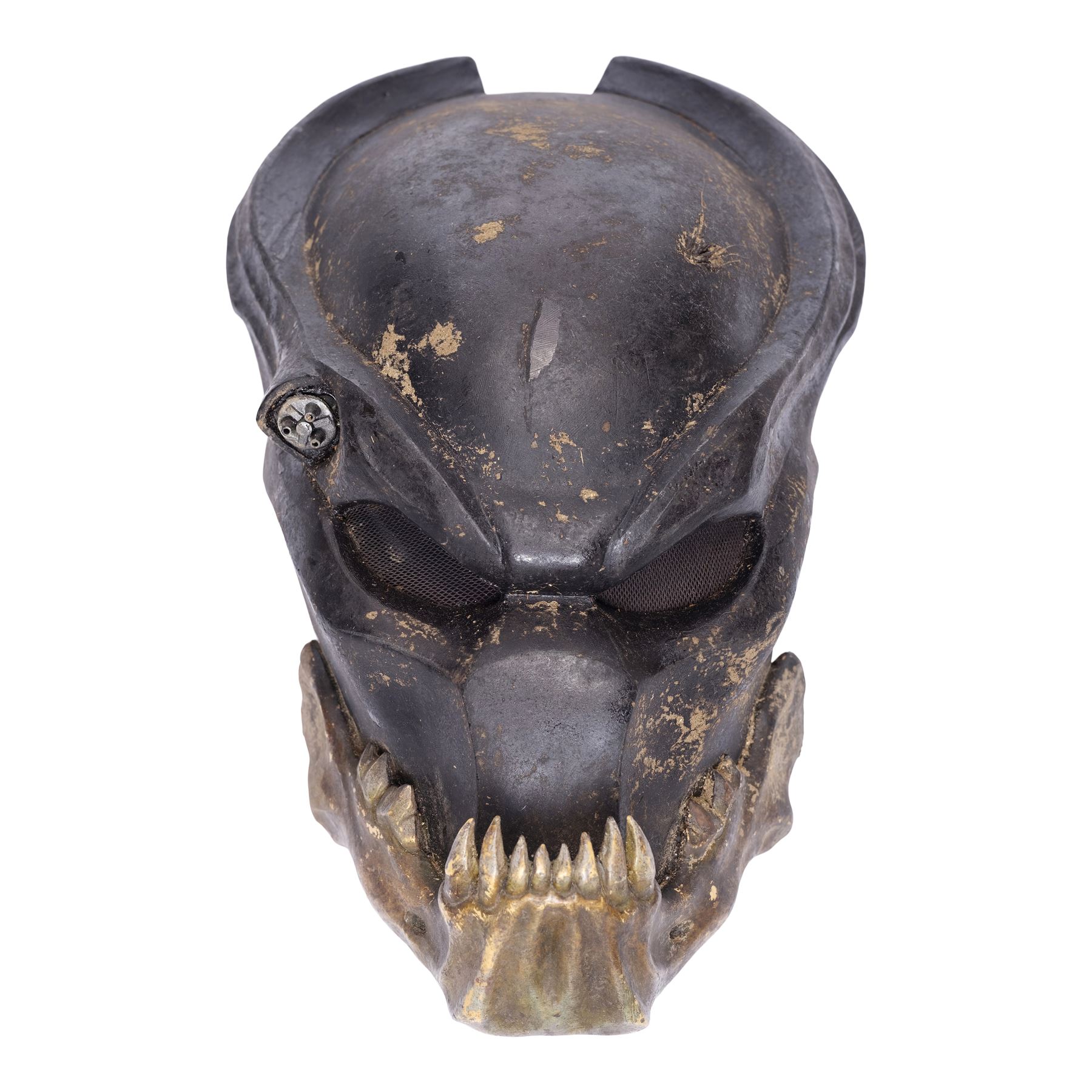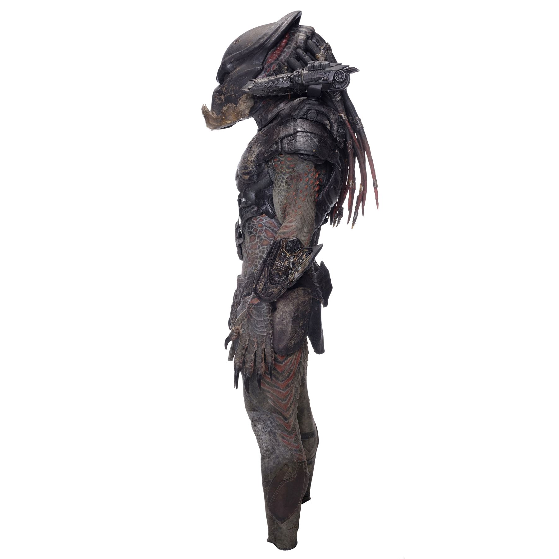 This costume consists of a foam latex bodysuit painted in a speckled pattern of black, red, white, and yellow; matching hands tipped with resin claws; a foam-latex headdress featuring an array of foam locs; and a helmet constructed from hard rubber, with an internal fiberglass layer, internal padding, clear lenses, and decorations resembling metal and bone secured via fastening strips to the scalp. Also decorating the suit are hard rubber chest, thigh, and shoulder armor secured with leather straps and several leather cloths; left and right bracers, the right featuring a resin blade and the left featuring an electronic communications unit; a neoprene and rubber collar; a slip-latex loincloth hiding a zipper; and a primarily-resin electronic plasmacaster, the creature's signature weapon. This costume was modified on the right pectoral and knee to cover the green-blooded wounds inflicted during the film's final battle. This lot exhibits cracking and peeling material throughout.