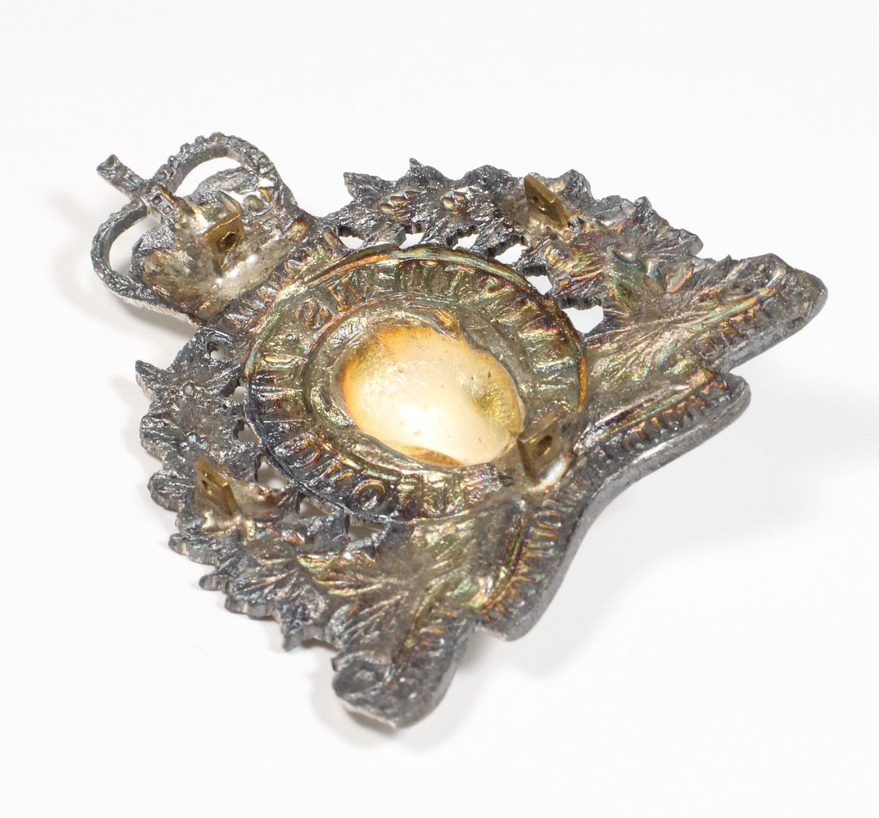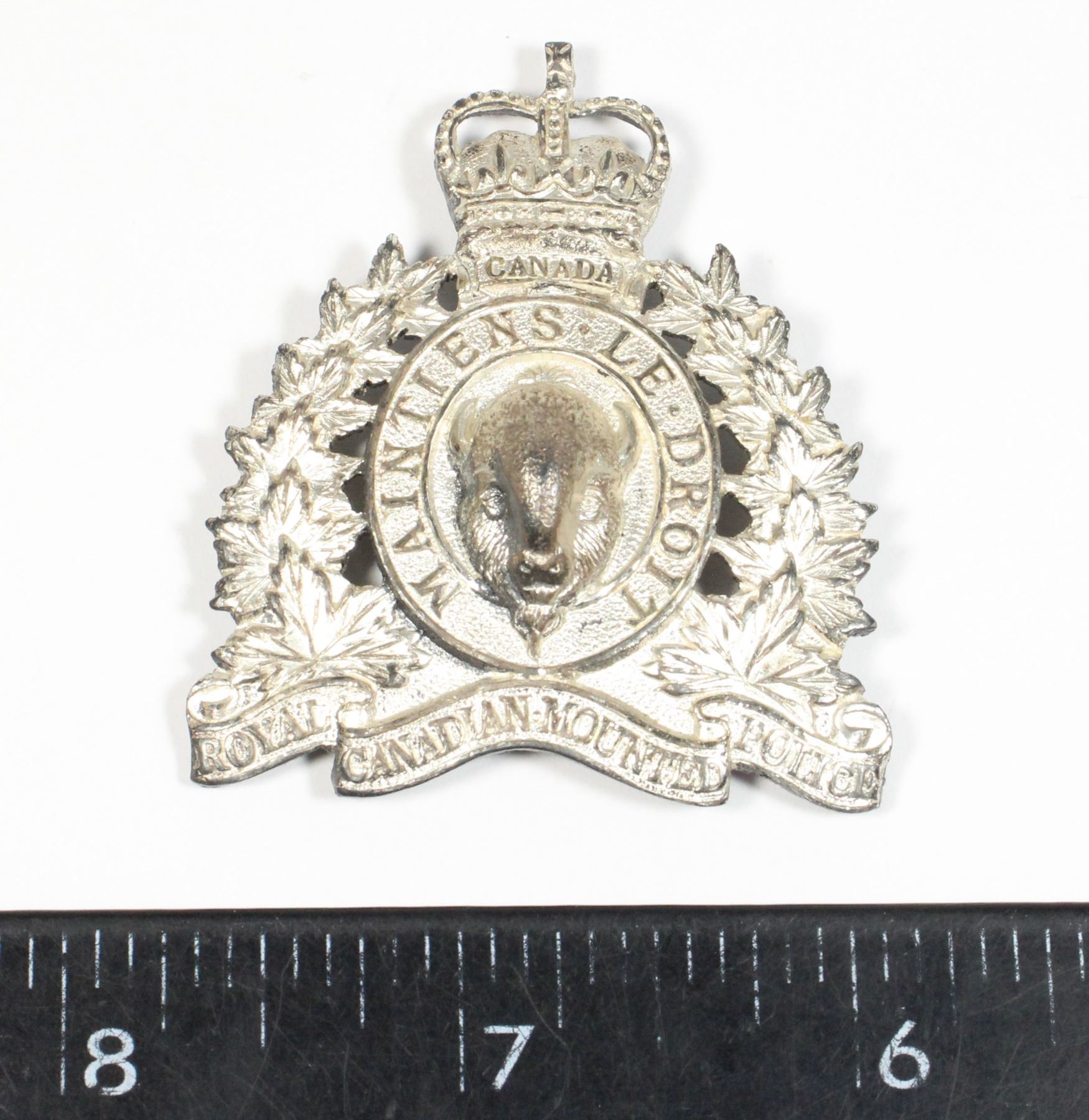 BADGE HAS SILVERED FINISH, UNUSUAL 4 SQUARE LUG DESIGN ON REVERSE. POSSIBLY MADE FOR ATTACHMENT TO OFFICERS HAT OR TO DISPLAY ITEM. ROYAL CANADIAN MOUNTED POLICE INSIGNIA