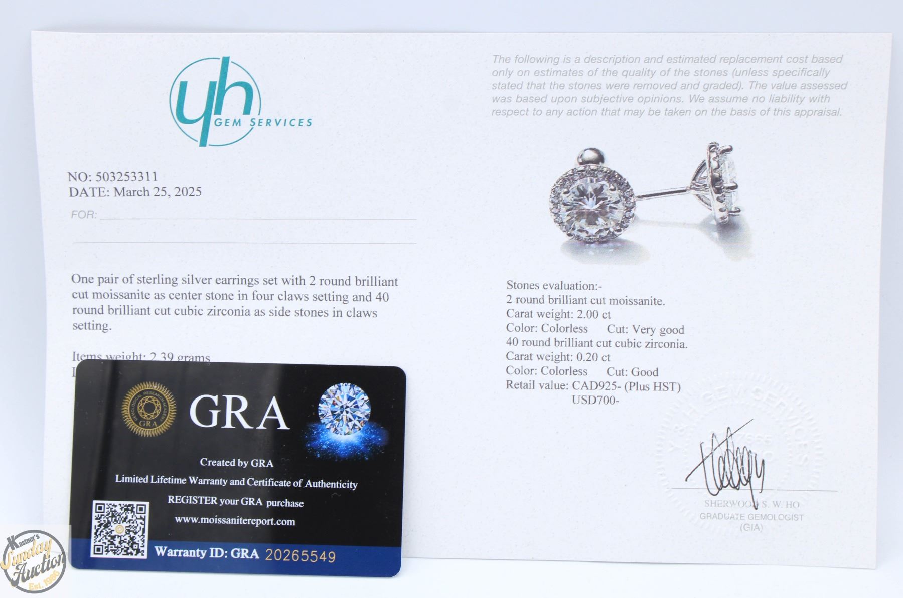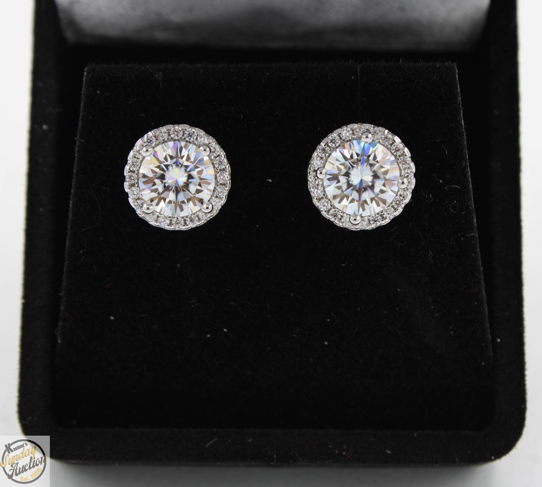 MOISSANITE STONES VVS D COLOR WITH 40 ROUND BRILLIANT CUT CUBIC ZIRCONIA SET IN ROUND HALOS SET IN 925 SILVER EARRINGS WITH SCREW BACKS RETAIL VALUE $925.00     **ALL ITEMS MUST BE REMOVED BY 5PM SATURDAY, MAY 31ST 2025. ALL REMAINING ITEMS WILL BE SUBJECT TO A $6.00 PER DAY STORAGE CHARGE. ANY ITEMS REMAINING AFTER MONDAY, JUNE 16TH 2025 WILL BE CONSIDERED FORFEITED. NO REFUNDS WILL BE ISSUED FOR FORFEITED ITEMS. TO SCHEDULE A PICK UP APPOINTMENT CLICK HERE
