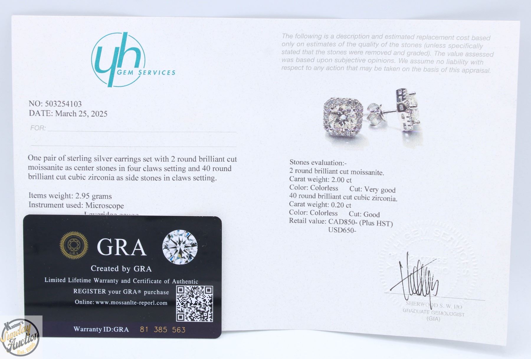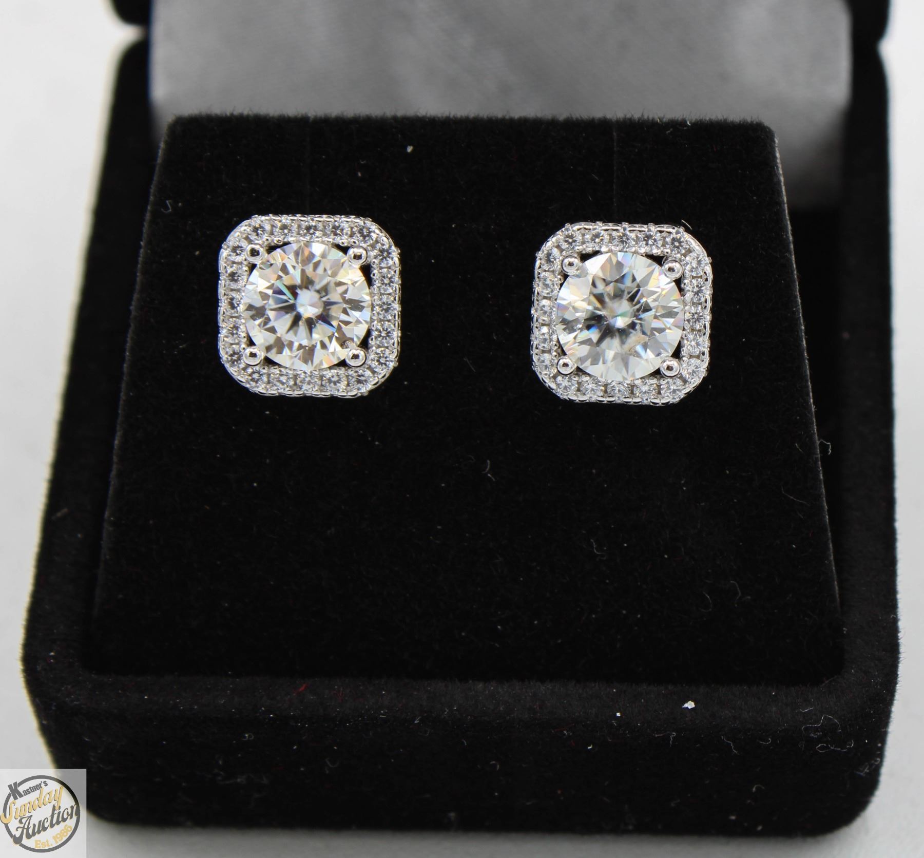 CUT MOISSANITE STONES VVS D COLOR WITH 40 ROUND BRILLIANT CUT CUBIC ZIRCONIA SET IN SQUARE HALOS SET IN 925 SILVER EARRINGS RETAIL VALUE $850.00 **ALL ITEMS MUST BE REMOVED BY 5PM SATURDAY, MAY 31ST 2025. ALL REMAINING ITEMS WILL BE SUBJECT TO A $6.00 PER DAY STORAGE CHARGE. ANY ITEMS REMAINING AFTER MONDAY, JUNE 16TH 2025 WILL BE CONSIDERED FORFEITED. NO REFUNDS WILL BE ISSUED FOR FORFEITED ITEMS. TO SCHEDULE A PICK UP APPOINTMENT CLICK HERE