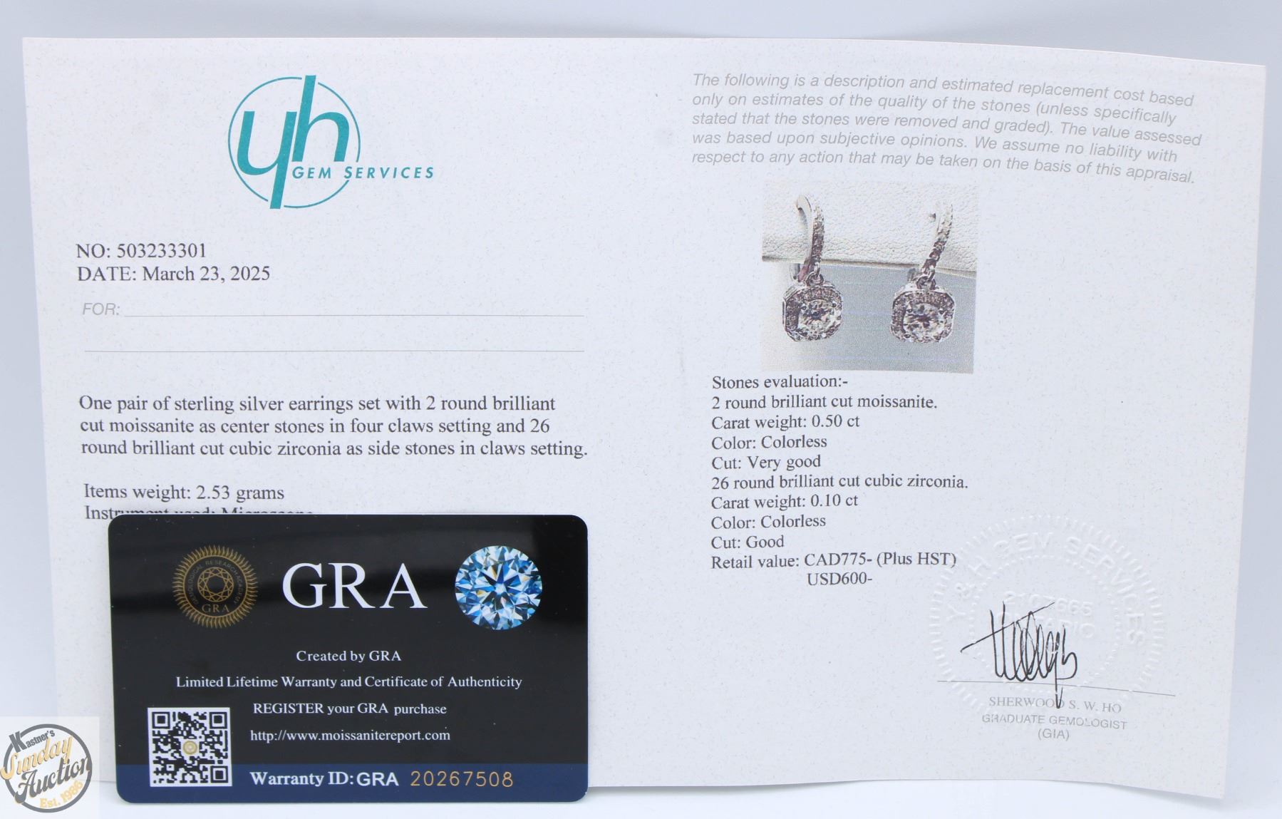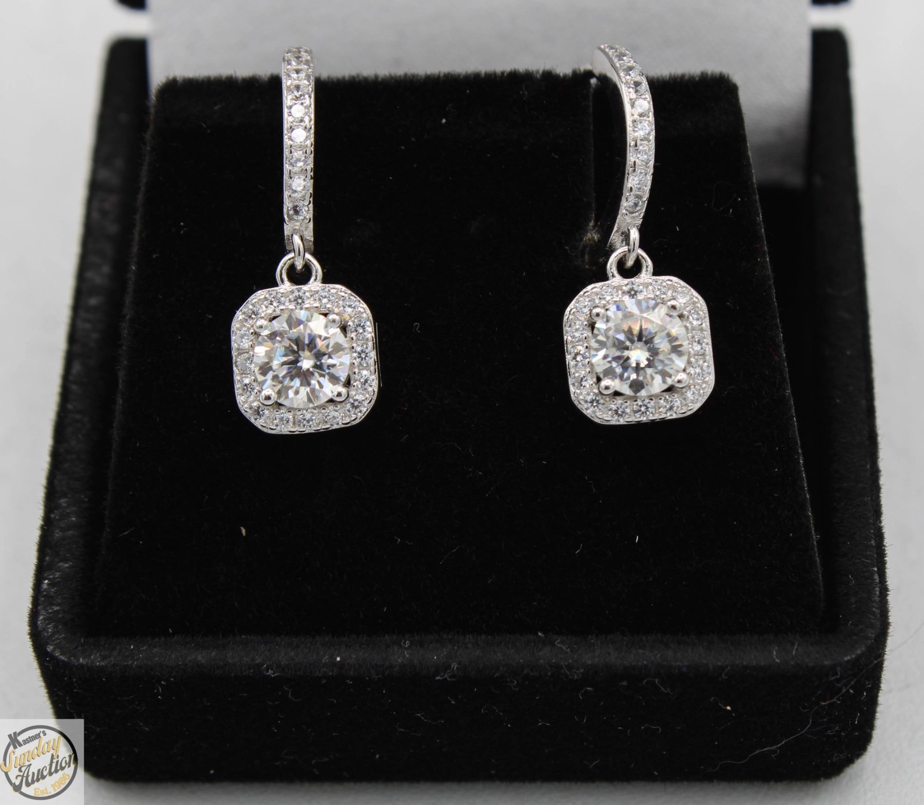 STONES VVS D COLOR WITH 26 ROUND BRILLIANT CUT CUBIC ZIRCONIA SET IN HALF ROUND POSTS AND IN SQUARE HALOS SET IN 925 SILVER EARRINGS RETAIL VALUE $775.00 **ALL ITEMS MUST BE REMOVED BY 5PM SATURDAY, MAY 31ST 2025. ALL REMAINING ITEMS WILL BE SUBJECT TO A $6.00 PER DAY STORAGE CHARGE. ANY ITEMS REMAINING AFTER MONDAY, JUNE 16TH 2025 WILL BE CONSIDERED FORFEITED. NO REFUNDS WILL BE ISSUED FOR FORFEITED ITEMS. TO SCHEDULE A PICK UP APPOINTMENT CLICK HERE