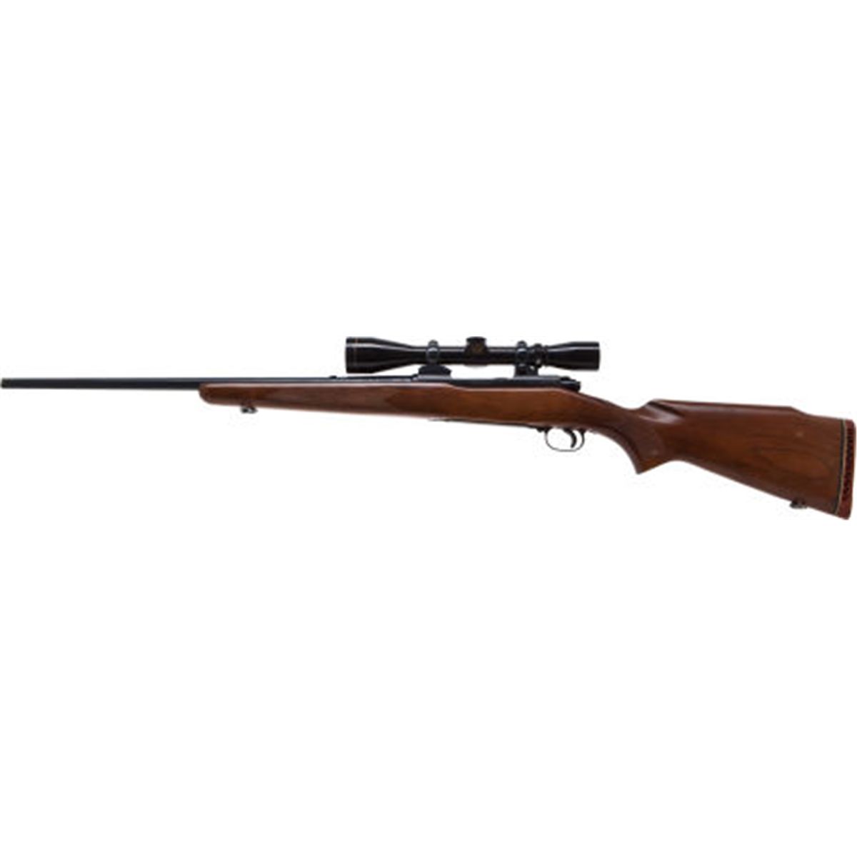 264 Win. Pre 64 Winchester Model 70 Featherweight Rifle with Telescopic Sight. Serial no. 549106. .264 Winchester. 22-inch barrel. No iron sights. Blued pre 64 bolt action. Trigger shoe. Checkered Monte Carlo pistolgrip stock of straight grain walnut. Leupold 3x9 Vari-X II telescopic sight. Tapered crosshairs. Condition: Fine. Metal shows 80-90% bluing with thinning on bolt handle and the front part of barrel. Stock shows some areas of impressions and scuffing on both sides near the butt. Excellent bore. Clear optics. NRA FIREARMS FOR FREEDOM PROGRAM