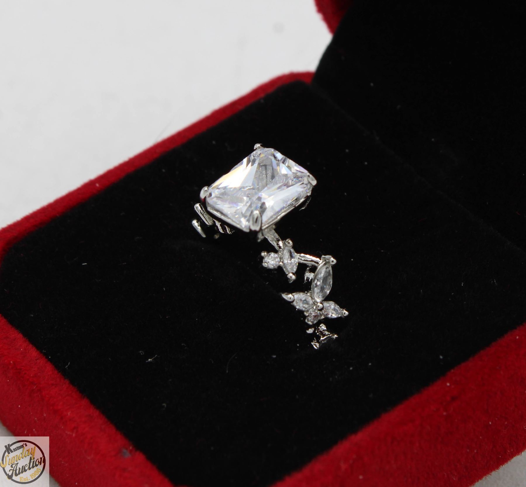 SET IN 4 CLAW HEAD WITH 4 MARQUISE SHAPED AND 3 ROUND CUT CUBIC ZIRCONIA ON EACH SIDE OF CENTER STONE SET IN 925 SILVER RING SIZE 6 IN VELVET RING BOX **ALL ITEMS MUST BE REMOVED BY 5PM SATURDAY, MAY 31ST 2025. ALL REMAINING ITEMS WILL BE SUBJECT TO A $6.00 PER DAY STORAGE CHARGE. ANY ITEMS REMAINING AFTER MONDAY, JUNE 16TH 2025 WILL BE CONSIDERED FORFEITED. NO REFUNDS WILL BE ISSUED FOR FORFEITED ITEMS. TO SCHEDULE A PICK UP APPOINTMENT CLICK HERE