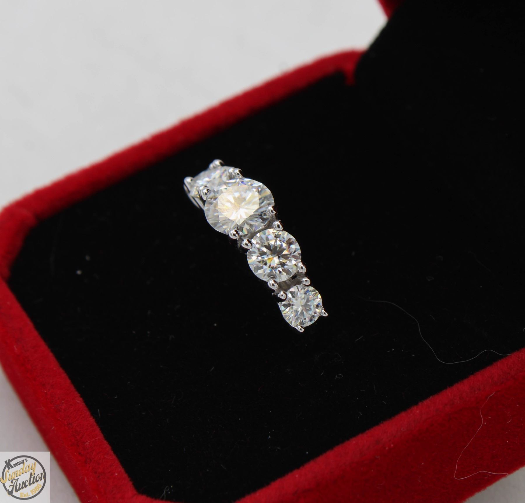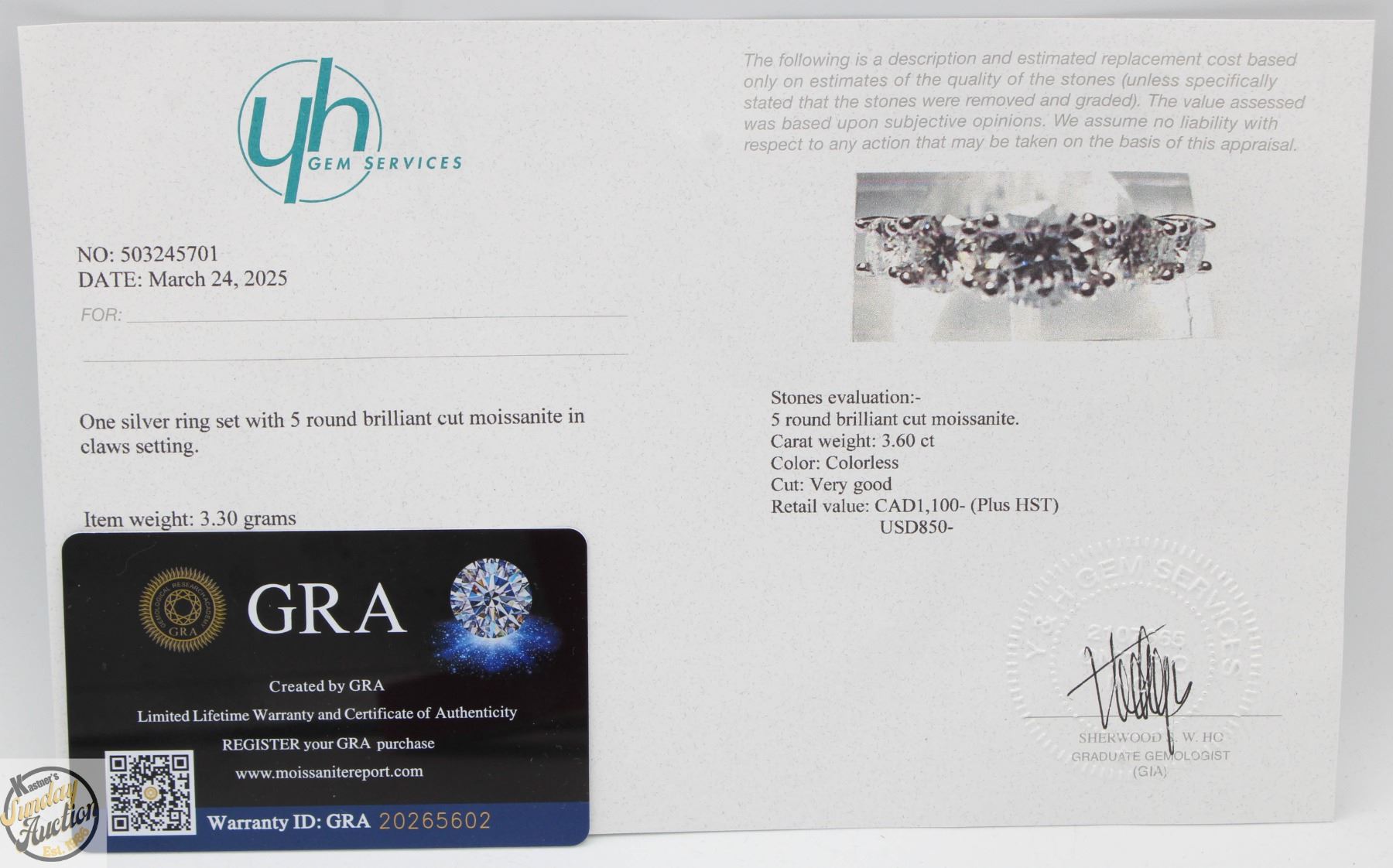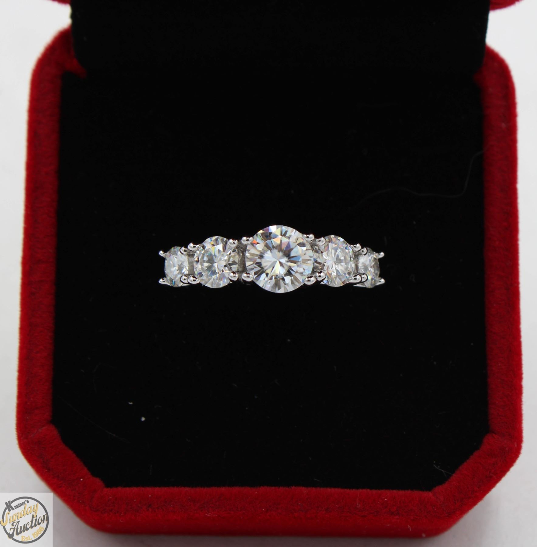 MOISSANITE STONES VVS D COLOR SET WITH LARGER MOISSANITE SET IN CENTER WITH GRADUATING DOWN IN SIZE ON EITHER SIDE SET IN 925 SILVER RING SIZE 6.25 RETAIL VALUE $1,100.00 **ALL ITEMS MUST BE REMOVED BY 5PM SATURDAY, JUNE 14TH 2025. ALL REMAINING ITEMS WILL BE SUBJECT TO A $6.00 PER DAY STORAGE CHARGE. ANY ITEMS REMAINING AFTER MONDAY, JUNE 30TH, 2025 WILL BE CONSIDERED FORFEITED. NO REFUNDS WILL BE ISSUED FOR FORFEITED ITEMS. TO SCHEDULE A PICK UP APPOINTMENT CLICK HERE