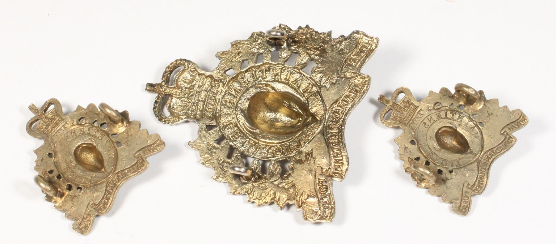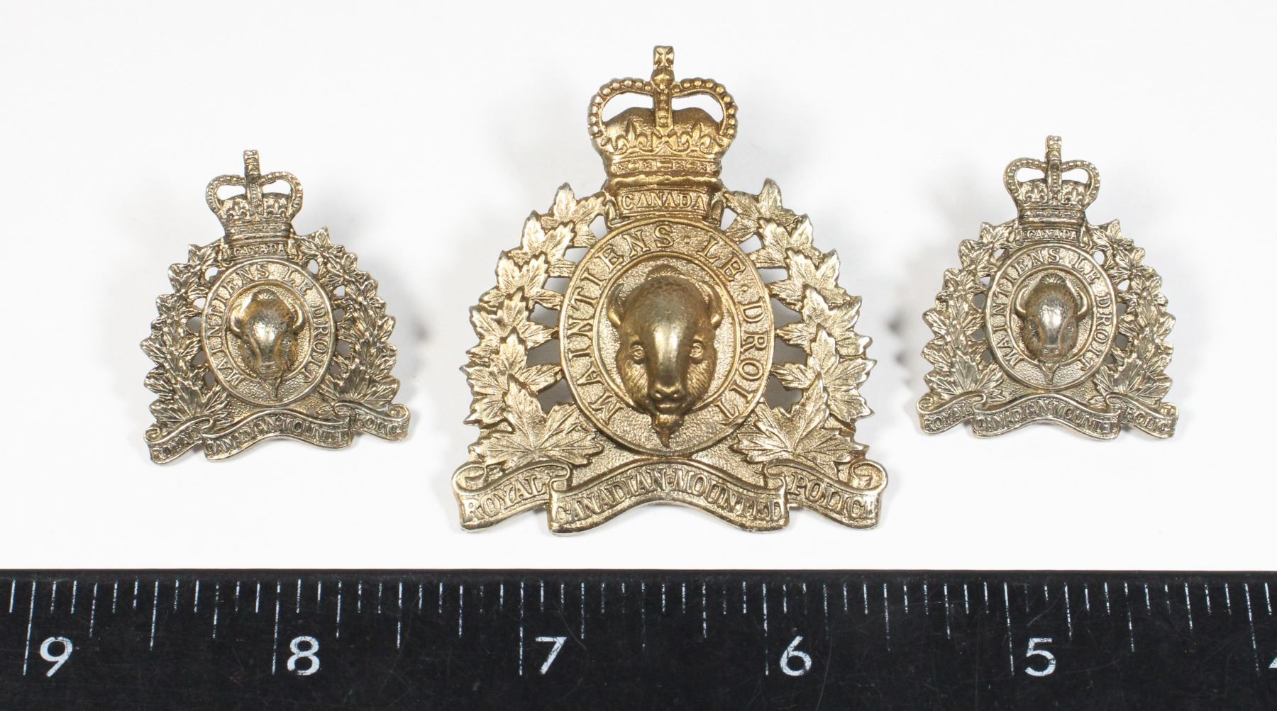 INCLUDES QUEEN ELIZABETH II QEII CAP BADGE WITH MATCHING COLLARS. ALL UNMARKED ON REVERSE WITH LUGS- HAS GREY PATINA. ROYAL CANADIAN MOUNTED POLICE INSIGNIA