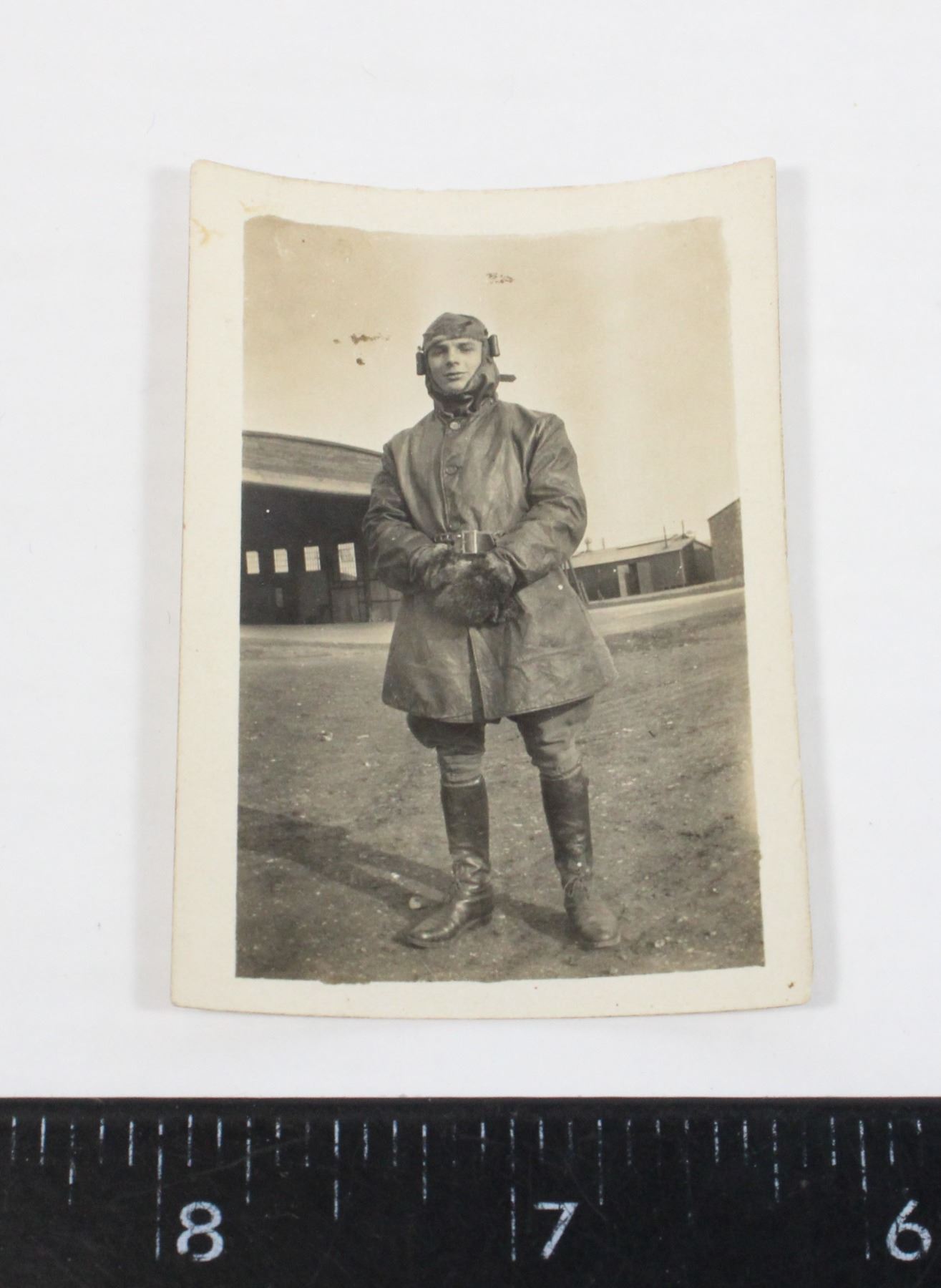 PHOTOGRAPH OF RFC RAF ROYAL FLYING CORPS /ROYAL AIR FORCE PILOT NEAR AIRPLANE HANGER WORLD WAR ONE ALLIED FORCES