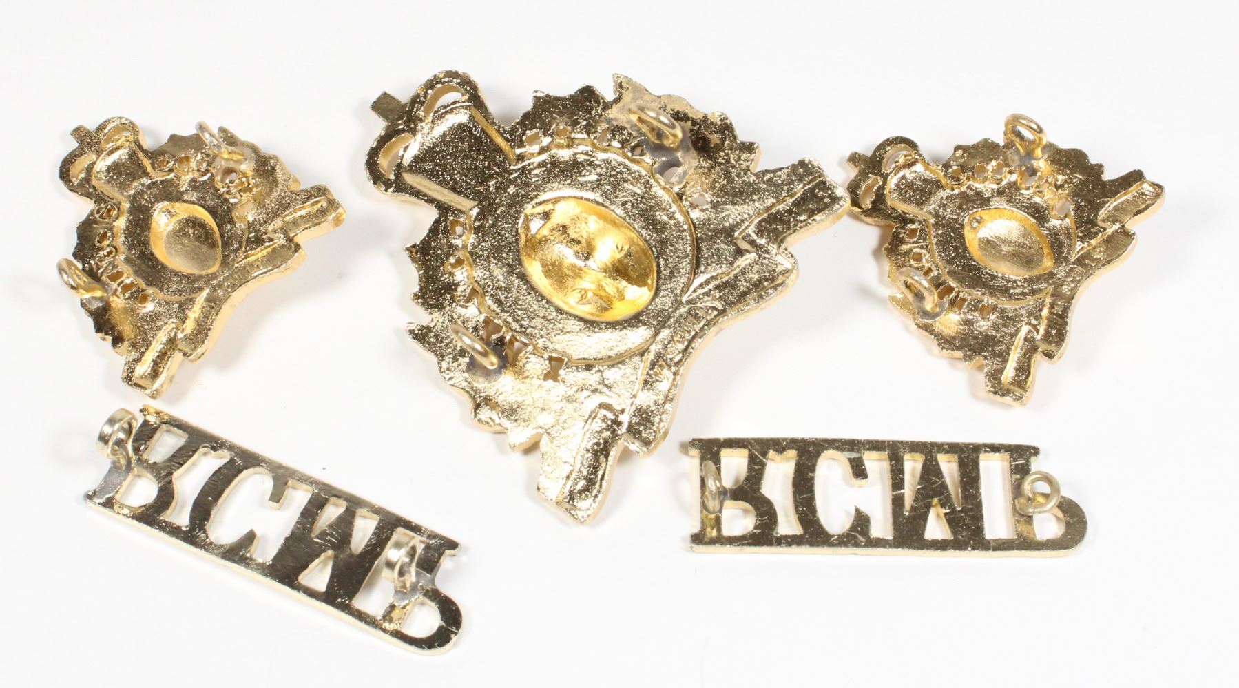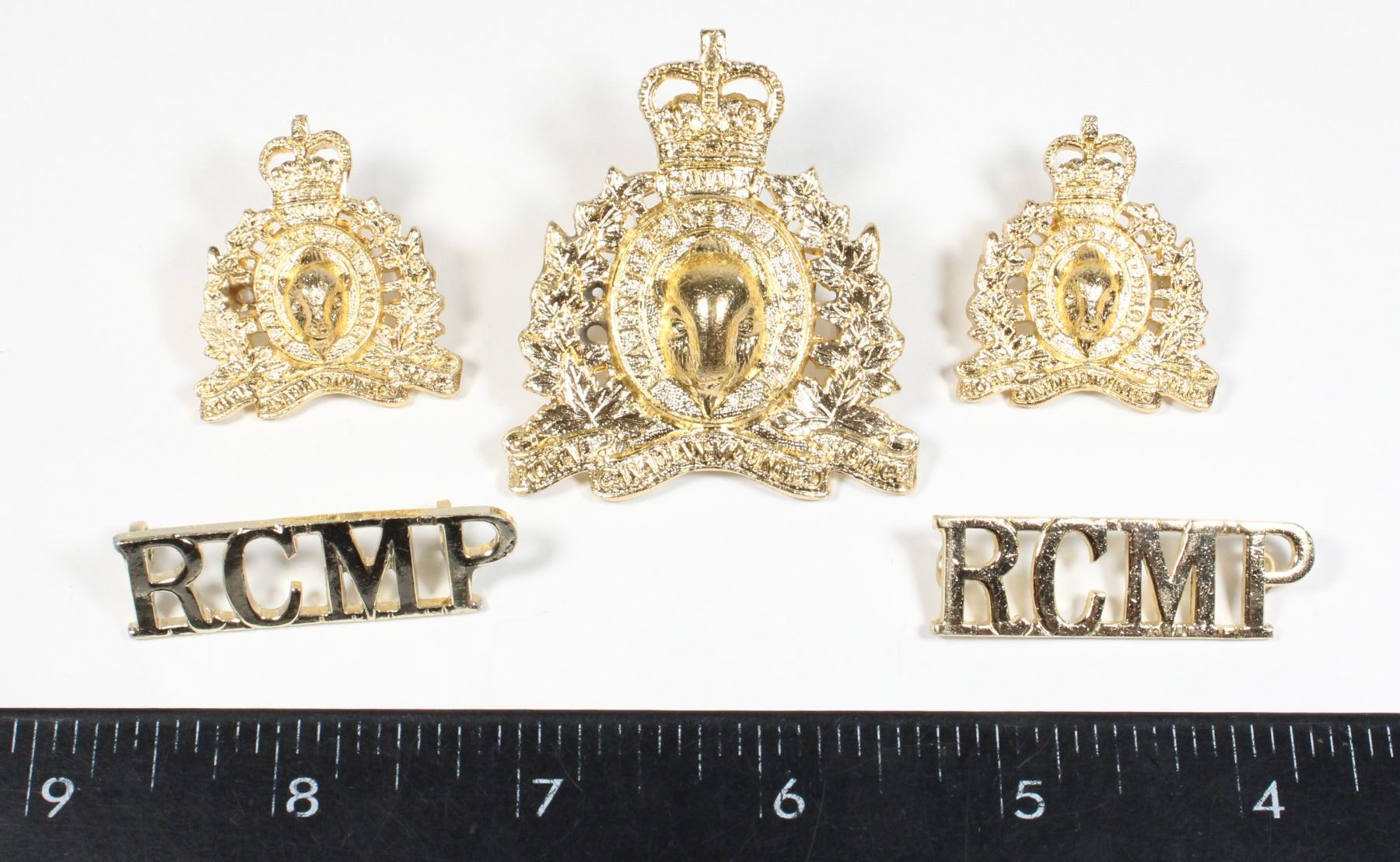 INCLUDES STAYBRITE MATCHING SET QUEEN ELIZABETH II QEII CAP BADGE, COLLAR BADGES AND SHOULDER TITLES - ALL MARKED "W SCULLY" WITH SHOULDER TITLES UNMARKED, ALL RETAIN REVERSE LUGS- HAS BRIGHT STAYBRITE PATINA. ROYAL CANADIAN MOUNTED POLICE INSIGNIA