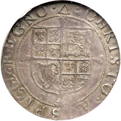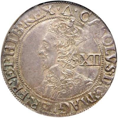 Great Britain. Shilling, ND. S.2799. Charles I, 1625-1649. Mint mark triangle. Group F. Sixth large Briot's bust. Type 4.4, with lace collar and double arched crown. Reverse Square topped shield over cross.This Civil War period shilling is a selected, fully round specimen which has been carefully made and then retained since the mid-17th century. Delightful pastel blue old cabinet toning complements the traces of original luster. Becoming very scarce this nice. NGC graded AU-55.