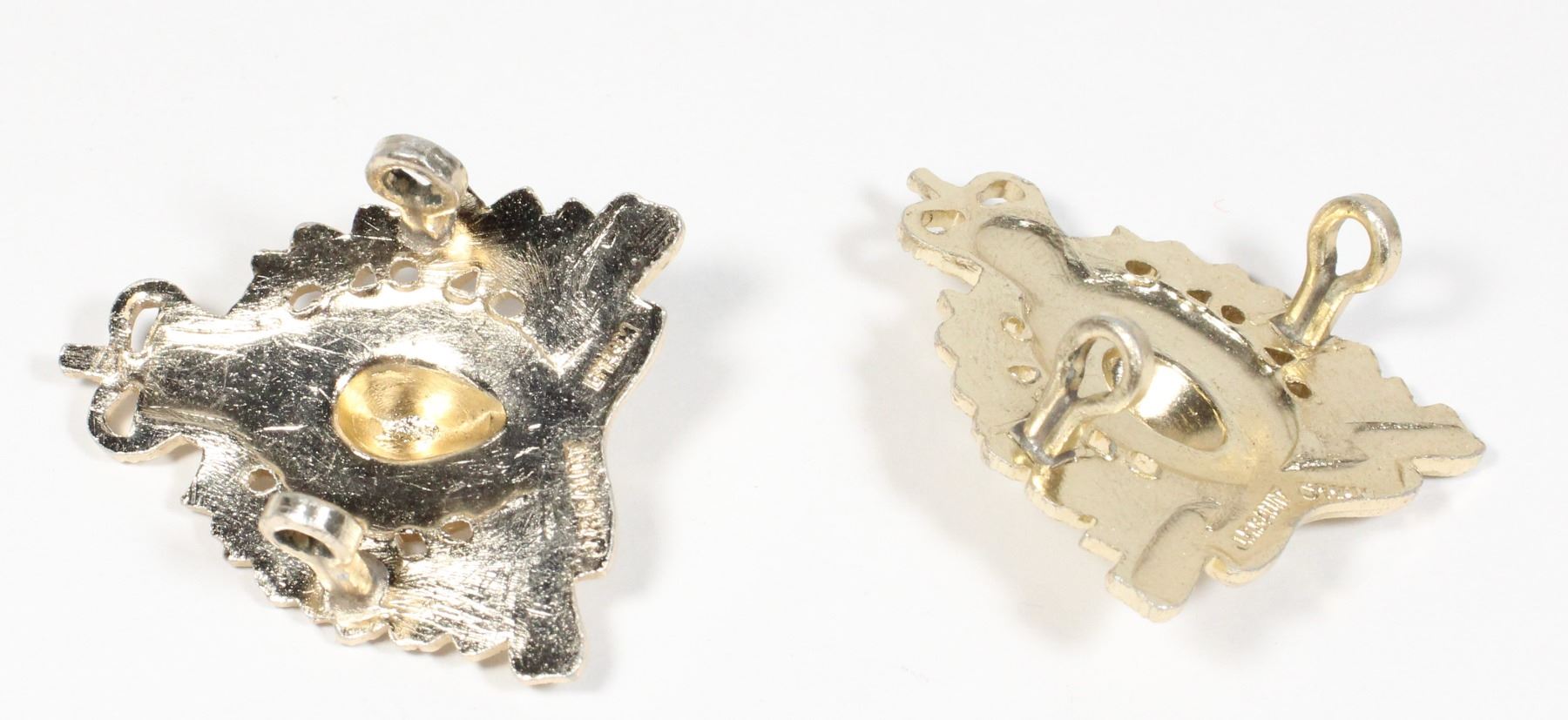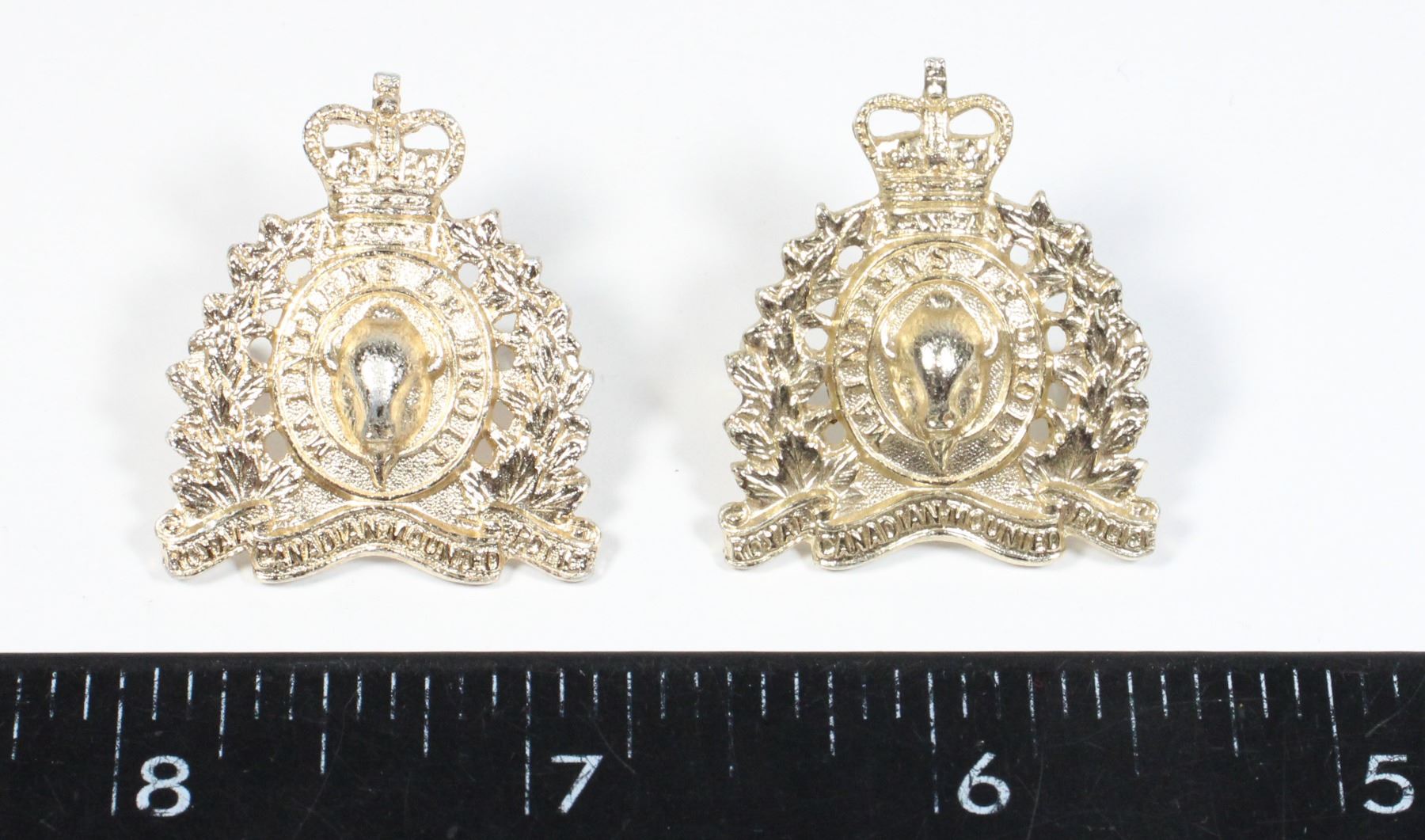 COLLAR BADGES BOTH RETAIN ORIGINAL LUGS, AND REVERSE MARKED "J.R. GAUNT B'HAM". QUEEN ELIZABETH II ROYAL CANADIAN MOUNTED POLICE INSIGNIA