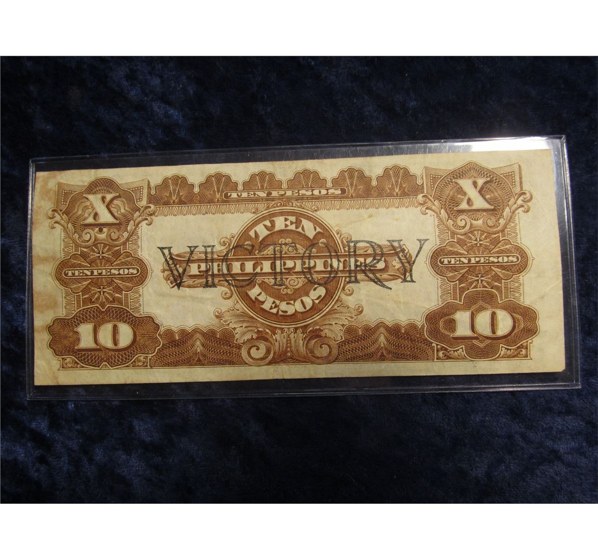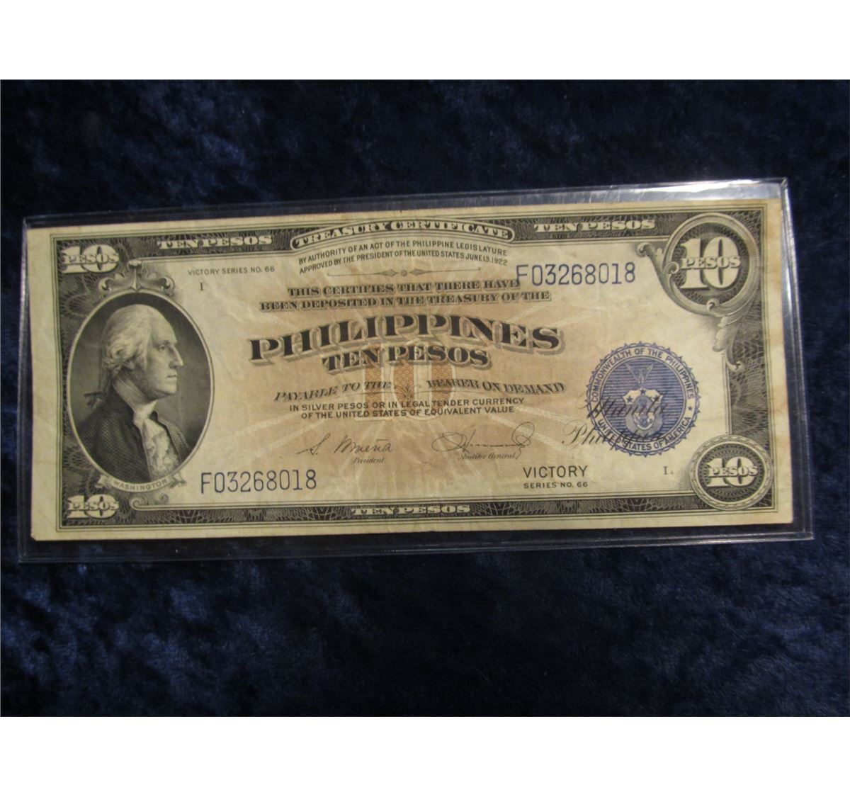 268. Series No. 66 Philippines Ten Pesos Treasury Certificate. "Payable to the Bearer on Demand in Silver Pesos or in Legal Tender Currency of the United States of Equilavent Value". "VICTORY" Counterstamp on reverse. VF.