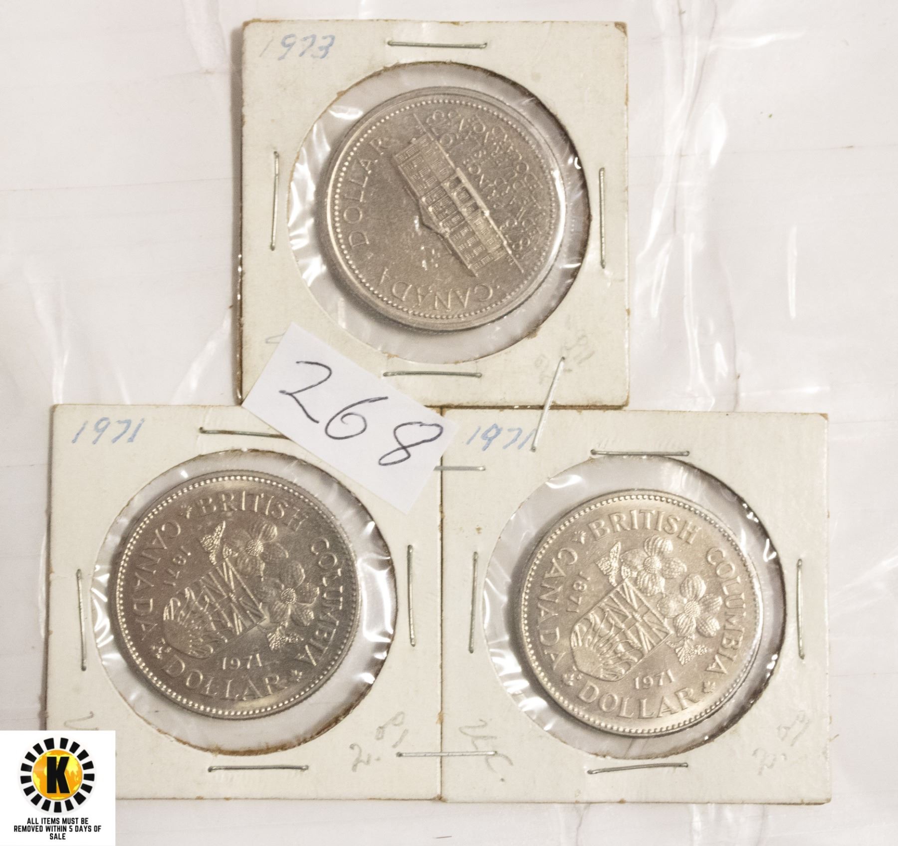 268)THREE CANADIAN DOLLARS 1971,1971,1973