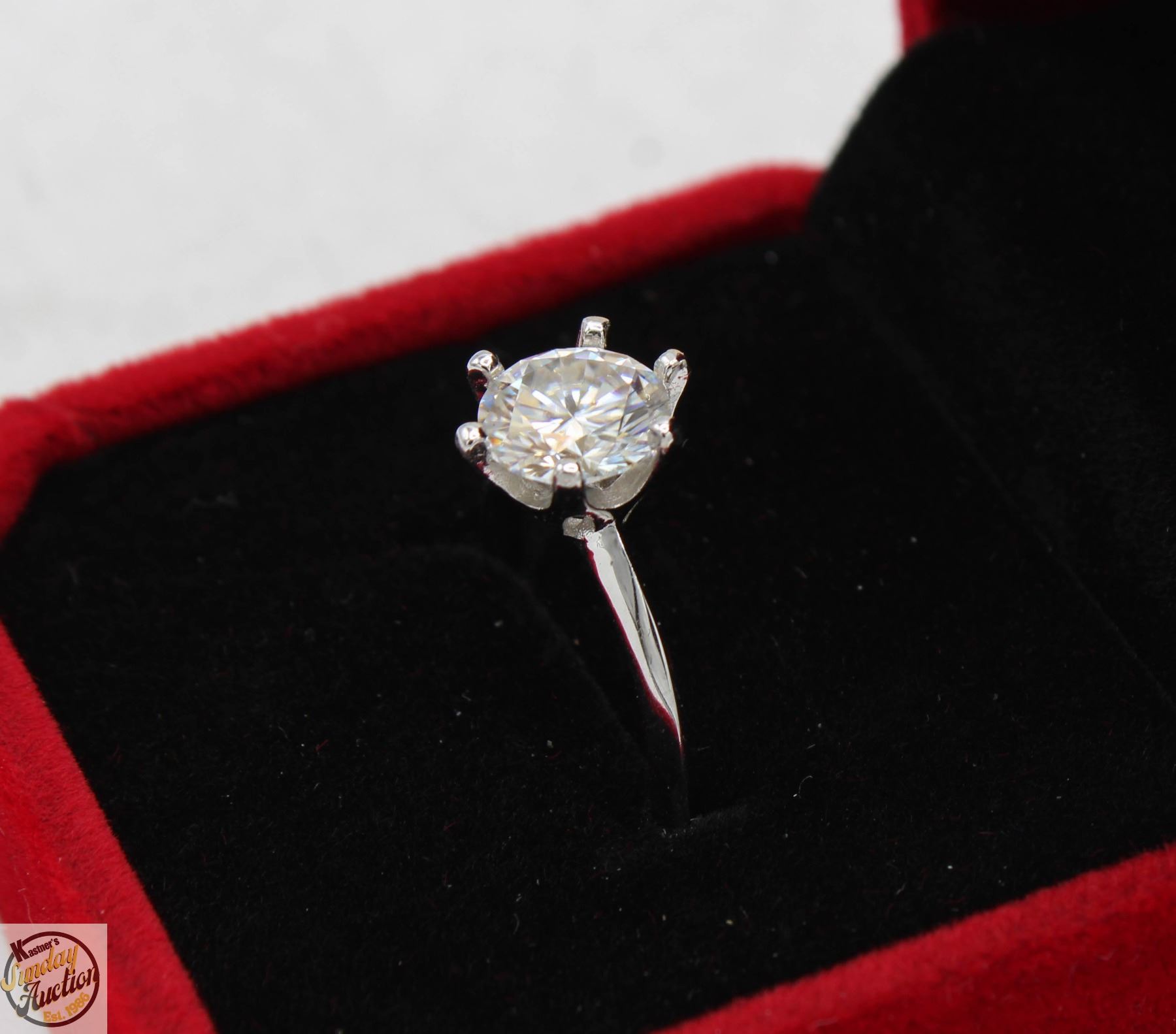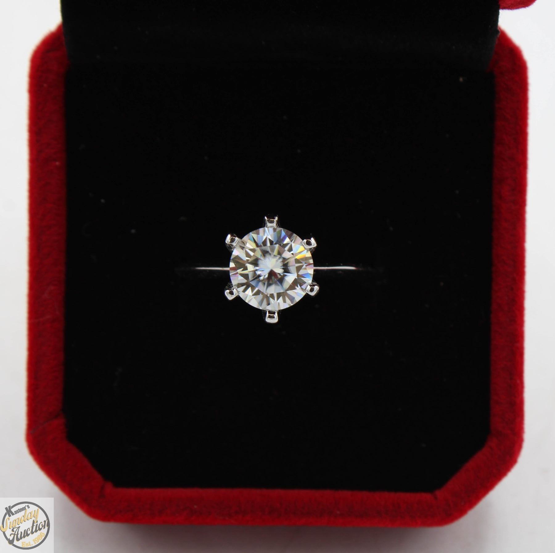 MOISSANITE STONE VVS D COLOR SET IN 6 CLAW HEAD SET IN 925 SILVER RING SIZE 6.5 RETAIL VALUE $825.00 **ALL ITEMS MUST BE REMOVED BY 5PM SATURDAY, JUNE 14TH 2025. ALL REMAINING ITEMS WILL BE SUBJECT TO A $6.00 PER DAY STORAGE CHARGE. ANY ITEMS REMAINING AFTER MONDAY, JUNE 30TH, 2025 WILL BE CONSIDERED FORFEITED. NO REFUNDS WILL BE ISSUED FOR FORFEITED ITEMS. TO SCHEDULE A PICK UP APPOINTMENT CLICK HERE