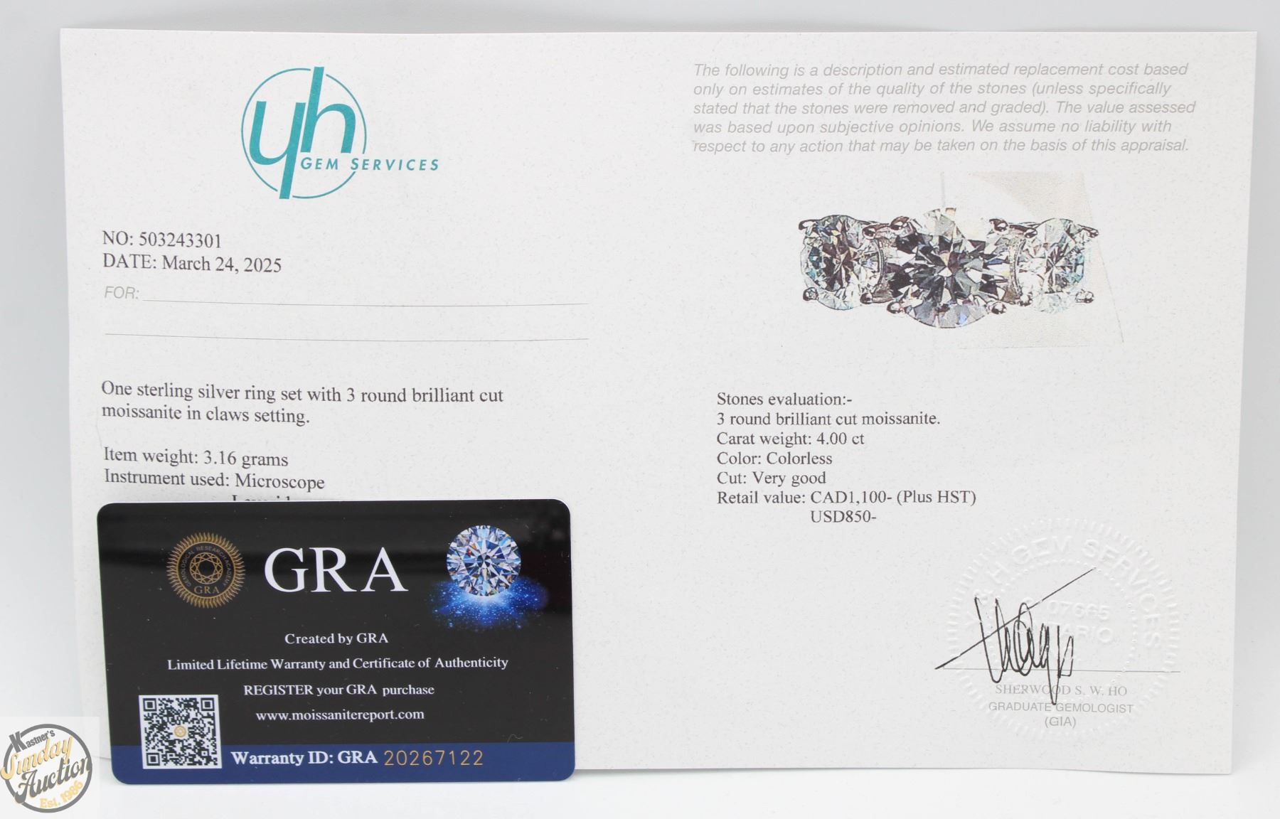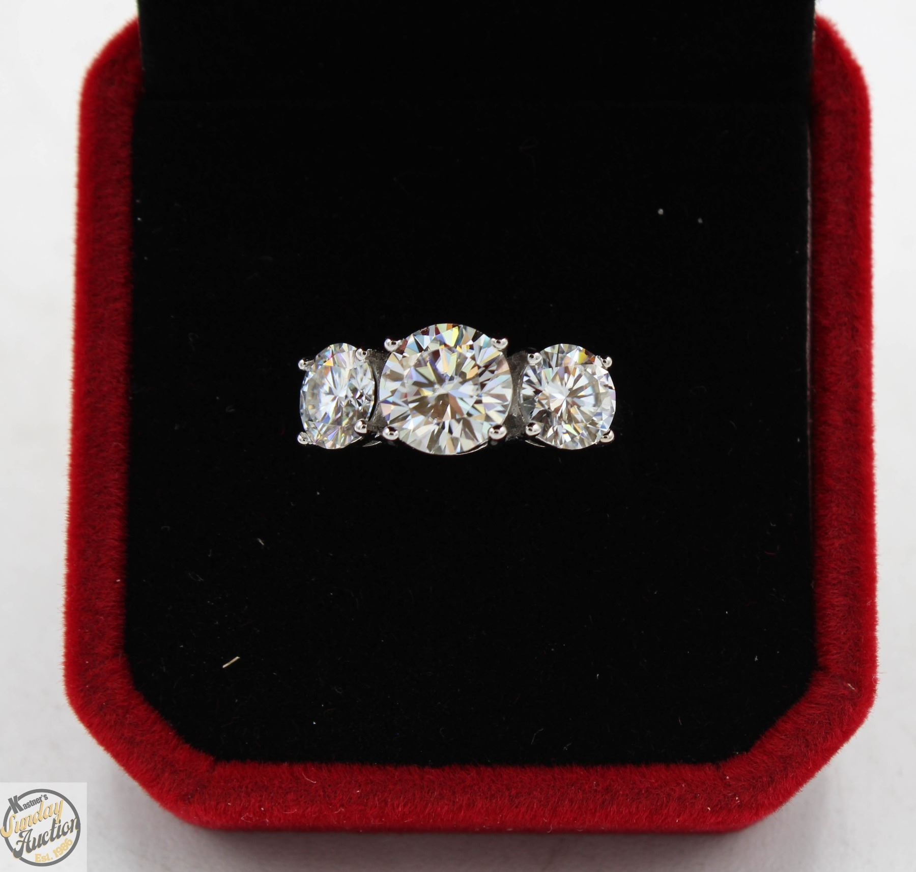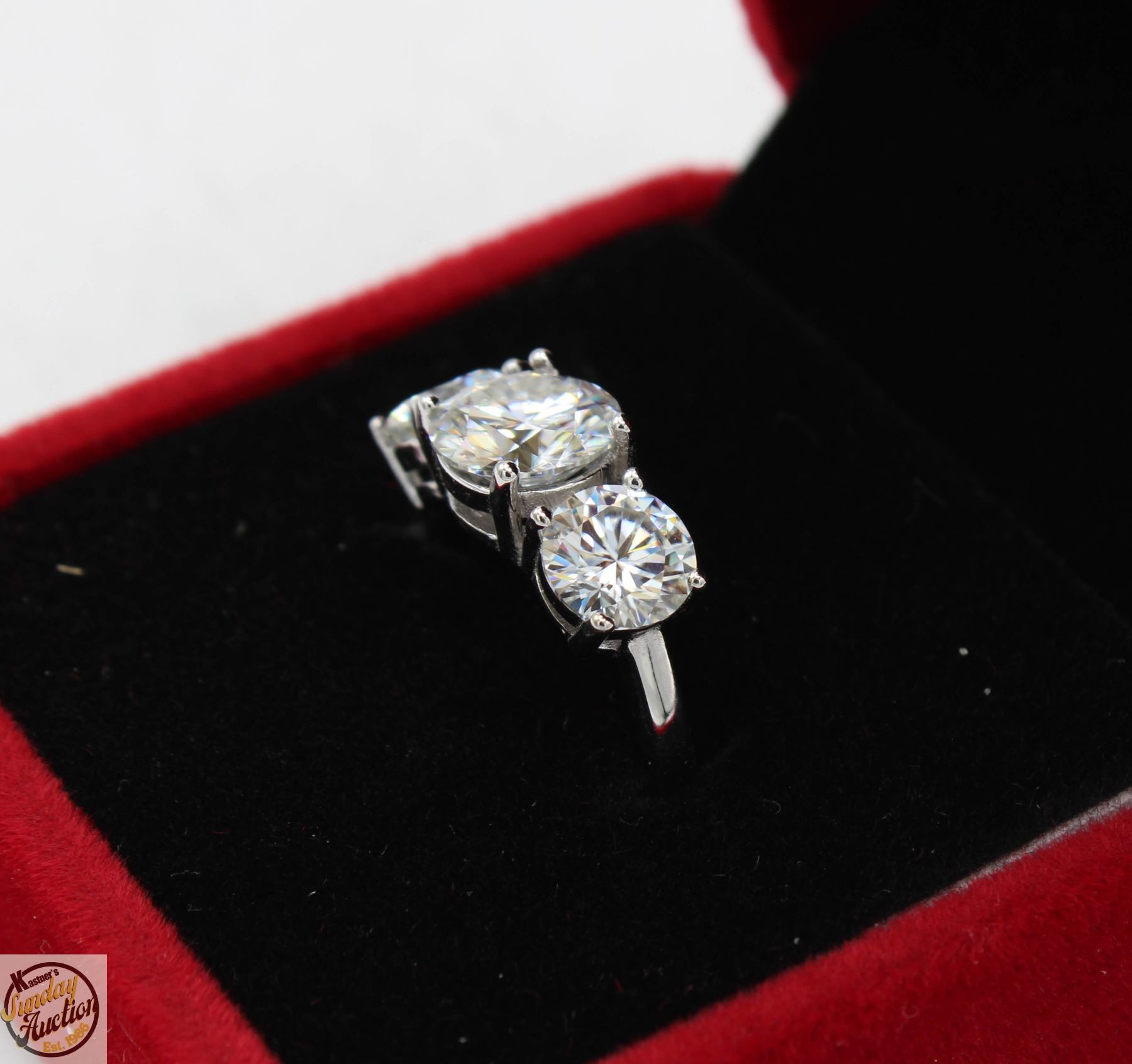 MOISSANITE STONES VVS D COLOR SET WITH 2.00 CT MOISSANITE SET IN CENTER WITH 1.00 CT SET ON EITHER SIDE SET IN 925 SILVER RING SIZE 7 RETAIL VALUE $1,100.00 **ALL ITEMS MUST BE REMOVED BY 5PM SATURDAY, JUNE 14TH 2025. ALL REMAINING ITEMS WILL BE SUBJECT TO A $6.00 PER DAY STORAGE CHARGE. ANY ITEMS REMAINING AFTER MONDAY, JUNE 30TH, 2025 WILL BE CONSIDERED FORFEITED. NO REFUNDS WILL BE ISSUED FOR FORFEITED ITEMS. TO SCHEDULE A PICK UP APPOINTMENT CLICK HERE