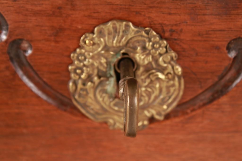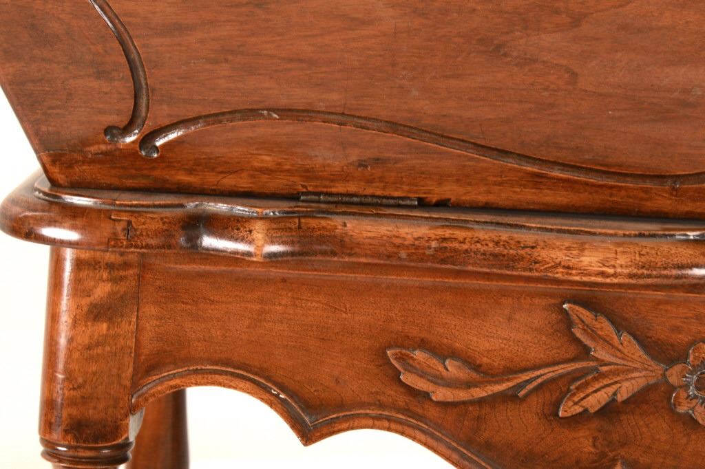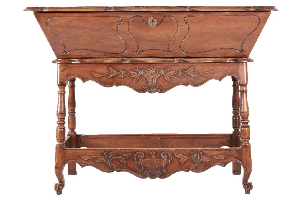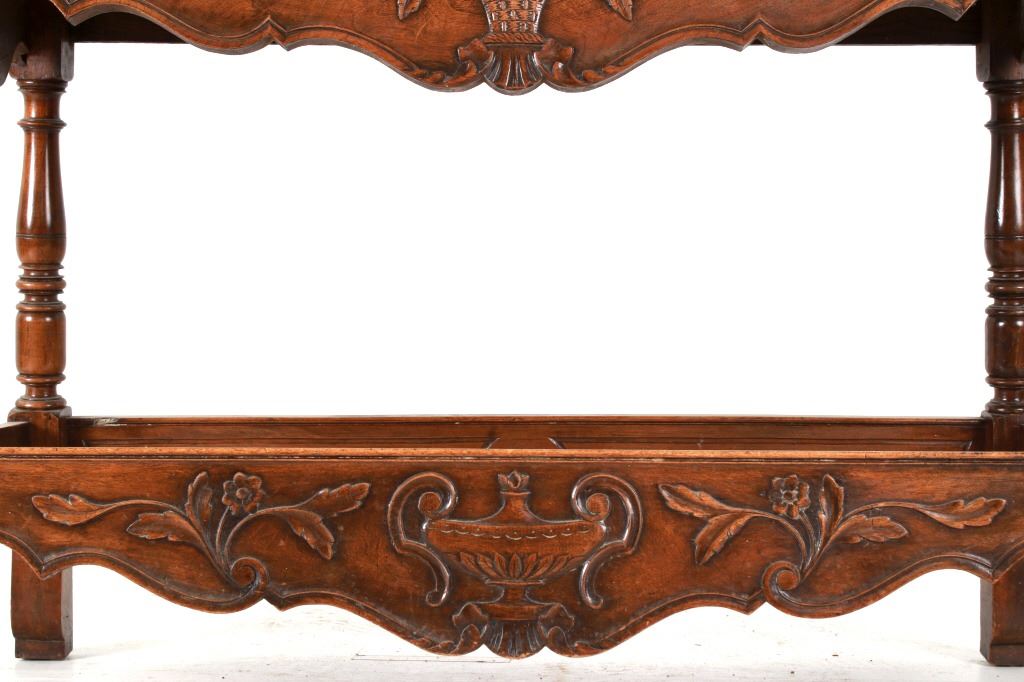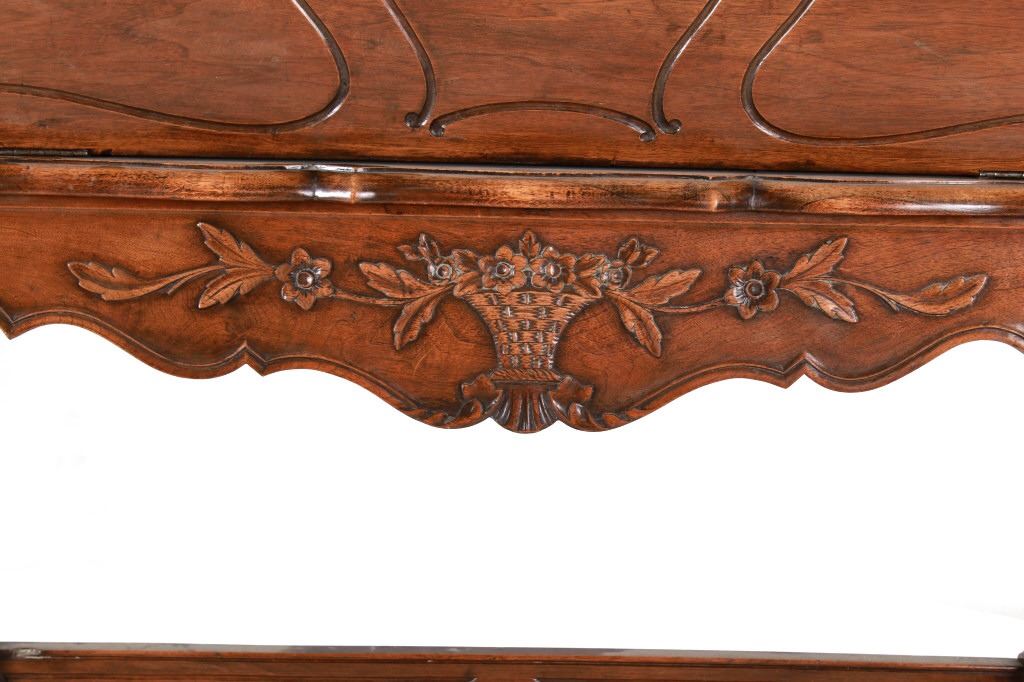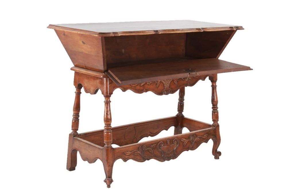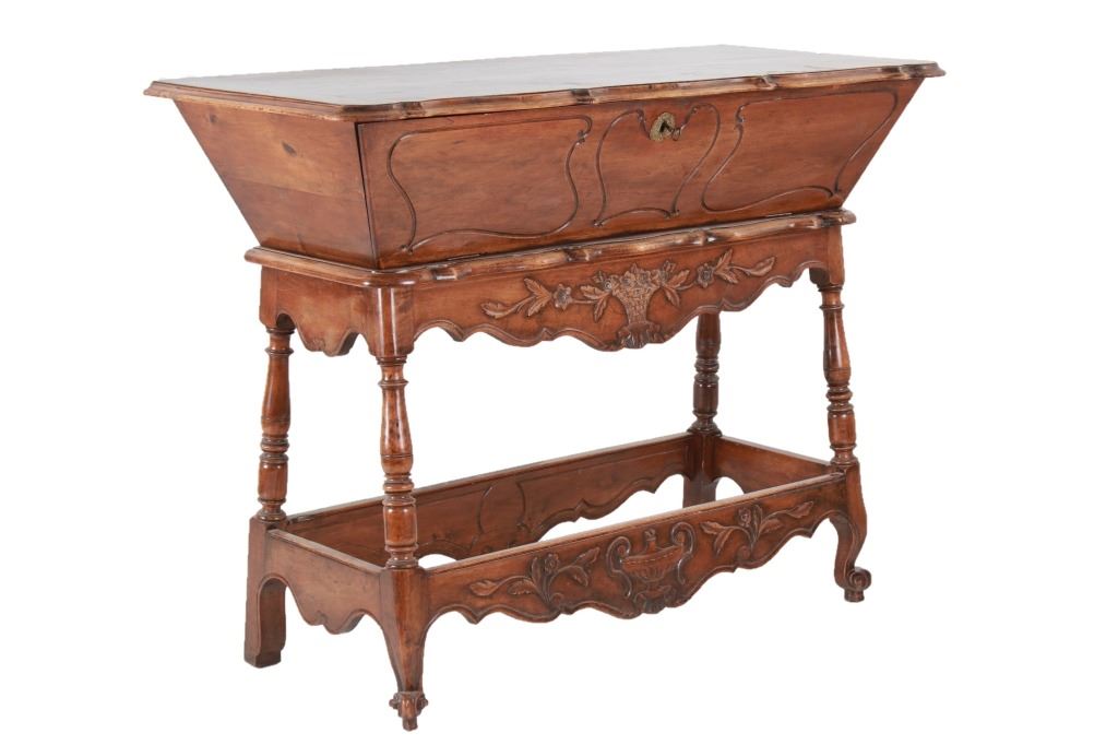 For your consideration is an 18th Century Louis XV Walnut Dough Box on Stand. The hand carved "Petrin Provençal" (French for dough or kneading trough) is a wonderful example of practicality and craftsmanship. It sits on four turned legs, the front two ending with escargot feet. The Dough Box features a shaped molded edge overhanging top with breadboard ends, above canted sides. Locking front drop down panel reveals a wonderful interior storage, period escutcheon, key included. Panel has nicely carved scroll designs. The stand features exquisite Provençal floral carvings including a basket of flowers and acanthus leaves and vines on the serpentine carved apron as well as the serpentine carved lower front and rear stretchers, side stretchers nicely serpentine carved. This beautiful Dough Box and stand are in nice preserved condition, the natural condition of the wood is visible consistent with the nature-inspired focus of the Louis XV period, general marks, splitting, nicks, scratches, and wear commensurate with age and use. Dough Box measures 23"W x 51"L x 10"H, with stand is 38.75"H. I weights 77 pounds.