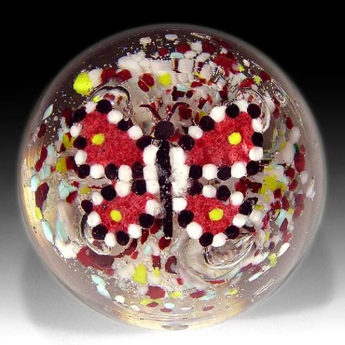 Antique miscellaneous butterfly frit paperweight, with a central butterfly, composed of four dark pink wings, each bordered with a row of alternating dark burgundy and white dots. The butterfly hovers above a multi-colored speckled ground, studded with five spaced spike-shaped bubbles, the lower ends of which extend to a white circle, near the base of the piece. Diameter 3 1/4". Minor surface wear. NO RESERVE