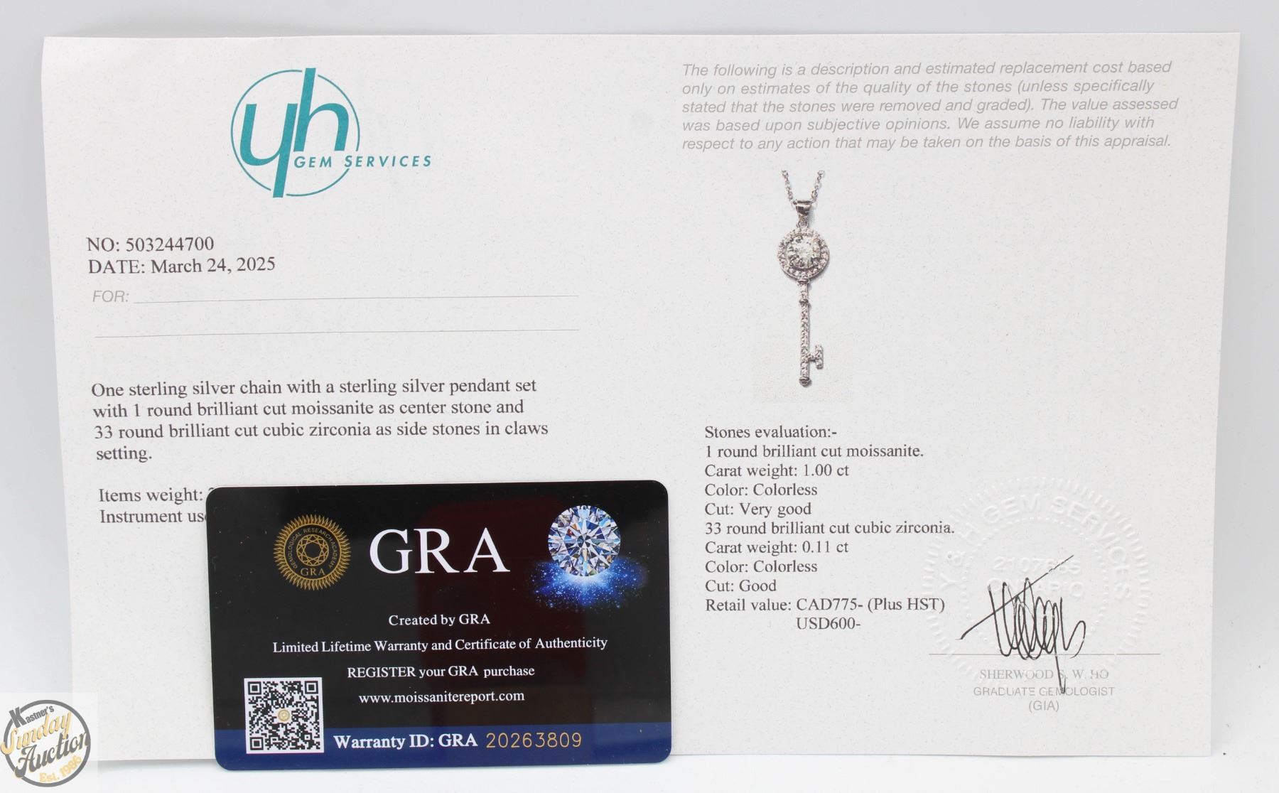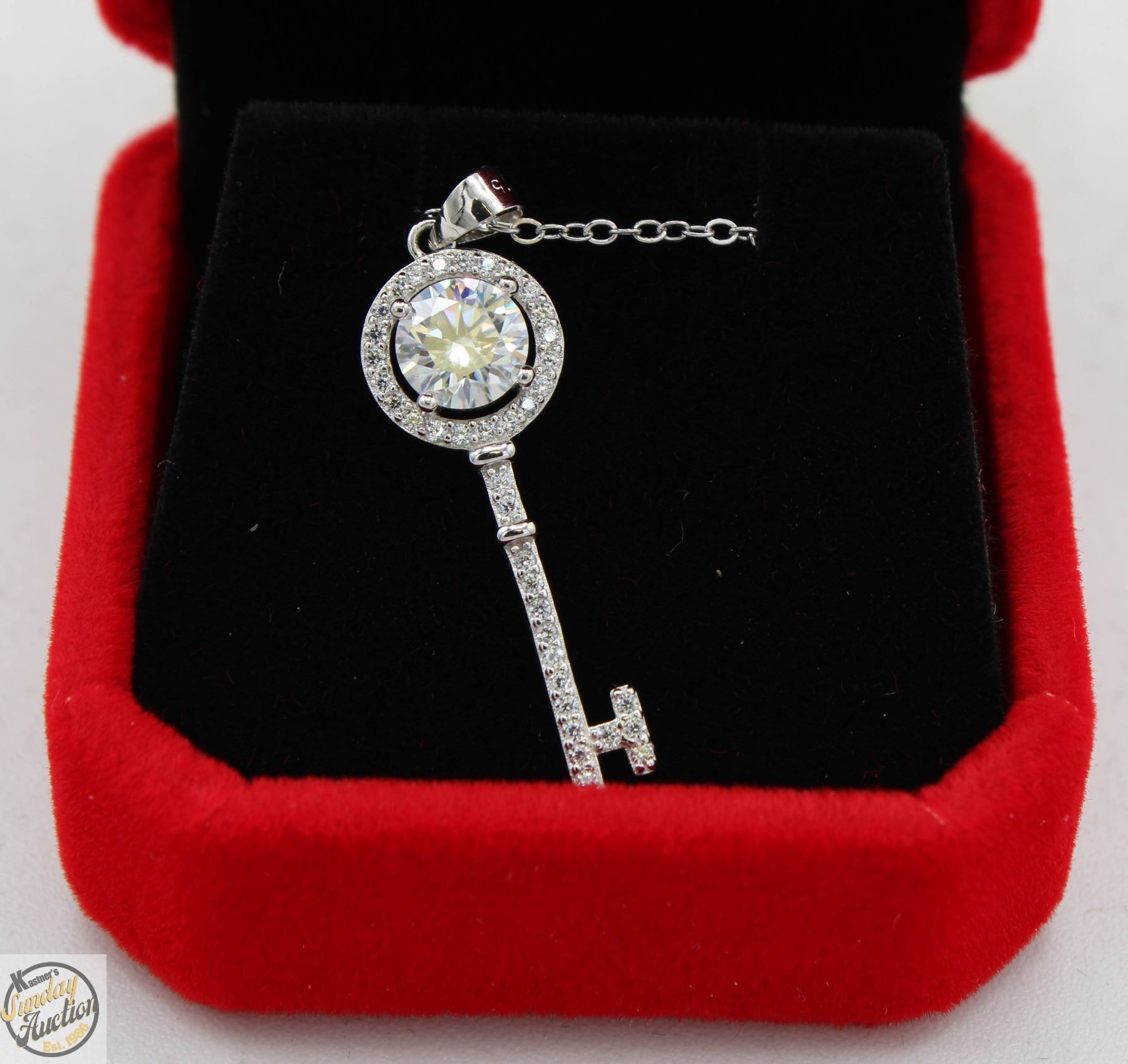 MOISSANITE STONE VVS D COLOR WITH 33 ROUND BRILLIANT CUT CUBIC ZIRCONIA SET IN ROUND HALO AND MORE IN KEY SHAPE SET IN 925 SILVER PENDANT RETAIL VALUE $775.00 **ALL ITEMS MUST BE REMOVED BY 5PM SATURDAY, JUNE 14TH 2025. ALL REMAINING ITEMS WILL BE SUBJECT TO A $6.00 PER DAY STORAGE CHARGE. ANY ITEMS REMAINING AFTER MONDAY, JUNE 30TH, 2025 WILL BE CONSIDERED FORFEITED. NO REFUNDS WILL BE ISSUED FOR FORFEITED ITEMS. TO SCHEDULE A PICK UP APPOINTMENT CLICK HERE