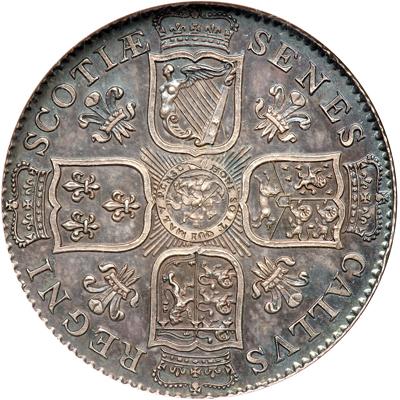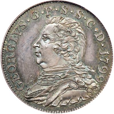 Great Britain. Pattern Shilling, 1799. Forrer-Vol II, p.170; Stainton-31b. Silver. 26 mm. Struck by Colonel Fullerton, by J. Milton - No signature. Often described as Scottish patterns. The obverse bears the bust of George, Prince of Wales, as Seneschal of Scotland. Reverse: Arms of England. Elegant blue and black toning, a really choice example. NGC graded MS-65.