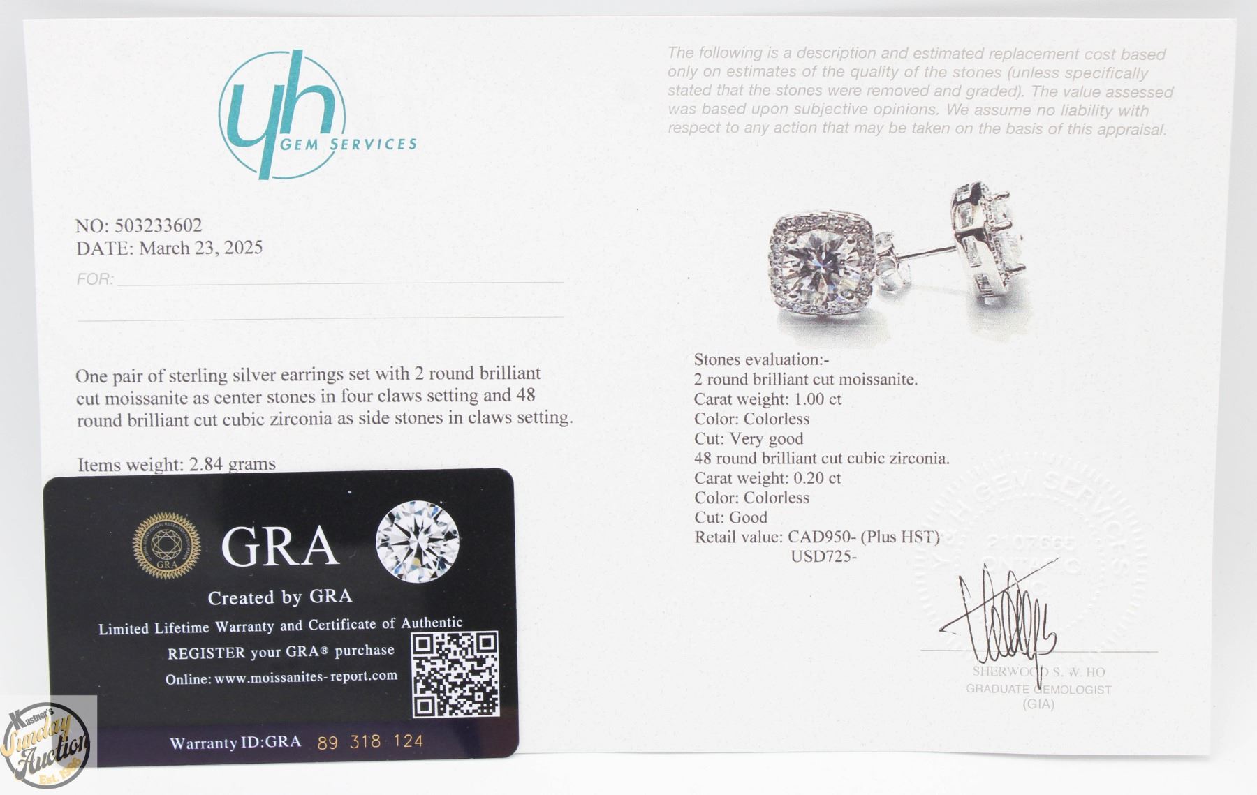 MOISSANITE STONES VVS D COLOR WITH 48 ROUND BRILLIANT CUT CUBIC ZIRCONIA SET IN SQUARE HALOS SET IN 925 SILVER EARRINGS RETAIL VALUE $950.00 **ALL ITEMS MUST BE REMOVED BY 5PM SATURDAY, JUNE 28th 2025. ALL REMAINING ITEMS WILL BE SUBJECT TO A $6.00 PER DAY STORAGE CHARGE. ANY ITEMS REMAINING AFTER MONDAY, JULY 14TH 2025 WILL BE CONSIDERED FORFEITED. NO REFUNDS WILL BE ISSUED FOR FORFEITED ITEMS. TO SCHEDULE A PICK UP APPOINTMENT CLICK HERE
