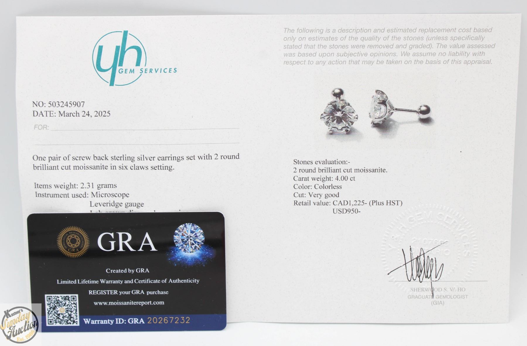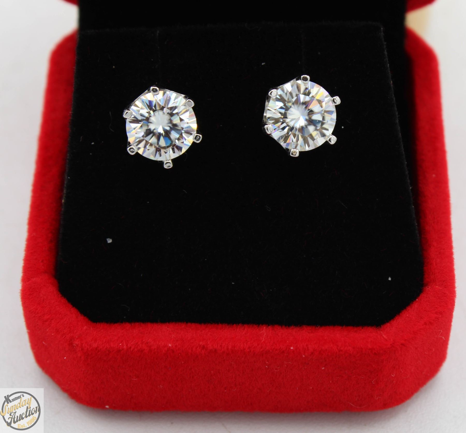 MOISSANITE STONES VVS D COLOR SET IN 6 CLAW FILAGREE HEAD SET IN 925 SILVER EARRINGS RETAIL VALUE $1,150.00 **ALL ITEMS MUST BE REMOVED BY 5PM SATURDAY, JUNE 14TH 2025. ALL REMAINING ITEMS WILL BE SUBJECT TO A $6.00 PER DAY STORAGE CHARGE. ANY ITEMS REMAINING AFTER MONDAY, JUNE 30TH, 2025 WILL BE CONSIDERED FORFEITED. NO REFUNDS WILL BE ISSUED FOR FORFEITED ITEMS. TO SCHEDULE A PICK UP APPOINTMENT CLICK HERE