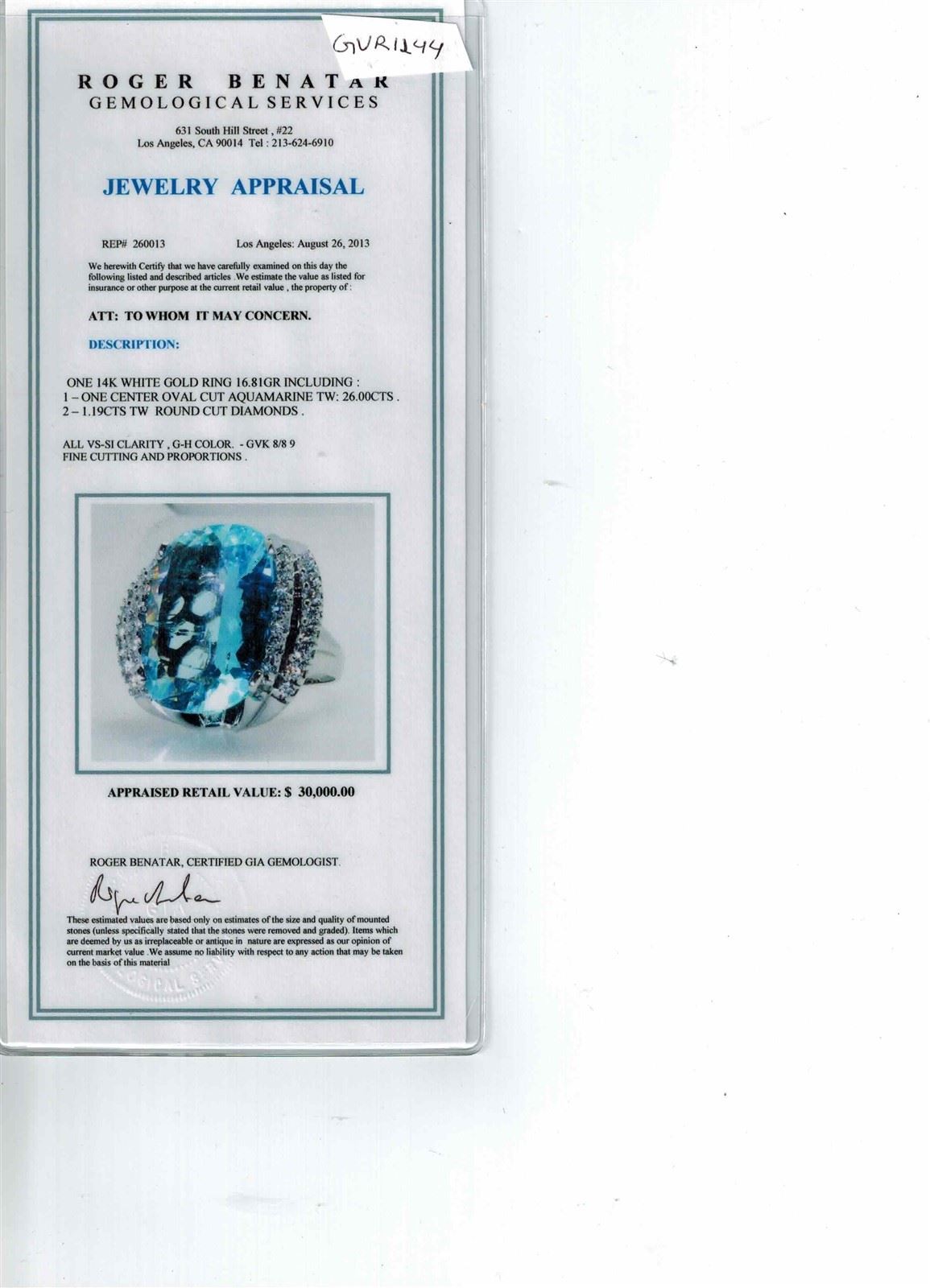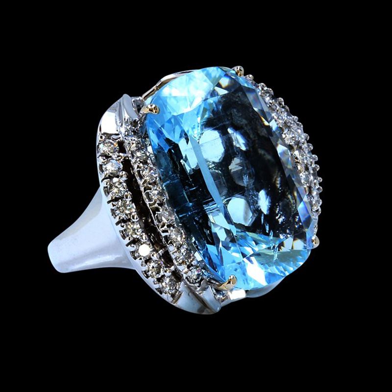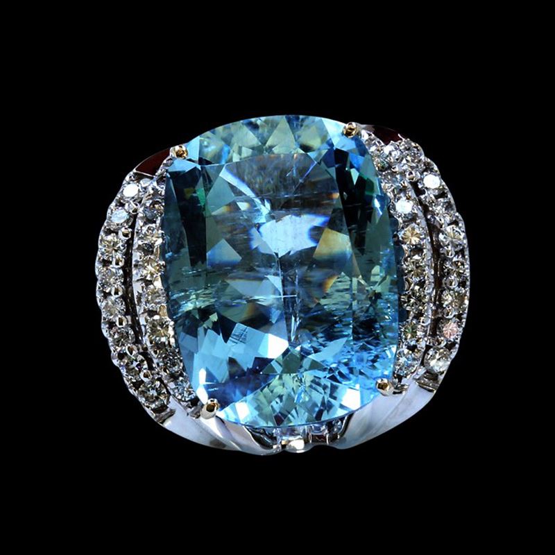 14K WHITE GOLD NATURAL AQUAMARINE RING:16.81GRAM /AQUAMARINE: 26CT/ DIAMOND: 1.19CT/#GVR1244 **Warmly crafted in 14kt white gold, this magnificent ring features a gleaming blue 26.00 ct Oval Cut Aquamarine center stone, known to lend the courage and clarity to express one's inner knowing, enhancing intuitive abilities. Flanked with inlaid 1.19ct round cut Diamonds, and textured detailing, a touch of subtle sparkle adds to its richness and depth. this cocktail ring is an investment piece and a secure life long purchase.**