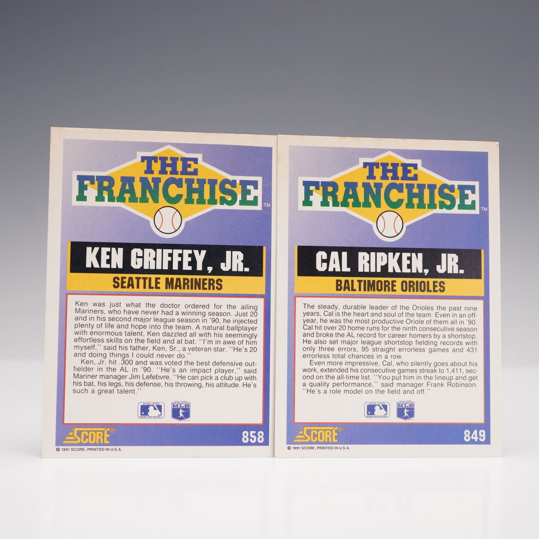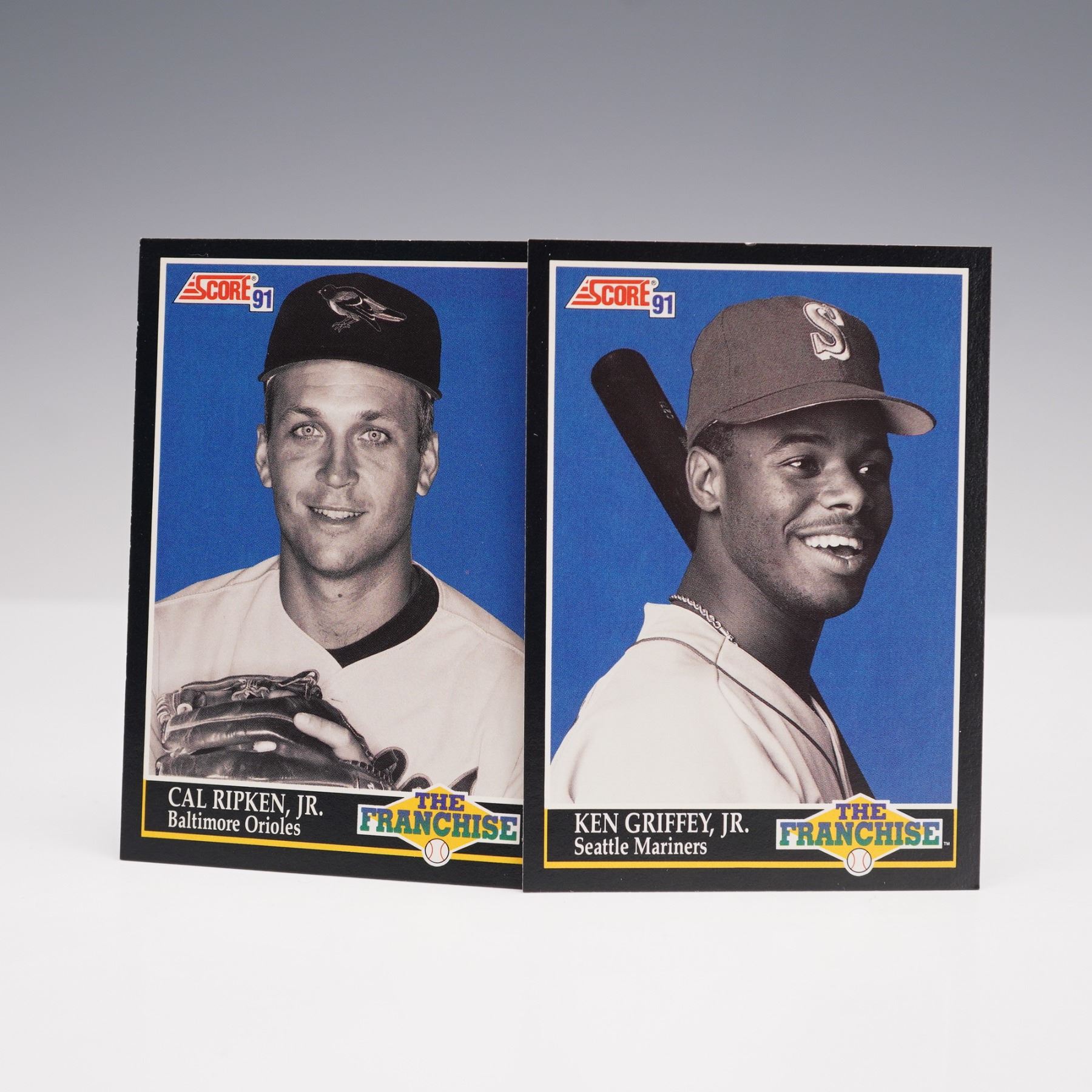 A collection of twenty six baseball trading cards issued by Score in 1991 as part of "The Franchise" subset, prominently featuring the celebrated athletes Carl Ripken Jr from Baltimore Orioles, Sandy Alomar, Jr. from Cleveland Indians, Roger Clemens from Boston Red Sox, Rickey Henderson from Oakland Athletics, Don Mattingly from New York Yankees, Alan Trammell from Detroit Tigers, George Brett from Kansas City Royals, Kirby Puckett from Minnesota Twins, Robin Yount from Milwaukee Brewers, Ruben Sierra from Texas Rangers, John Olerud, from Toronto Blue Jays, Benny Santiago from San Diego Padres, Lenny Dykstra from Philadelphia Phillies, Todd Zeile from St. Louis Cardinals, Wally Joyner from California Angels, Frank Thomas from Chicago White Sox, Will Clark from San Francisco Giants, Craig Biggio from Houston Astros, Barry Bonds from Pittsburgh Pirates, Darryl Strawberry from Los Angeles Dodgers, Tim Wallach from Montreal Expos, Doc Gooden from New York Mets, Dave Justice from Atlanta Braves, Ryne Sandberg from Chicago Cubs, Ken Griffey Jr, from Seattle Mariners, and Eric Davis from Cincinnati Reds. Each card displays a black-and-white portrait accented by a bold blue background with the distinctive franchise insignia, while the reverse provides detailed biographical text, statistical highlights, and career accolades underscoring each player's significance within Major League Baseball.