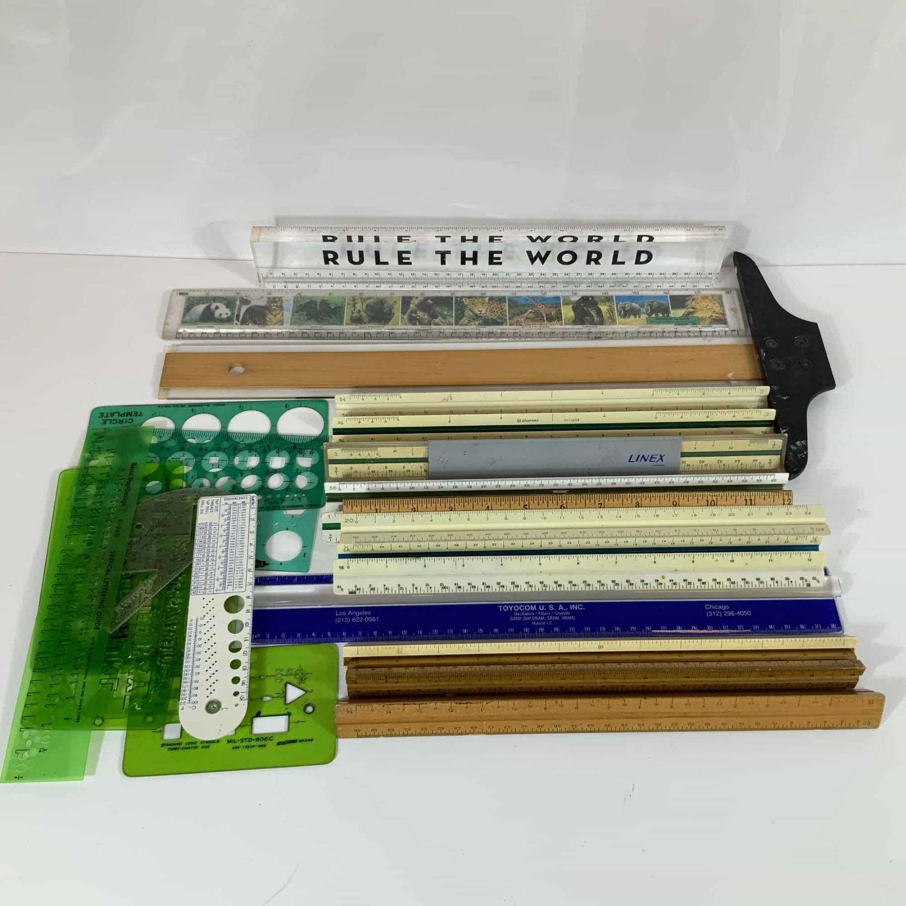 This collection features 26 drafting and engineering instruments from various manufacturers including Dietzgen, Charvoz, Linex, Pickett, Rapi-Design, Staedtler, Bernade, and Tamura. The grouping includes a T-square with a wooden blade and a black composite head, alongside an assortment of triangular scale rulers in plastic and wood laminate finishes. These rulers include architectural and engineering scales with various graduations. The set contains several green plastic templates, including a large circle template, a vertical lettering guide, French curves, and a Pickett Standard Logic Symbols template marked MIL-STD-806C. Additional items include a metal drill gage with tap and drill equivalents, a blue plastic promotional ruler for Toyocom U.S.A., Inc., and novelty clear plastic rulers featuring animal motifs and the text Rule The World in bold black lettering. Construction methods include molded plastic, laminated wood, and machined metal. Visible markings include Dietzgen Made in USA, Charvoz, Linex, and Pickett.