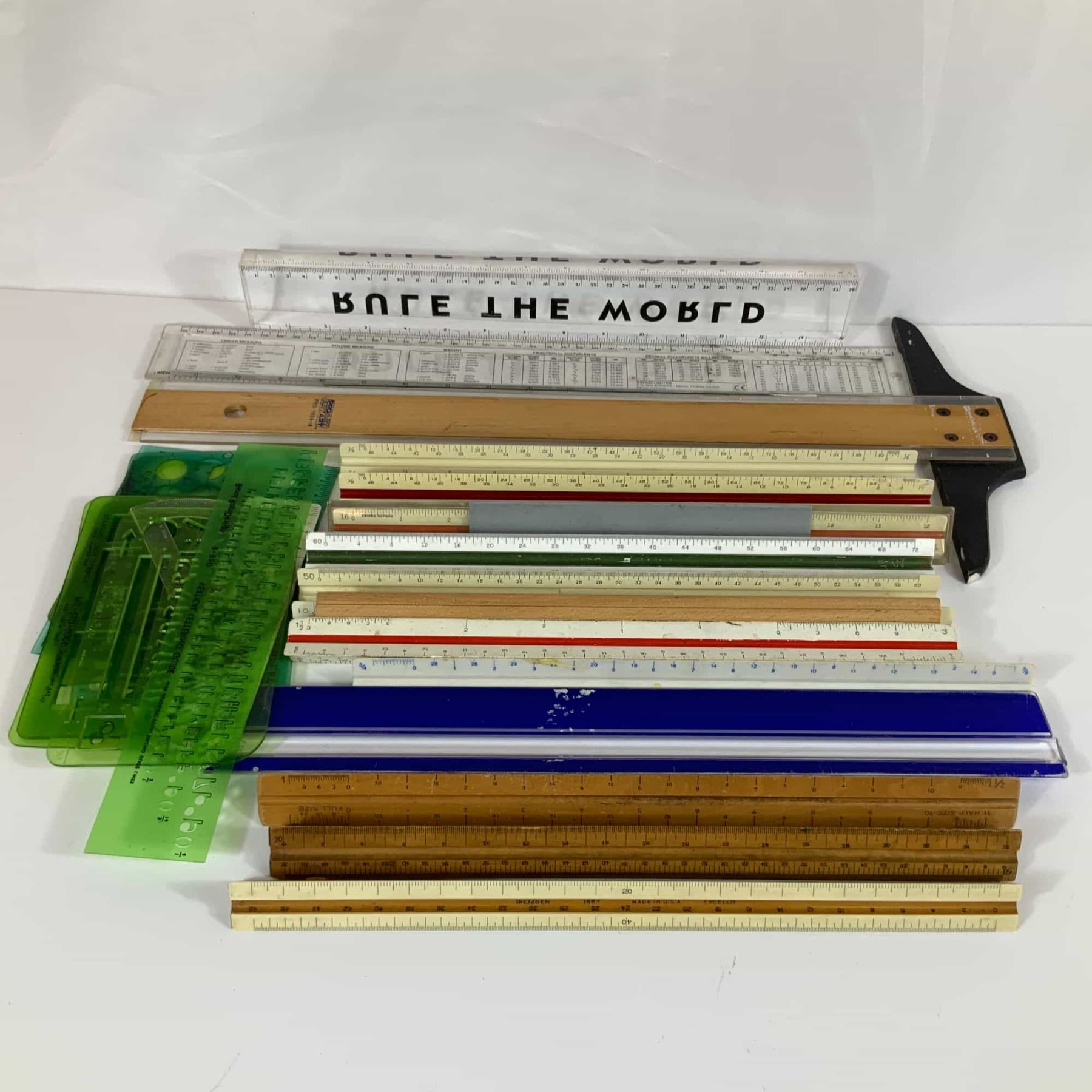 Measurement: Scale rulers and novelty ruler measure 12 inches; T-square is the largest item.