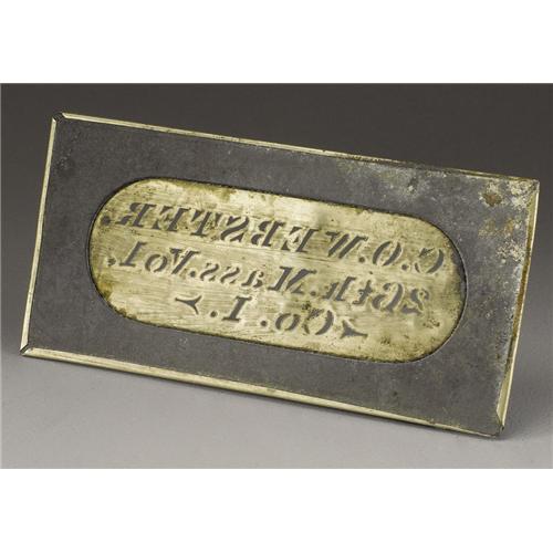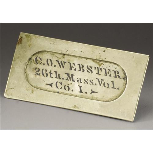 <B>26th Massachusetts Volunteer Infantry Soldier's Stencil.</B></I> 2.75” x 1.25”, metal, in fine condition. This personalized stencil is marked “C. O. Webster / 26th. Mass. Vol. / Co. I.” Webster, a resident of Methuen, Massachusetts, and shoemaker by trade, enlisted in the Union army on September 20, 1861 and mustered out on October 17, 1864. Stencils such as these were likely intended for marking correspondence.<BR><BR><b>Shipping:</b> Miscellaneous Collectibles, Smal (<a target="_blank" href="http://www.heritageauctions.com/common/shipping.php">view shipping information</a>)