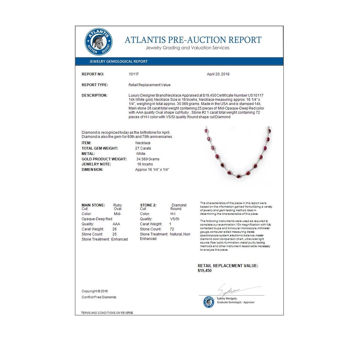 REF-252M9H -10117 ---- 27.0 CTW Ruby & Diamond Necklace 14K White Gold ---- Luxury Designer Brand Necklace Appraised at $19,450 Certificate Number US10117 14k White gold, Necklace Size is 16 Incehs, Necklace measuring approx. 16 1/4" x 1/4", weighing in total approx. 30.069 grams. Made in the USA and is stamped 14k, Main stone 26 carat total weight containing 25 pieces of Mid-Opaque-Deep Red color with AAA quality Oval shape cut Ruby , Stone #2 1 carat total weight containing 72 pieces of H-I color with VS/SI quality Round shape cut Diamond