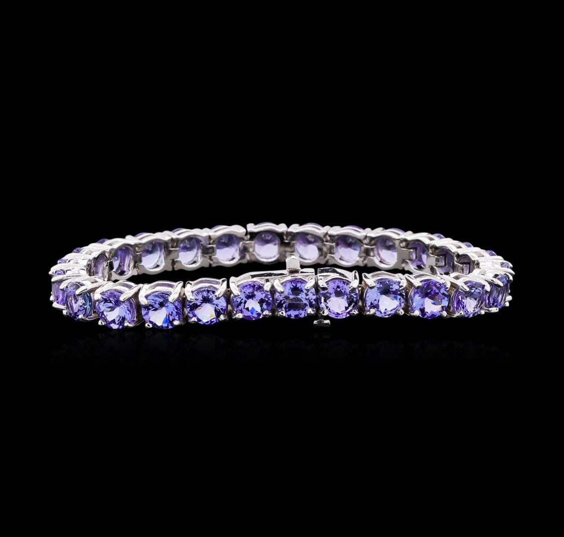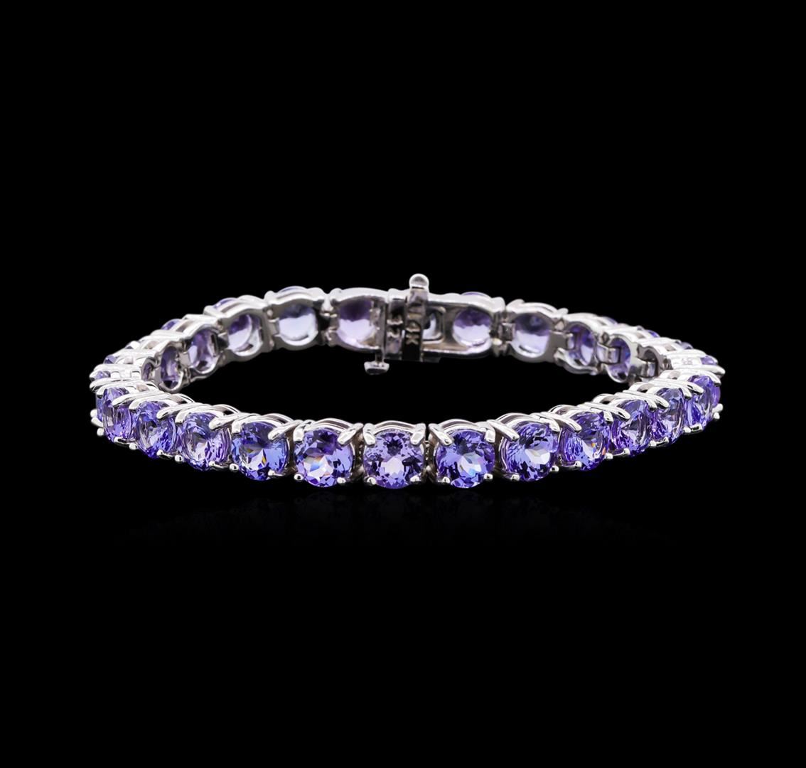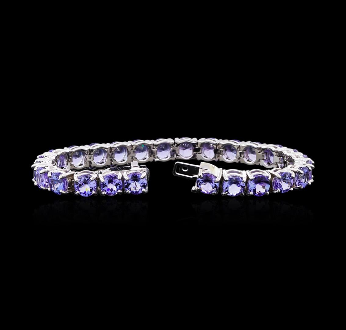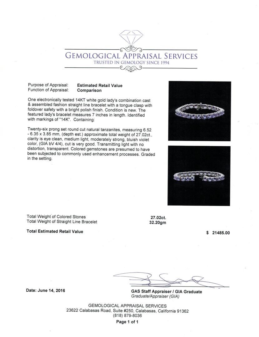 One electronically tested 14KT white gold lady's combination cast & assembled fashion straight line bracelet with a tongue clasp with foldover safety with a bright polish finish. The featured lady's bracelet measures 7 inches in length. Identified with markings of "14K". Condition is new. Containing: Twenty-six prong set round cut natural tanzanites, measuring 6.52 - 6.35 x 3.85 mm, (depth est.) approximate total weight of 27.02ct., clarity is eye clean, medium light, moderately strong, bluish violet color, (GIA bV 4/4), cut is very good. Transmitting light with no distortion, transparent. Colored gemstones are presumed to have been subjected to commonly used enhancement processes. Graded in the setting. Total Weight of Colored Stones 27.02ct. Total Weight of Straight Line Bracelet 32.20gm. GAS Appraised at $21,485.00.
