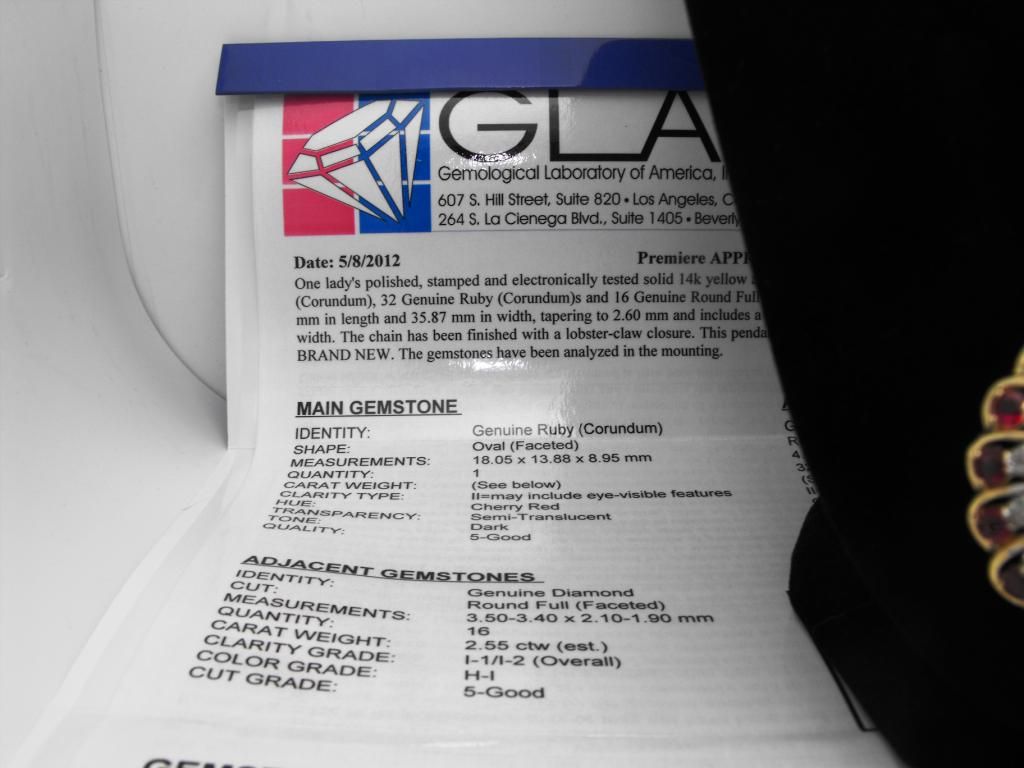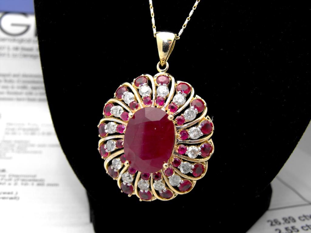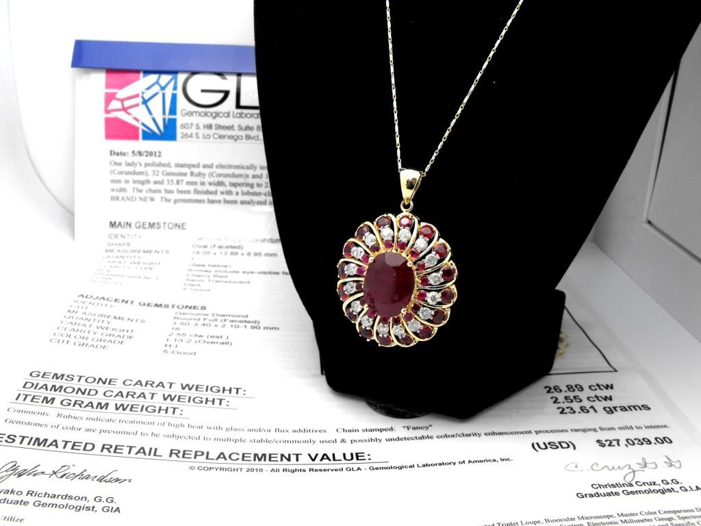 A fabulous 14k YG pendant set with 26.89 tcw ruby gemstones and accented with 2.55 tcw diamonds.