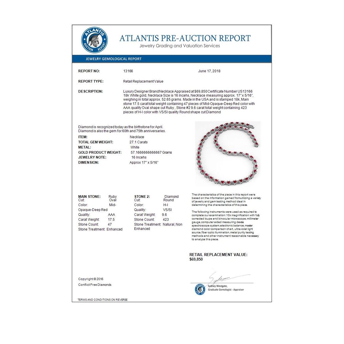 REF-976N8Y -13166 ---- 27.10 CTW Ruby & Diamond Necklace 18K White Gold ---- Luxury Designer Brand Necklace Appraised at $69,850 Certificate Number US13166 18k White gold, Necklace Size is 16 Incehs, Necklace measuring approx. 17" x 5/16", weighing in total approx. 52.65 grams. Made in the USA and is stamped 18k, Main stone 17.5 carat total weight containing 47 pieces of Mid-Opaque-Deep Red color with AAA quality Oval shape cut Ruby , Stone #2 9.6 carat total weight containing 423 pieces of H-I color with VS/SI quality Round shape cut Diamond